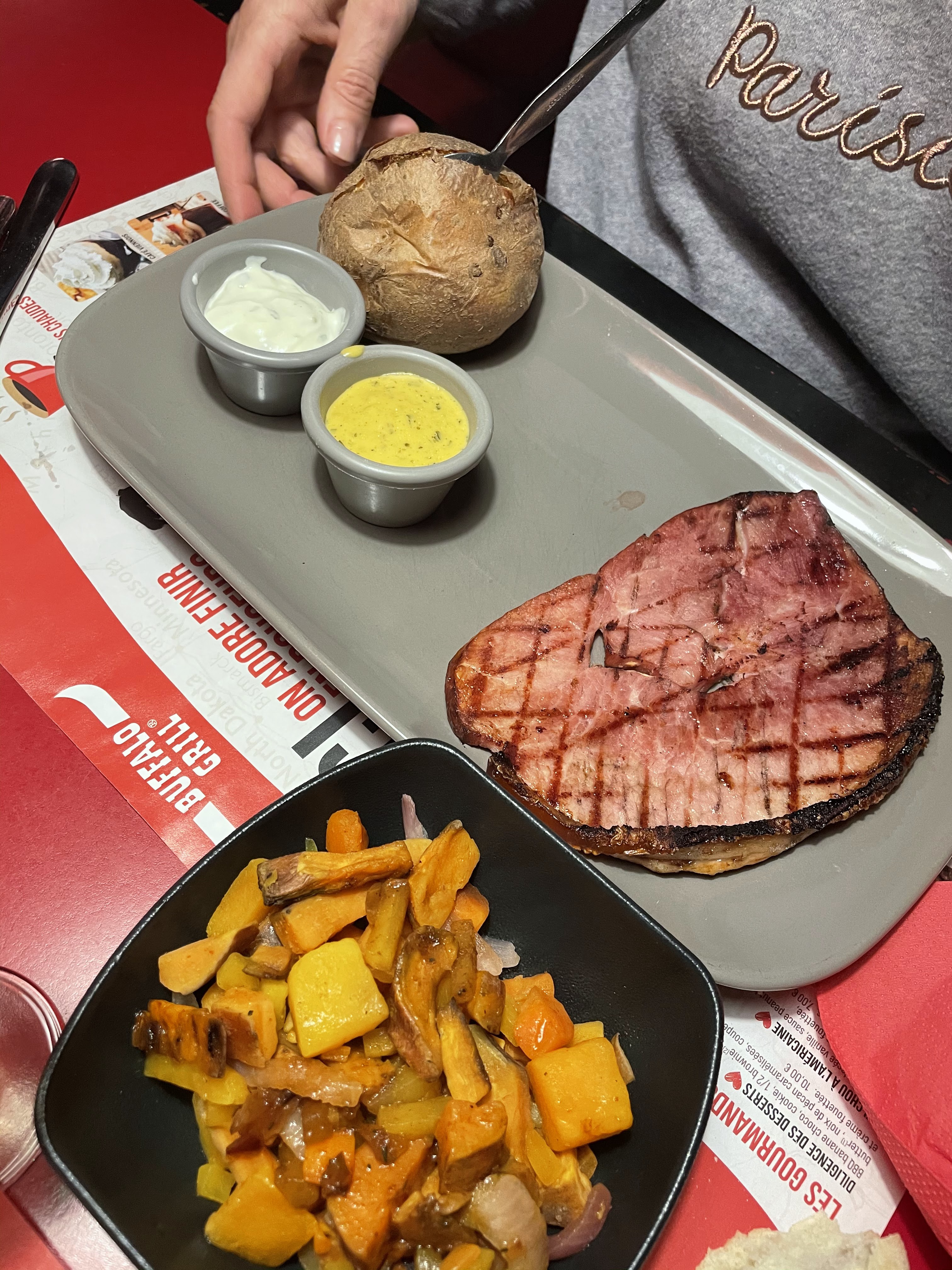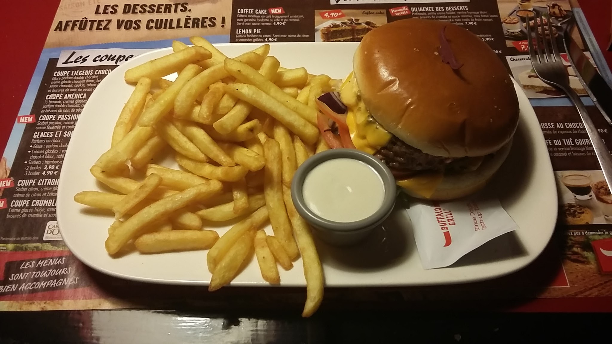 Le Buffalo reste le Buffalo de notre enfance ambiance familiale décontracté sur le thème des cow-boys Bien installés en salle avec les séparations entre les tables et à l’extérieur c’est très agréable La carte est souvent retravaillée La petite salade d’arrivée avec leur petits pains tout chauds un délice ! On peut choisir nos accompagnements ! Il y en a donc pour tous les goûts ! Les parts sont généreuses