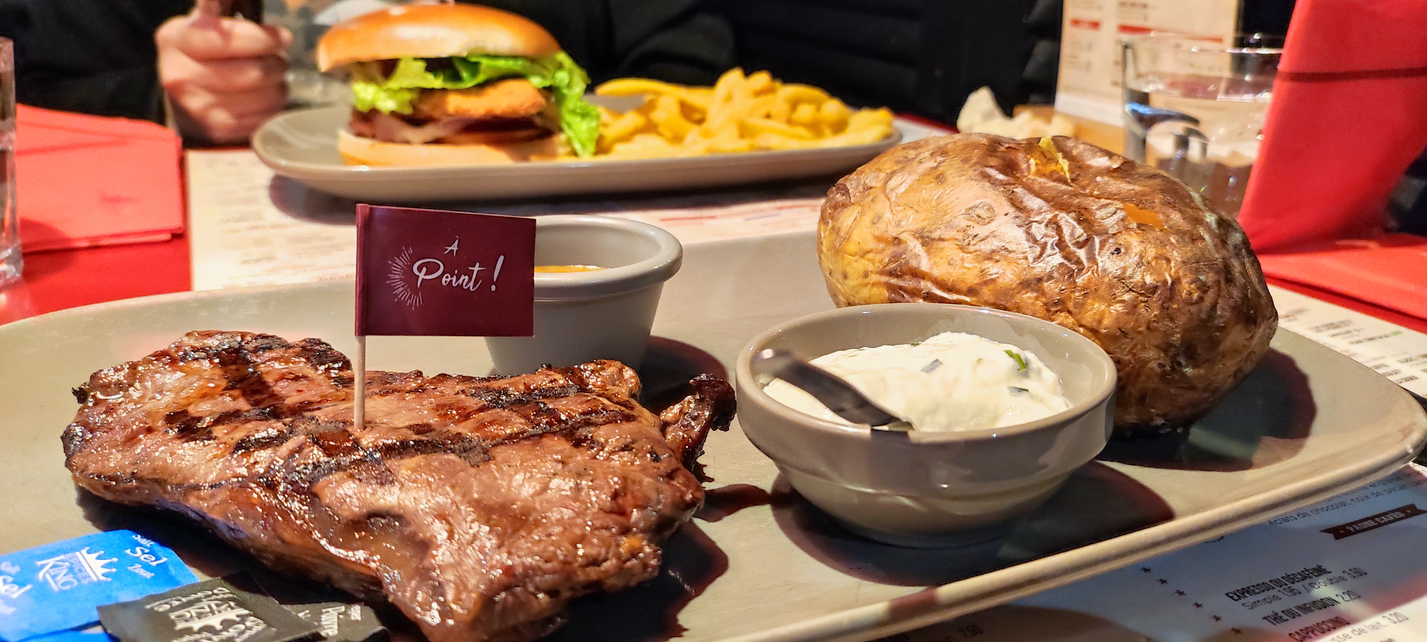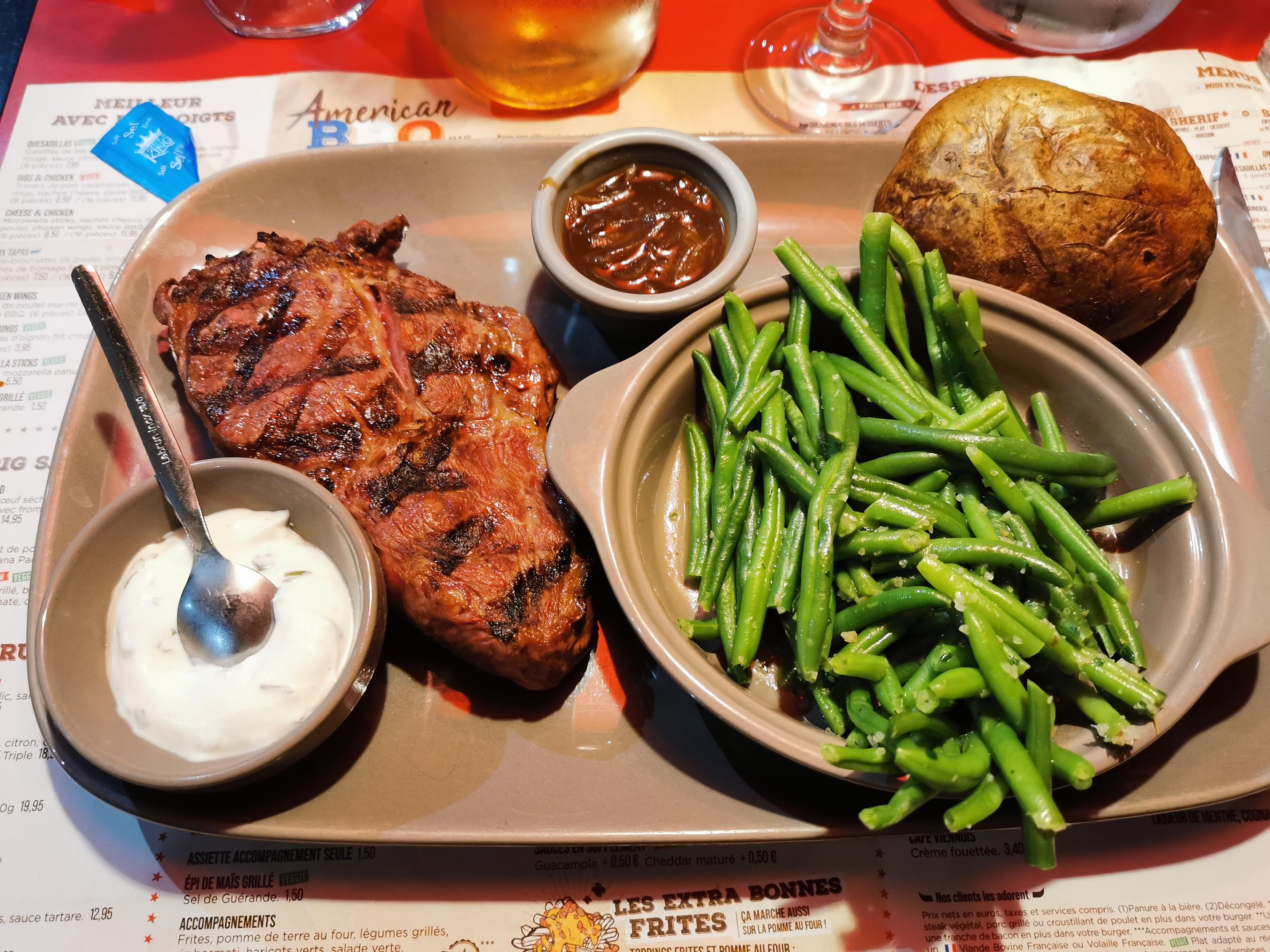 Vous voulez manger demain viande ? C'est ici !! Viandes selon leur carte françaises en général. Un restaurant à l'ambiance far west, une déco rouge bordeaux, lustre en métal au dessus de chaque table qui ont pour la plupart des banquettes. Un menu enfants est proposé et bien complet au prix d'un happy me_l ! Plusieurs plats de proposé toujours avec une petite note western et d'autre carrément dans le thème ! Le service est fait avec la gaité et n'est pas forcément rapide mais quoi qu'il en soit non gênant puisque moment familial et détente.