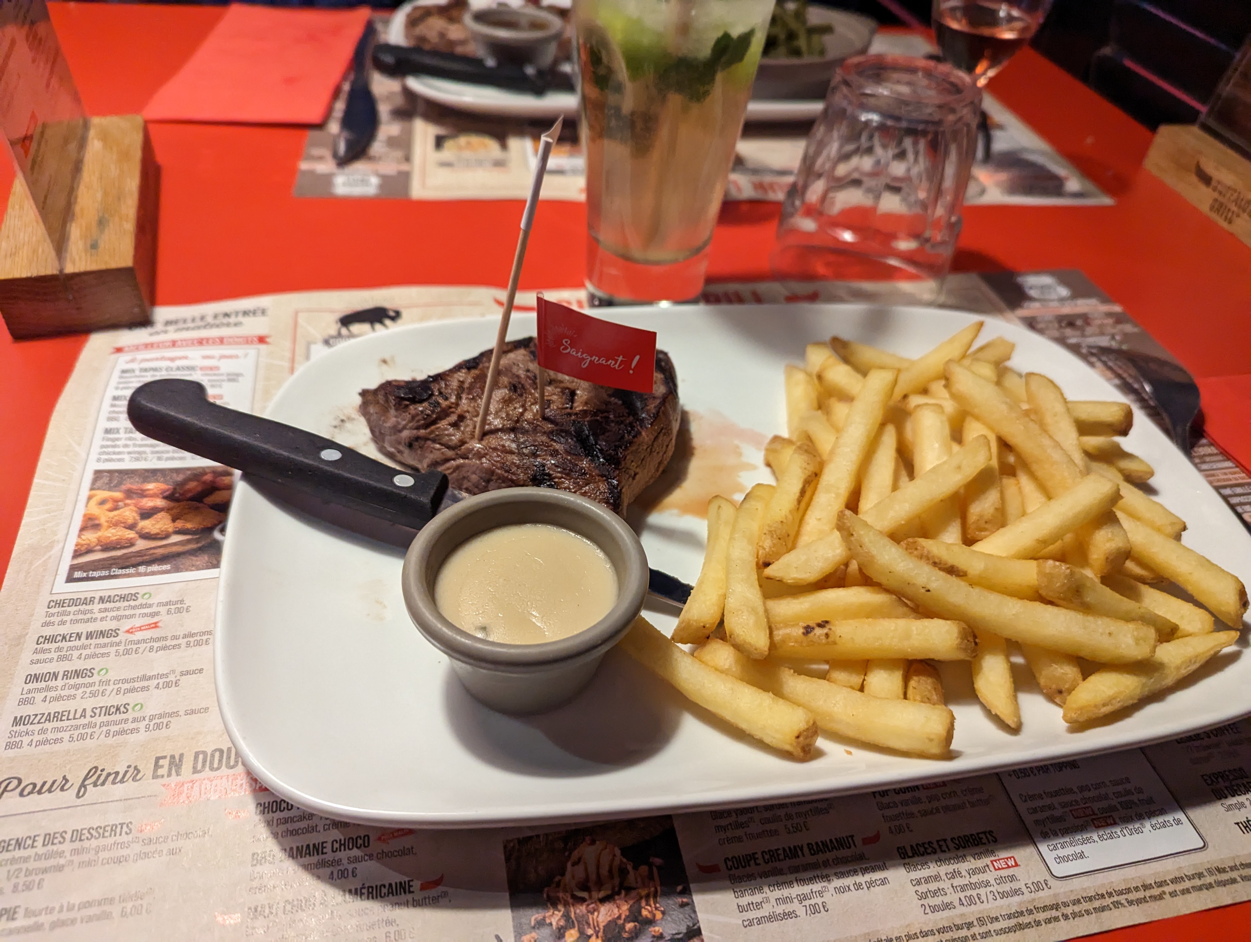 Une entrecôte hyper nerveuse incoupable même avec couteau denté, viande dure, cuisson saignante alors que j'avais demandé à point. Sur le menu c'était précisé tendre et fondante! Alors la le flop complet. J'ai été très déçu 😞 sachant que je suis un habitué de la chaîne depuis plusieurs années. J'ai noté sur les 10 dernières fois une réelle baisse de qualité...
