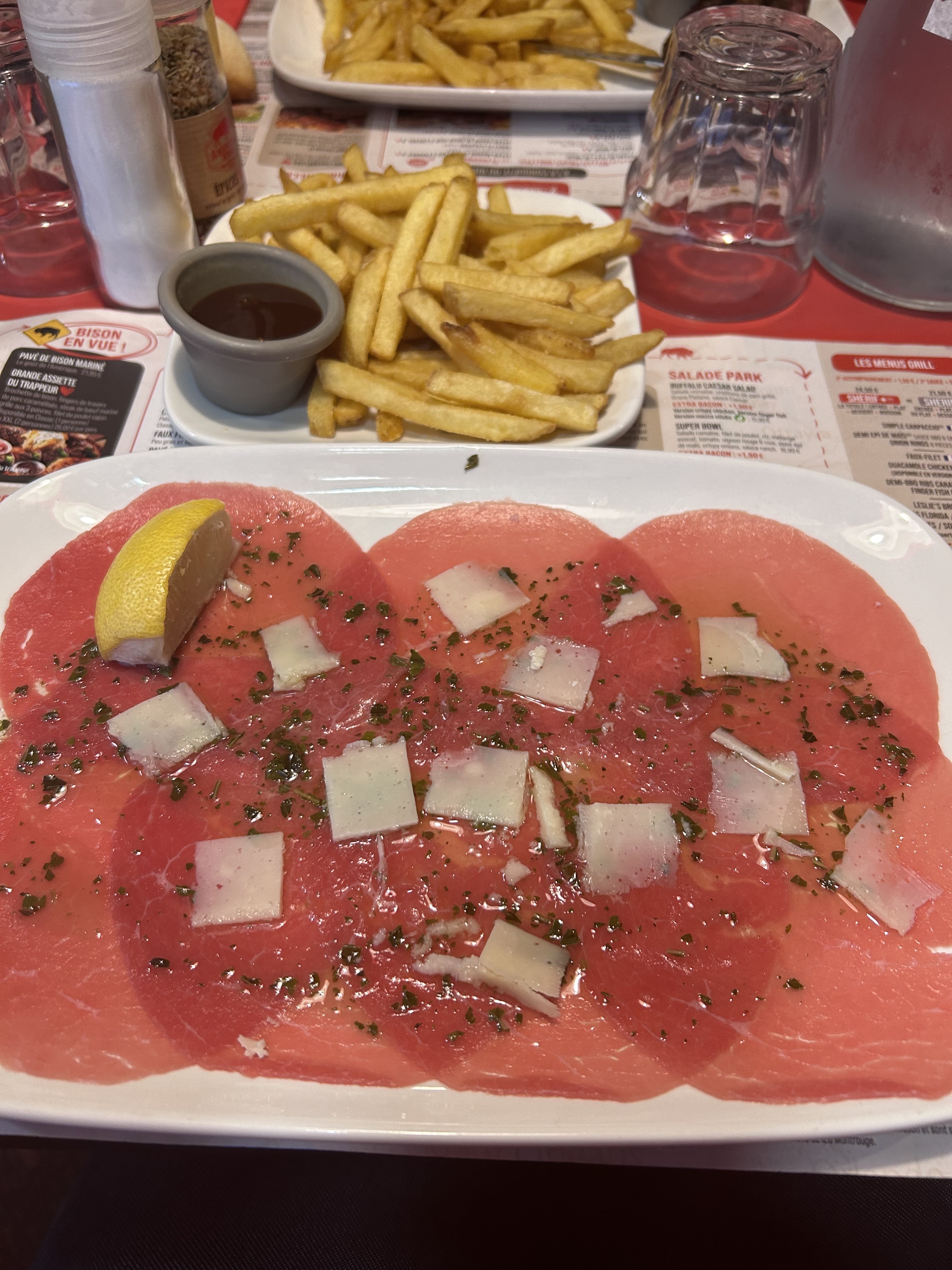 Décoration plat absente. Une feuille de salade suffirait a rendre l'assiette qui contient le pavé de bison à 21 euros moins misérable. Si vous aller aux toilettes a l'étage, il y a des problèmes d'éclairage entre autres. Apparemment quelques ampoules à remplacer et un luminaire à remettre en place. Vu aussi bas de porte intérieure des toilettes très sales. Cuvette des toilettes à remplacer aussi 😂. Dommage pour l'image de marque du groupe Buffalo.
