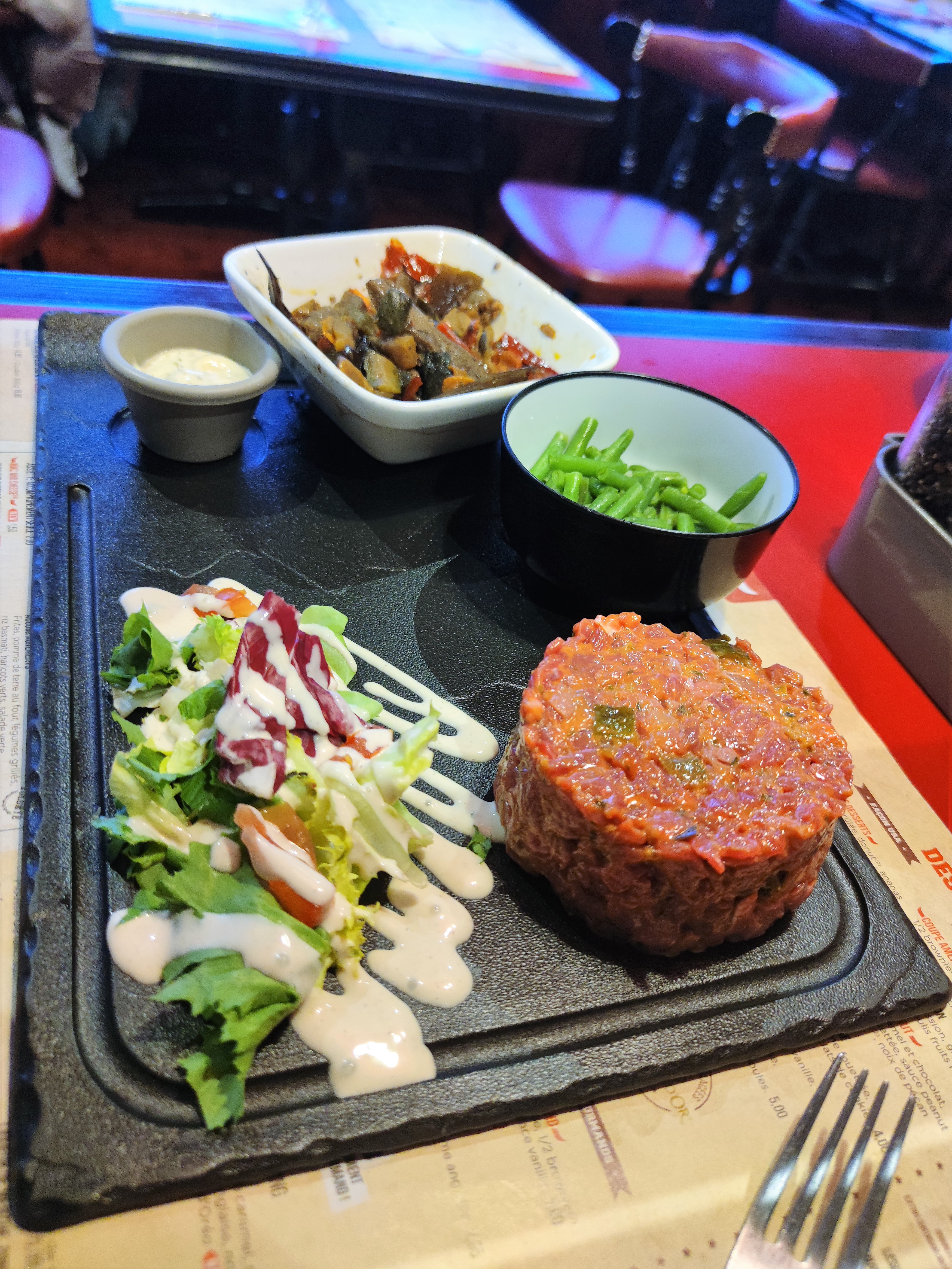 J'ai commandé un steak tartare, j'ai galeré pour avoir les sauces pour l'assaisonner et quand on me l'amène en plus d'être crade, il y avait huile, moutarde vide, vinaigre, sauce piquante, sauce Worcestershire et du sel de celeri, bref on est loin du far west enfin pas pour tout au niveau de l'hygiène les conditions sont respectées c'est comme chez les cow boys à la dure