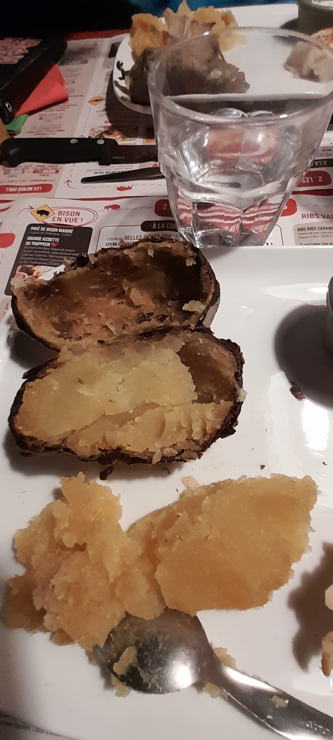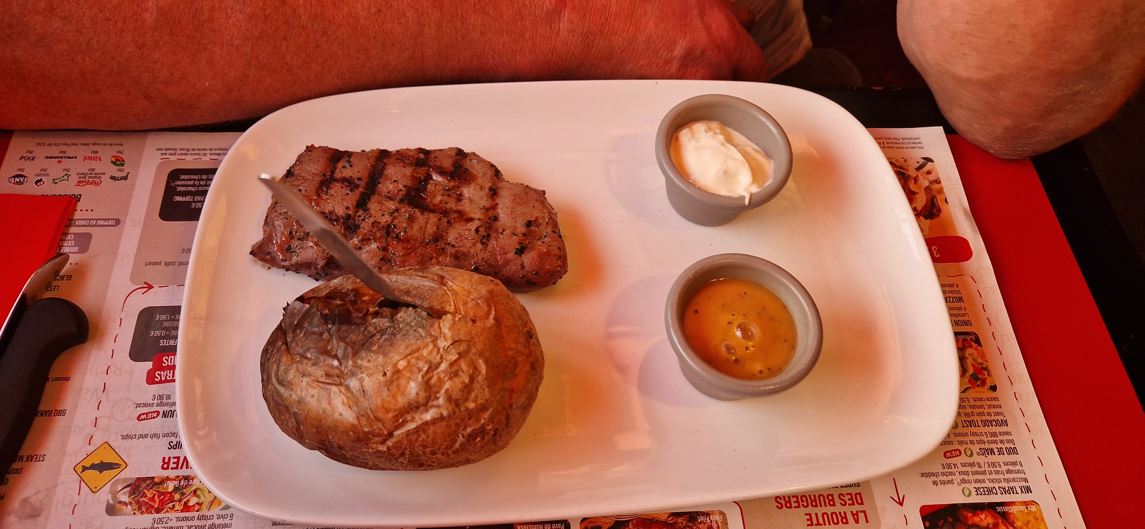 Bonjour, Nous sommes venus sans réservation avec un temps d'attente estimé à 30 minutes et qui a durée que 15 minutes, donc parfait pour nous. La jeune femme a été tres réactive et correct ( je présume que c'était la responsable), car très professionnelle. Parcontre tout les autres serveurs vous passe à côté sans aucune formule de politesse c'est incroyable!!! D'autres clients tout comme nous n'ont pas dutout apprécier cela. - Le service attente parfait au vue du monde présent ce soir là dans le restaurant. - Nos pommes au four beaucoup trop cuite et surcuite , je transmets les photos. - Dommage car l'impolitesse des serveurs et les pommes au four beaucoup trop cuite descende la note grandement. Ont ne vous ressert pas non plus de pain si vous ne demandez pas et que votre panière est vide , ont vous l'enlève directement sans rien dire ( très curieux comme concept car en plus ont vous donne juste un mini pain par personne , peut etre dut au gaspillage mais rien n'empêche d'être professionnel et de demander aux clients cest la moindre des choses quand meme ) et pour l'eau c'est pareil une fois vide , rien . Sinon les toilettes sont plutôt correct. Menu à partir de 9,99 euros . Nombreux choix et menu enfants dont gâteaux d'anniversaire .