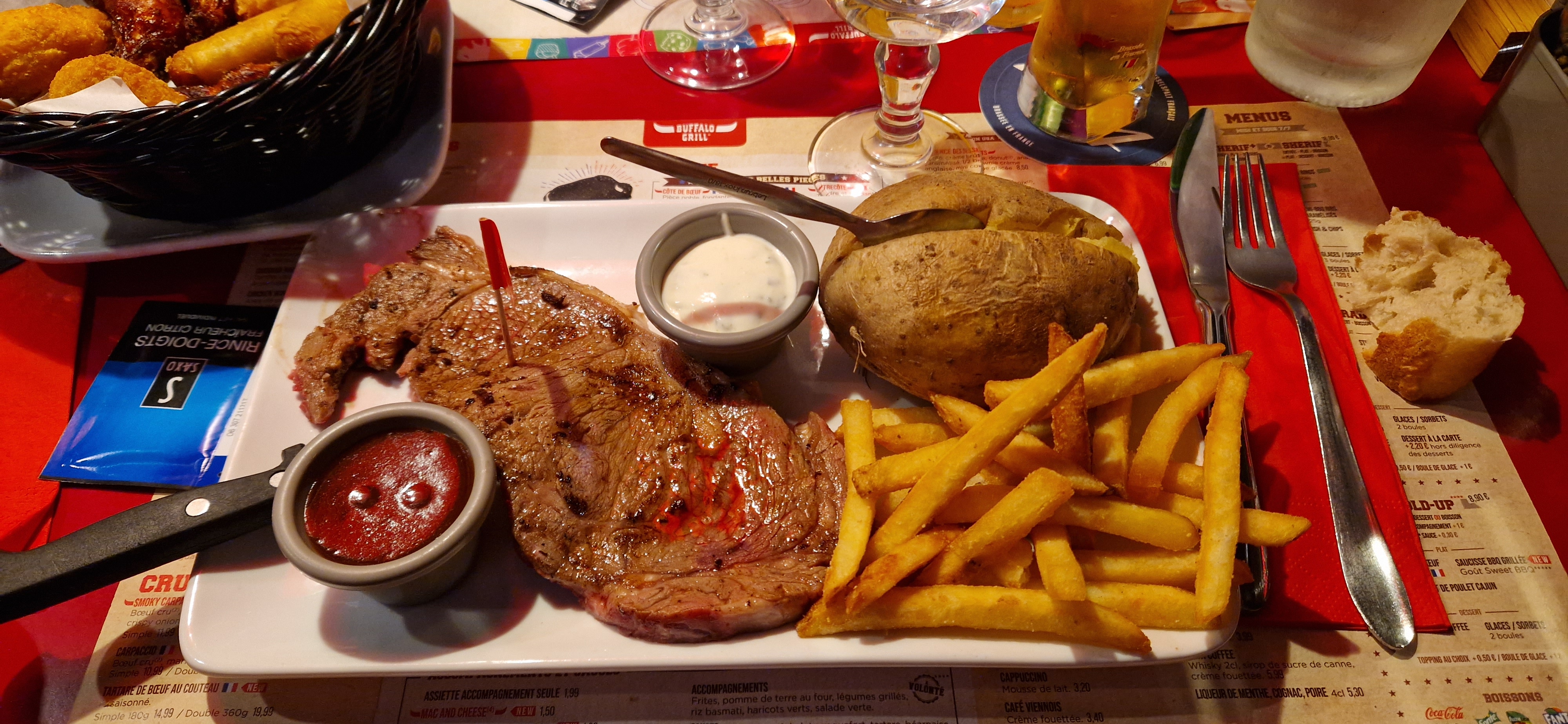 Accueil et personnel sympas. Viande dure et pas top par rapport à ce qu'était le Buffalo il y a quelques années. C'est la 2ème fois on nous y allons en famille sur 2022 et 2023, et nous sommes tous de plus en plus déçus par la qualité des produits. Parlons des quantités !!! 😡 Oui, à la carte, nous avons les frites à volonté mais forcément, on en redemande quand notre plat arrive avec une dizaine de frites qui se battent en duel... mettez des assiettes plus petites, ça fera bien moins ridicule quand vos serveurs et serveuses nous apportent les plats, car on a envie de pleurer. Par contre, très bonne ambiance côté service.