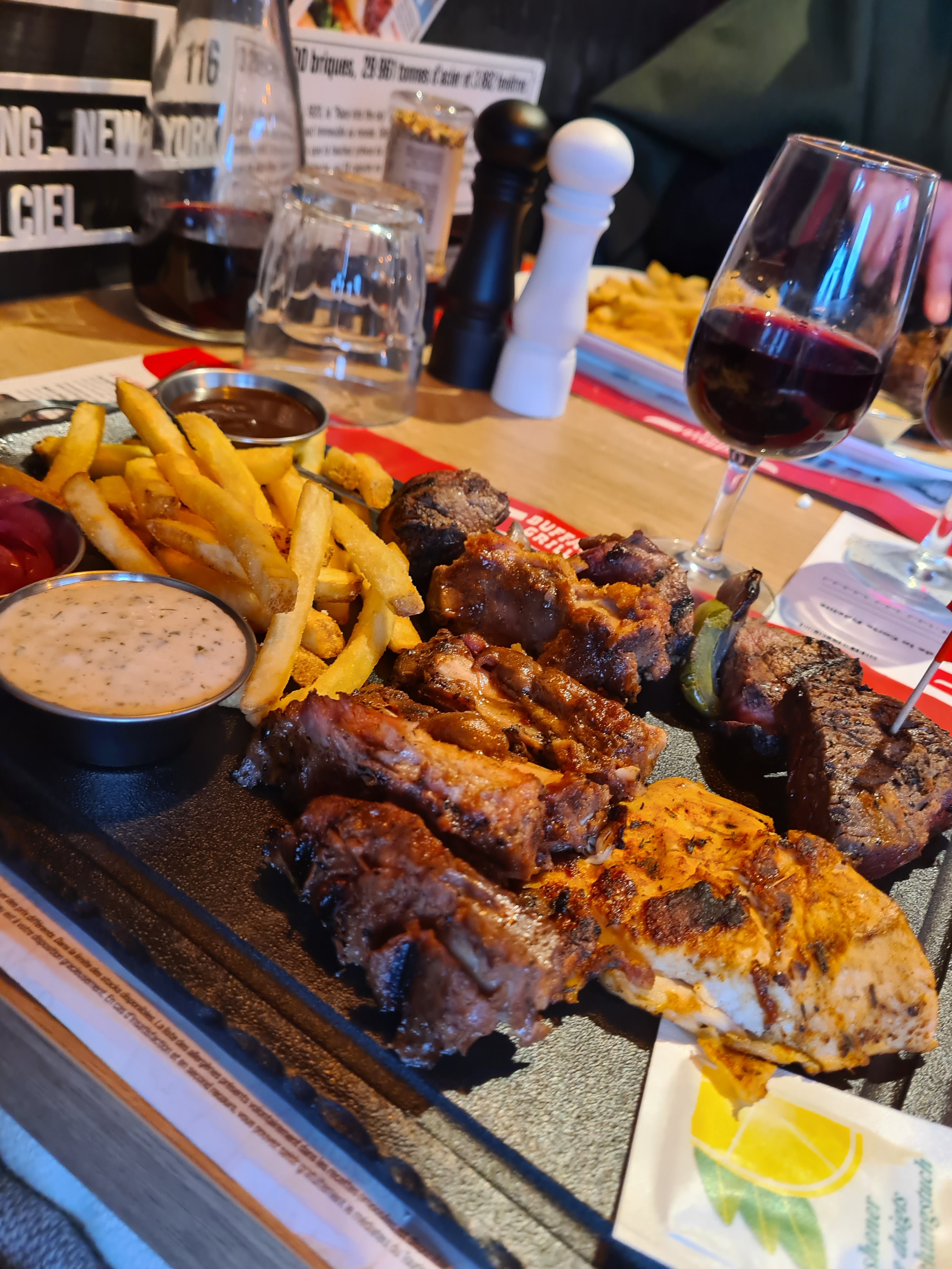 Cuisine comme un Buffalo, pour ouf mais c’était bon. Ambiance RAS. Et le service impeccable, il n’y avait plus de côté de bœuf, la serveuse c’est excusé au moins 10 fois tellement elle était désolée (on en a même rigolé). L’équipe est souriant et accueillant. On a passé un bon moment.