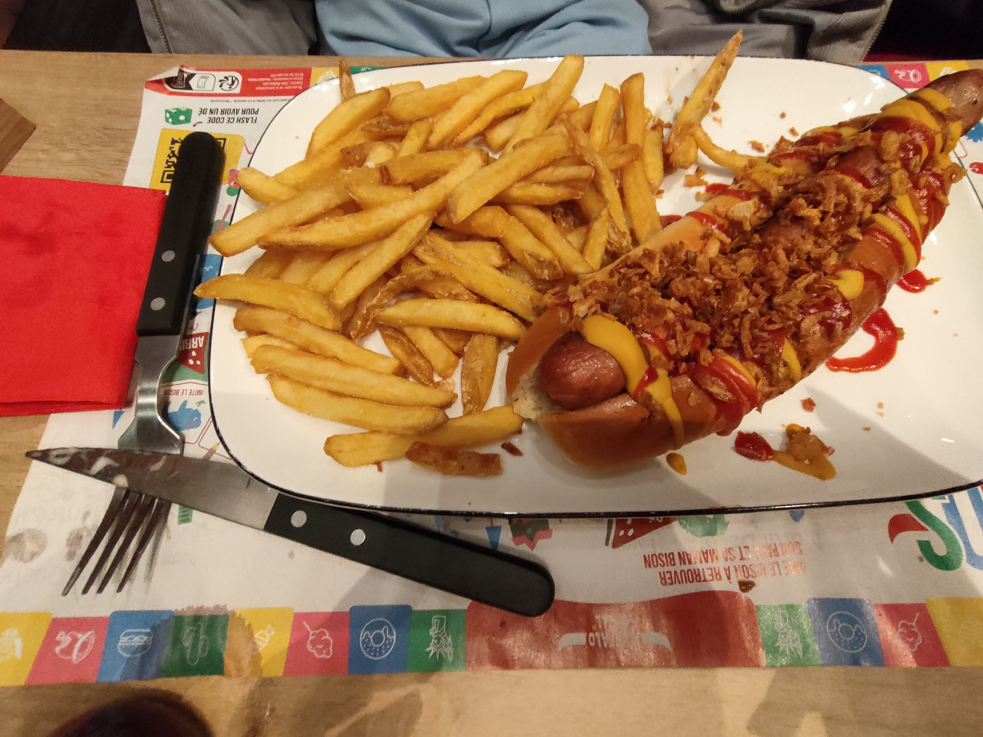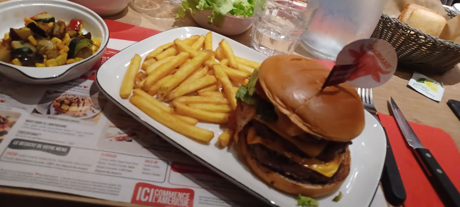 On s’est absenté aux toilettes deux min car mon fils avait besoin d’y aller , on retourne à notre table et il n’avait plus ses frites et son reste de burger était posé sur la table . Sachant que je n’avais même pas commencé mon repas … ah et les deux personnes qui sont arrivés 1h après nous ont été servis avant moi . Je suis consciente qu’avec du monde c’est difficile à gérer mais là c’est franchement abusé. Heureusement que nous sommes tombés sur un serveur hyper gentil qui nous a servi aussitôt . Merci à lui c’était vraiment top