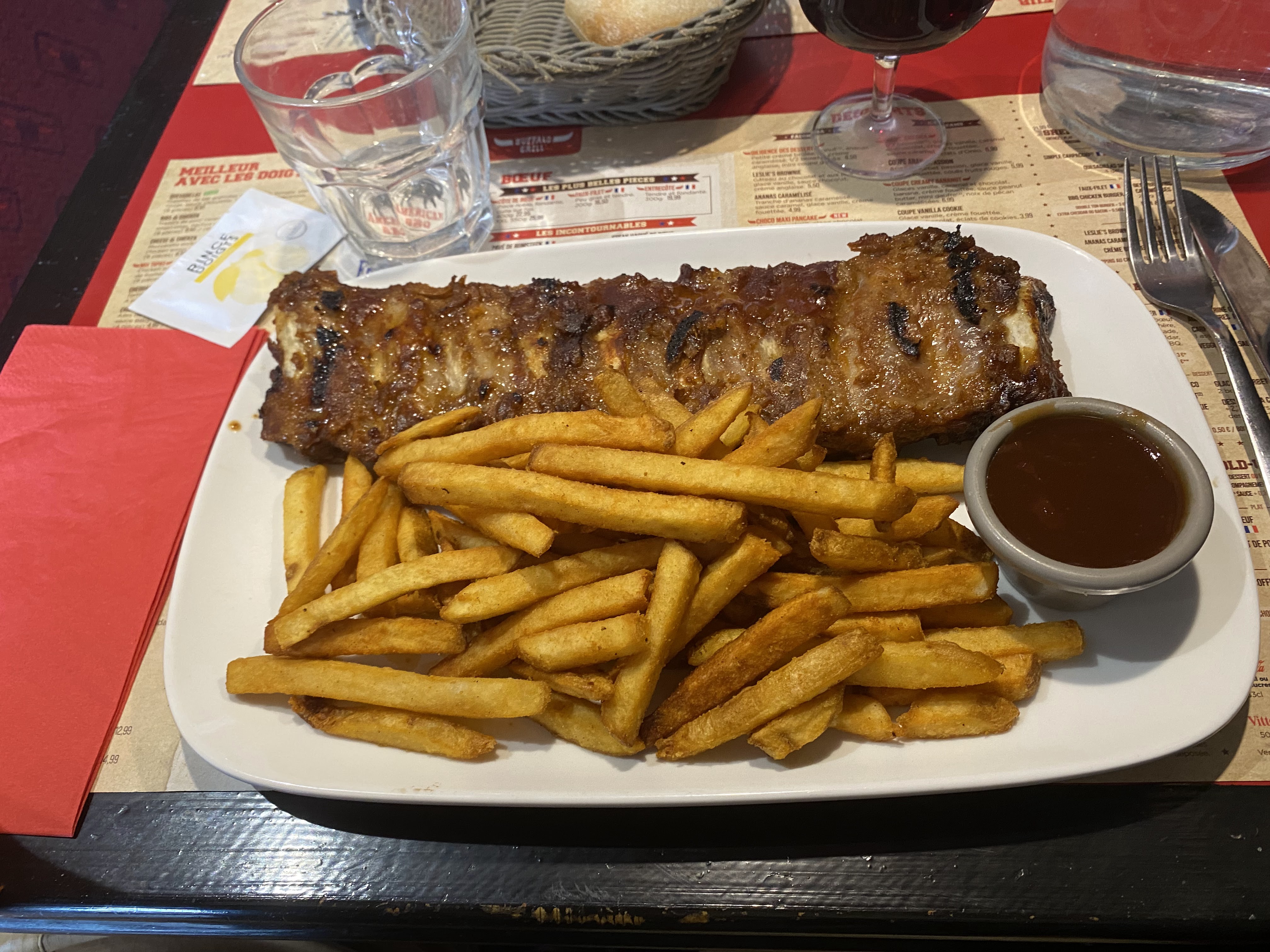 Nous ne savons pas si c'est le fait d'être venus un dimanche mais le barbecue ribs était très peu caramélisé et servi à peine chaud. Nous sommes pourtant adeptes de ce plat et en semaine rien à redire, il est très bon. Nous avons signalé le désagrément rencontré à l'accueil, mais aucun geste commercial n'a été fait. Sinon félicitations au serveur qui était très aimable et serviable.