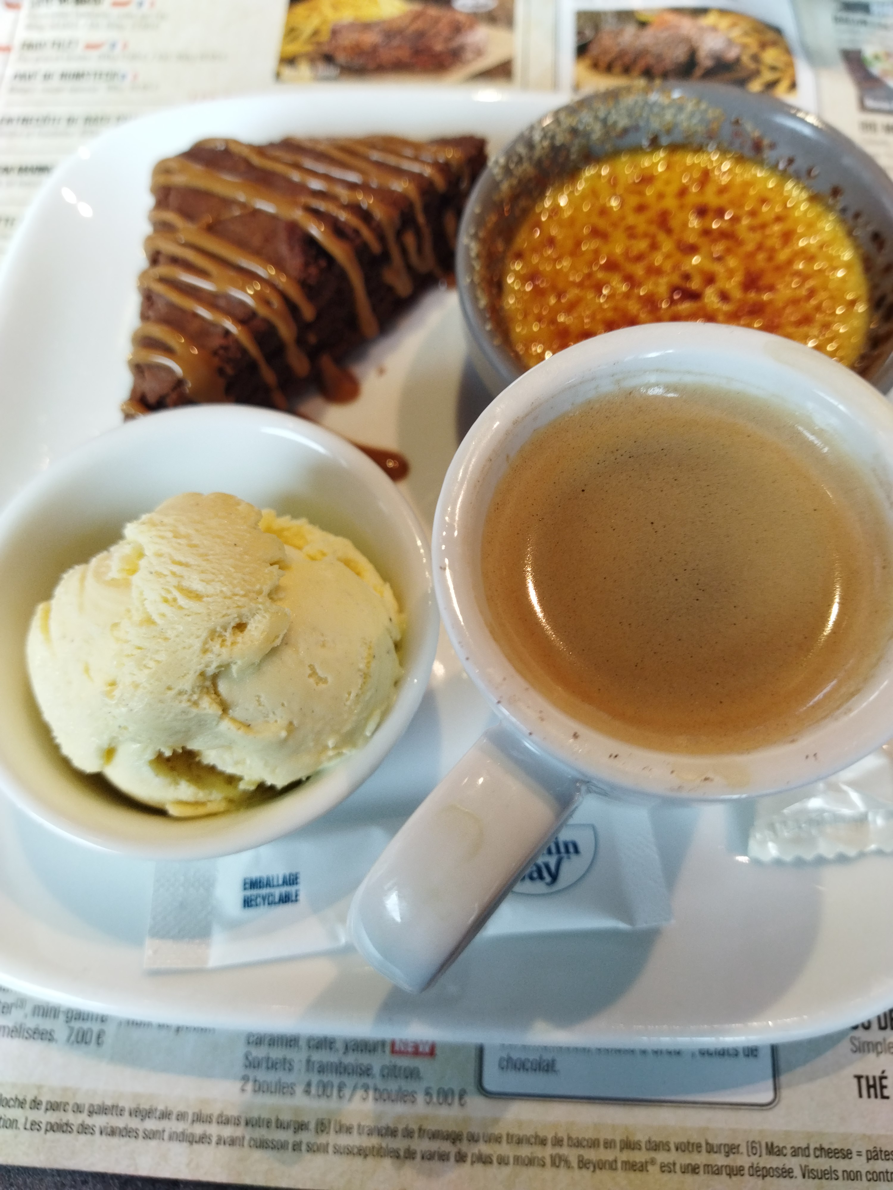 J’ai mis 2 étoiles, c’était pour le pauvre serveur qui faisait l’interface entre les clients mécontents et la cuisine. Bien qu’en arrivant une serveuse nous dit qu’il y avait de l’attente, qu’une table était au dessert alors que l’autre côté il y avait des tables vides. En nous voyant faire demi tour, elle nous a placé chez son collègue. J’ai trouvé une boule de moisi (ÉDIT: ce que j’ai pris pour du moisi mais le serveur n’a pas su m’expliquer) dans la béarnaise, mon entrecôte demandée saignante était plus cuite que à point. La table à côté s’est plainte car un plat était encore congelé. Même le sachet avec l’amande (ÉDIT: ce qui est servi avec le café, une boule chocolatée) avec le café était déjà ouvert… Déjà que la qualité a énormément baissé depuis des années dans cette chaîne , mais là c’était le coup de grâce.