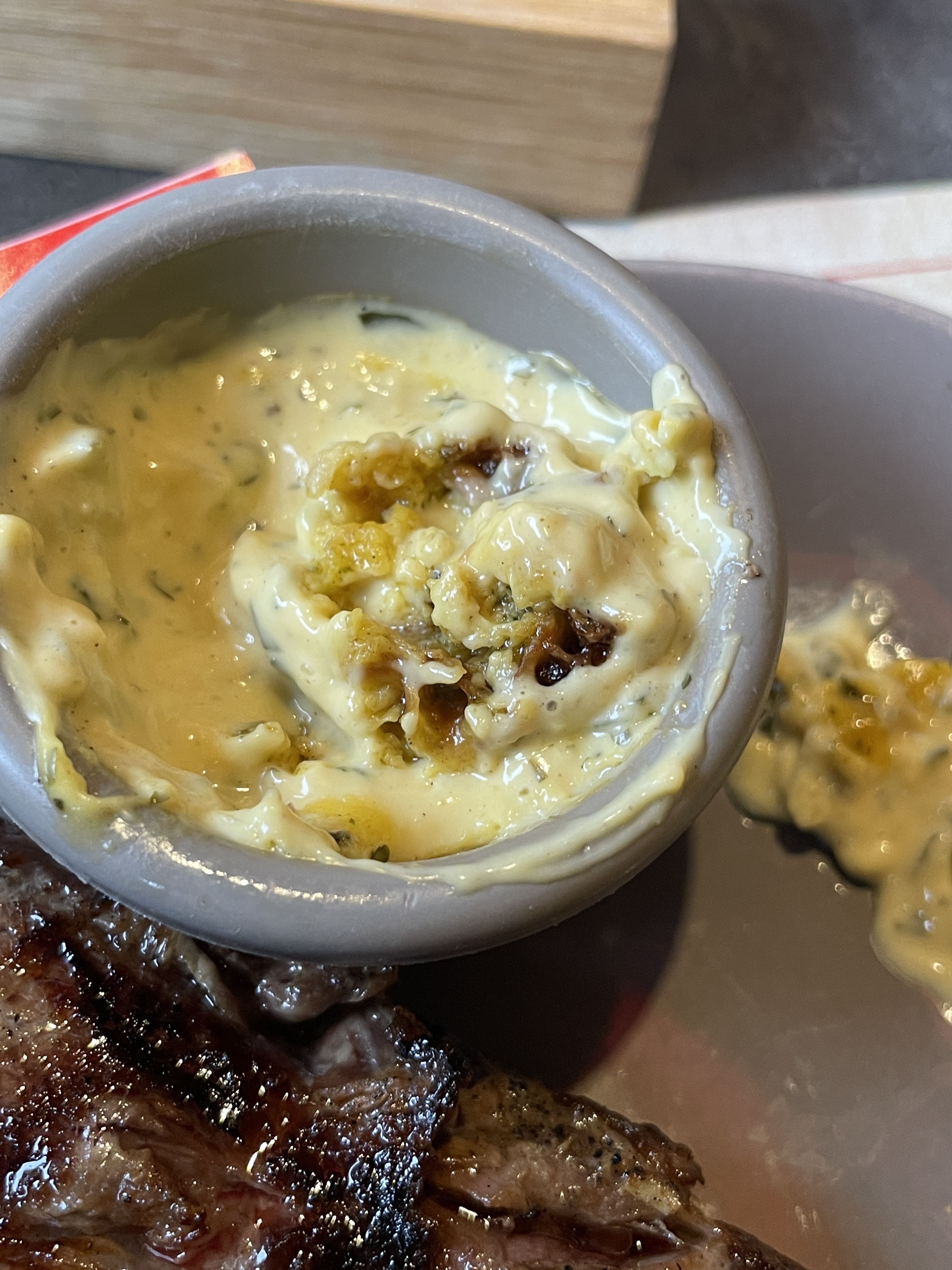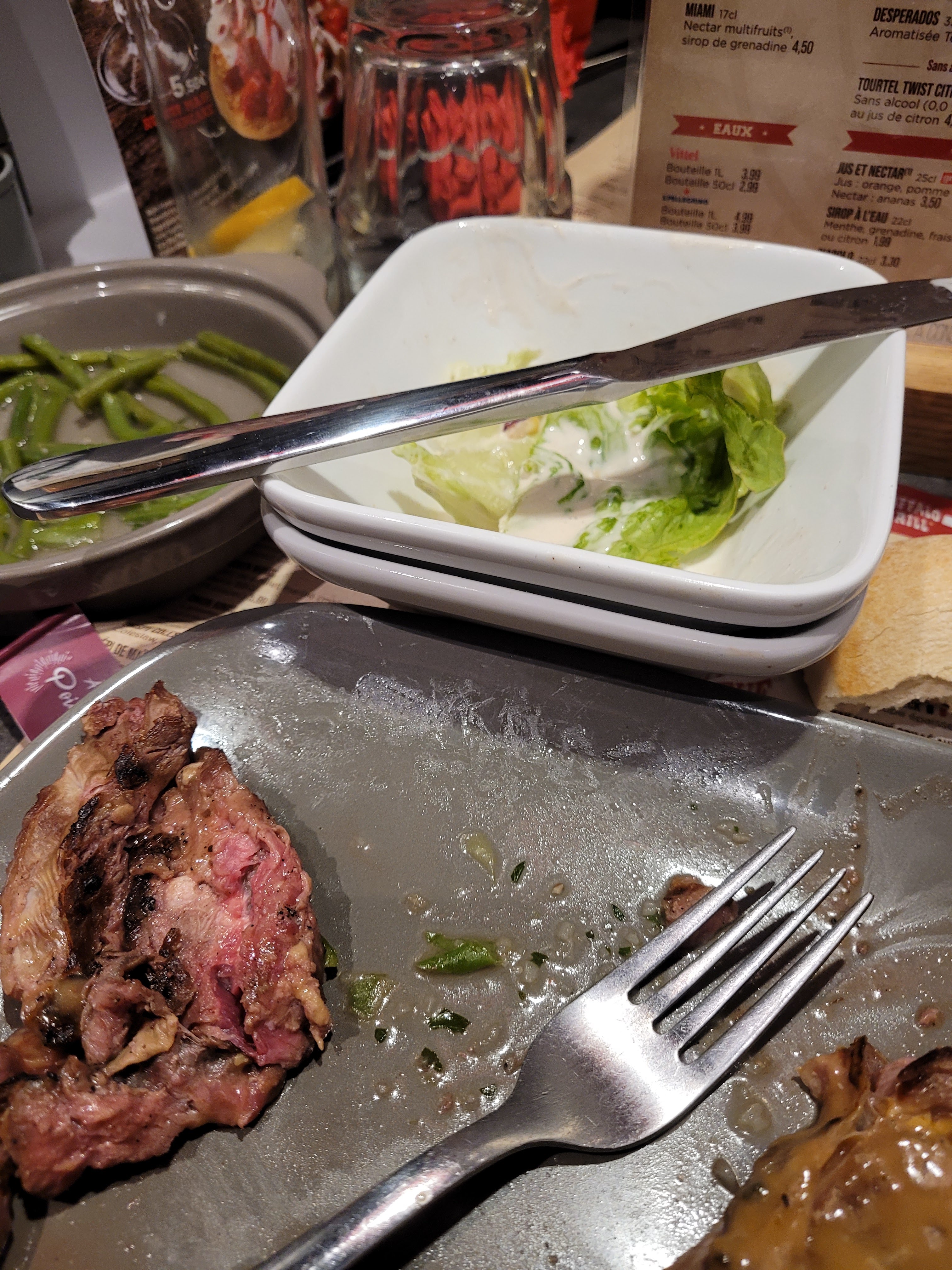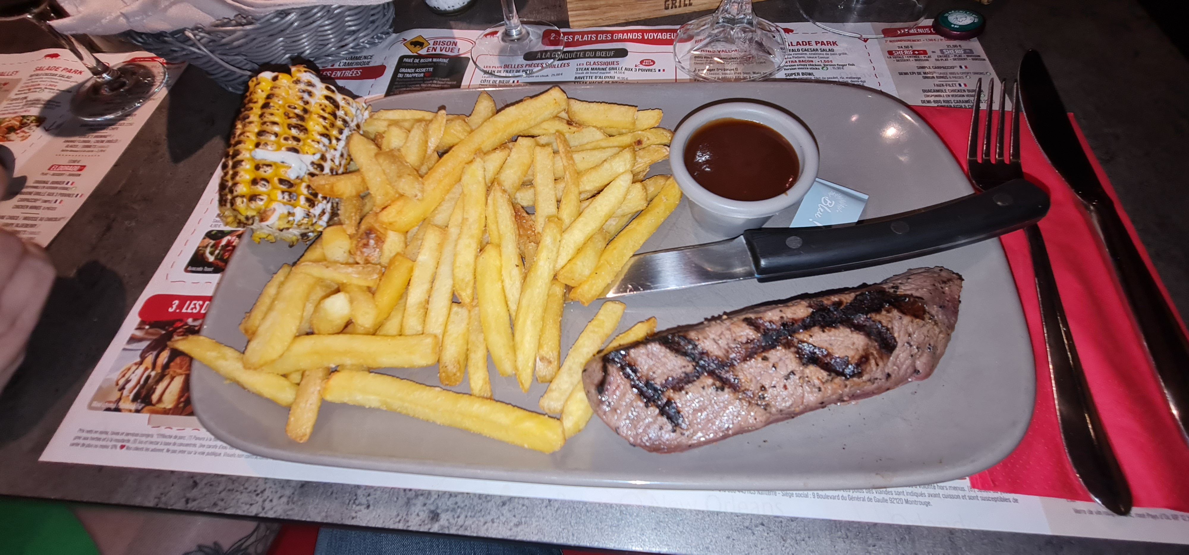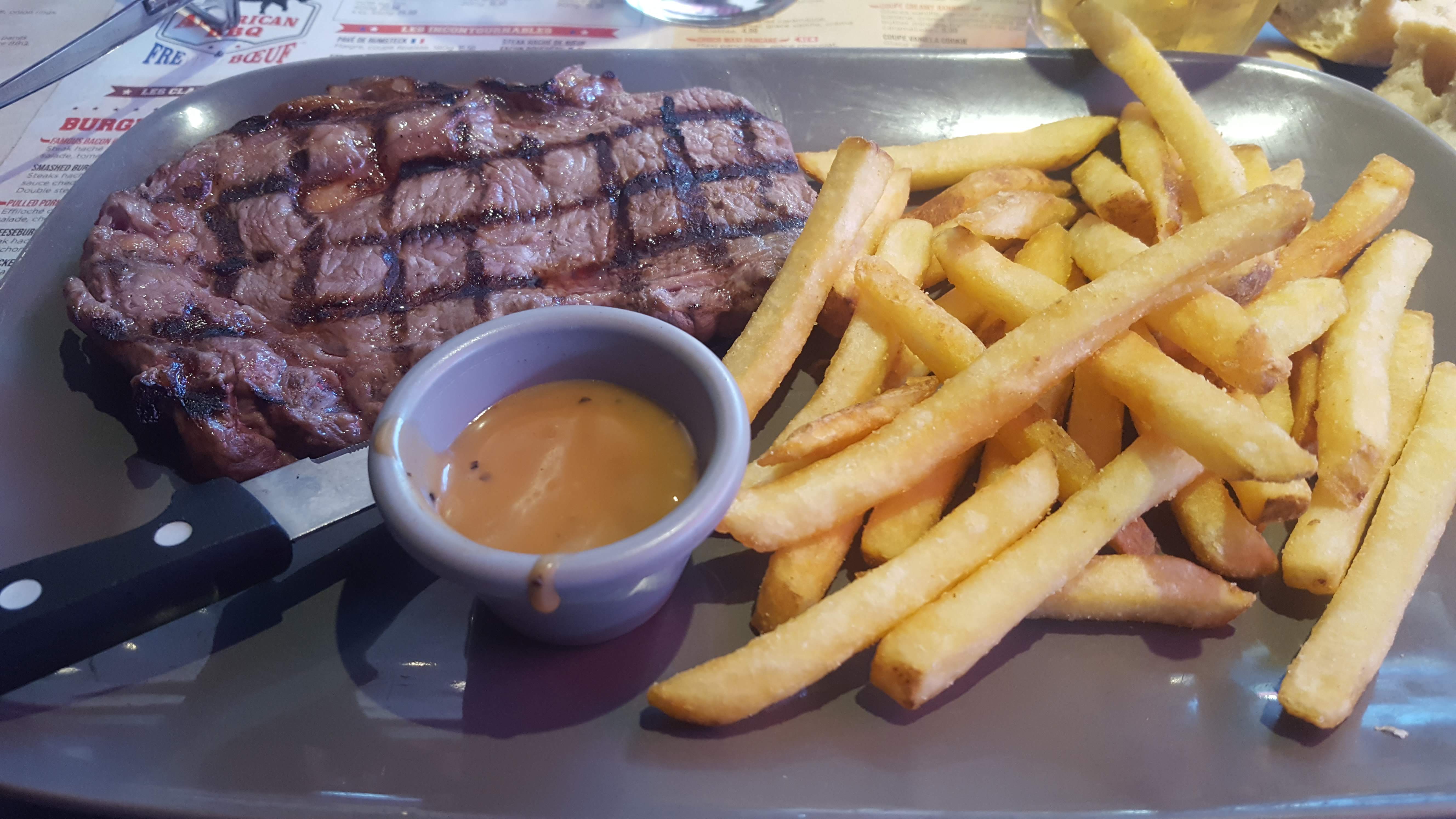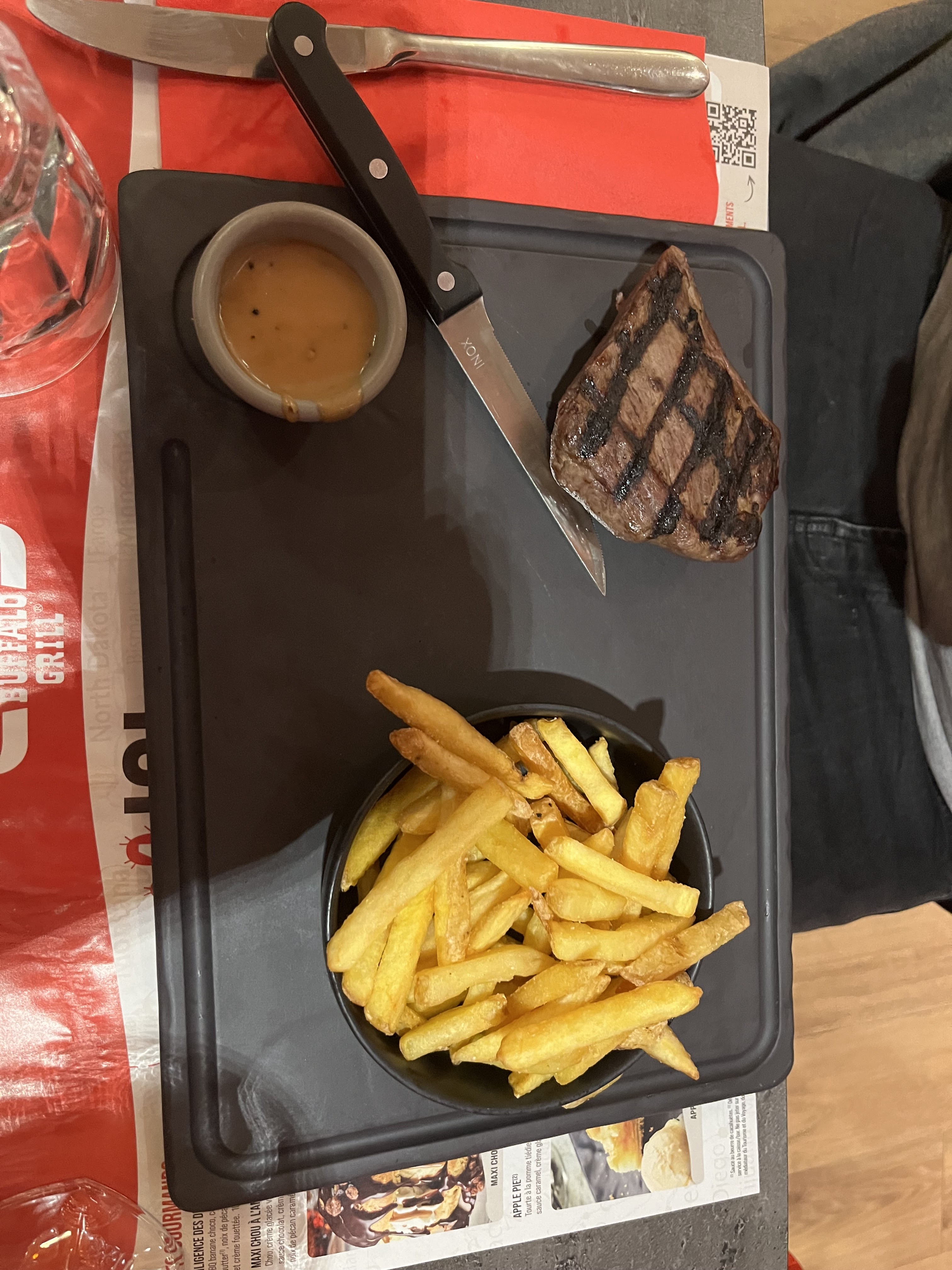 Je ne sais pas vraiment si je suis dans un restaurant où dans un fast-food. La nouveauté chez Buffalo c’est que le client gère directement sa commande via une application. Personnellement si je viens dans un restaurant normalement j’ai un serveur pas un runner. C’est magnifique de vouloir réduire encore le personnel et de demander aux clients de gérer la commande. A quand la suite ! Cuire son steak 🥩 comme un chef !!! Concernant la cuisine… Mon entrecôte super … trop de gras désolé Rien de génial