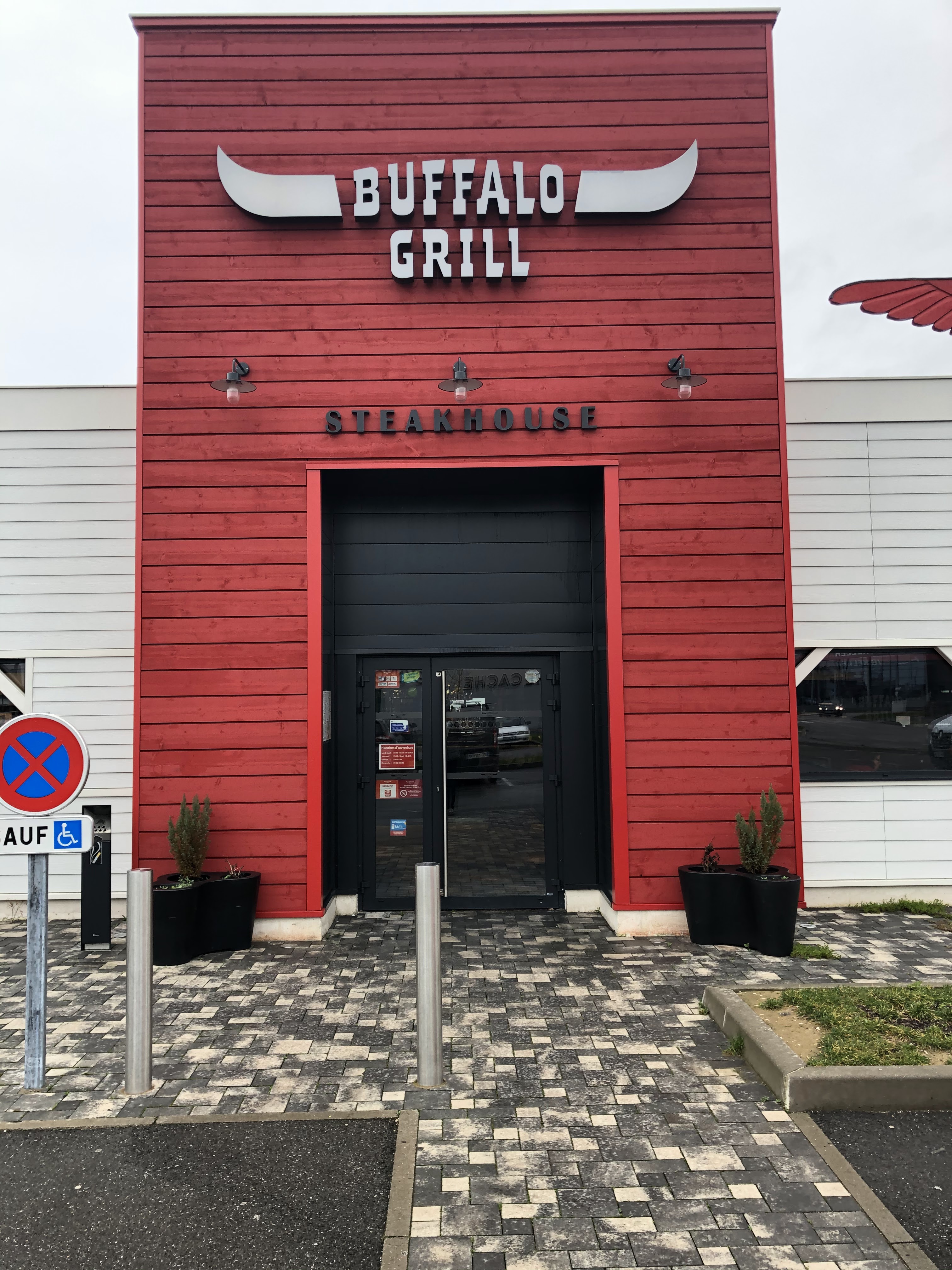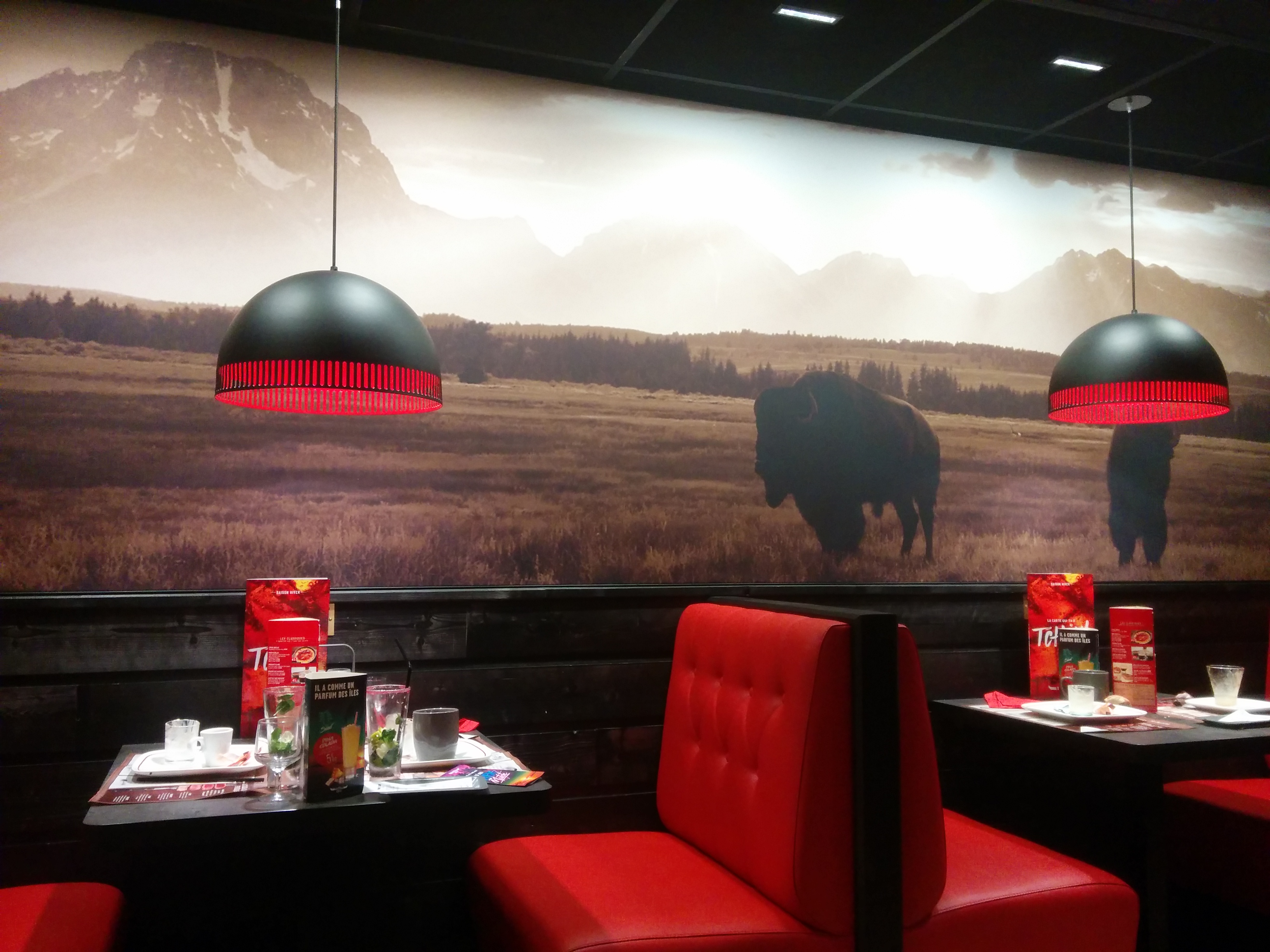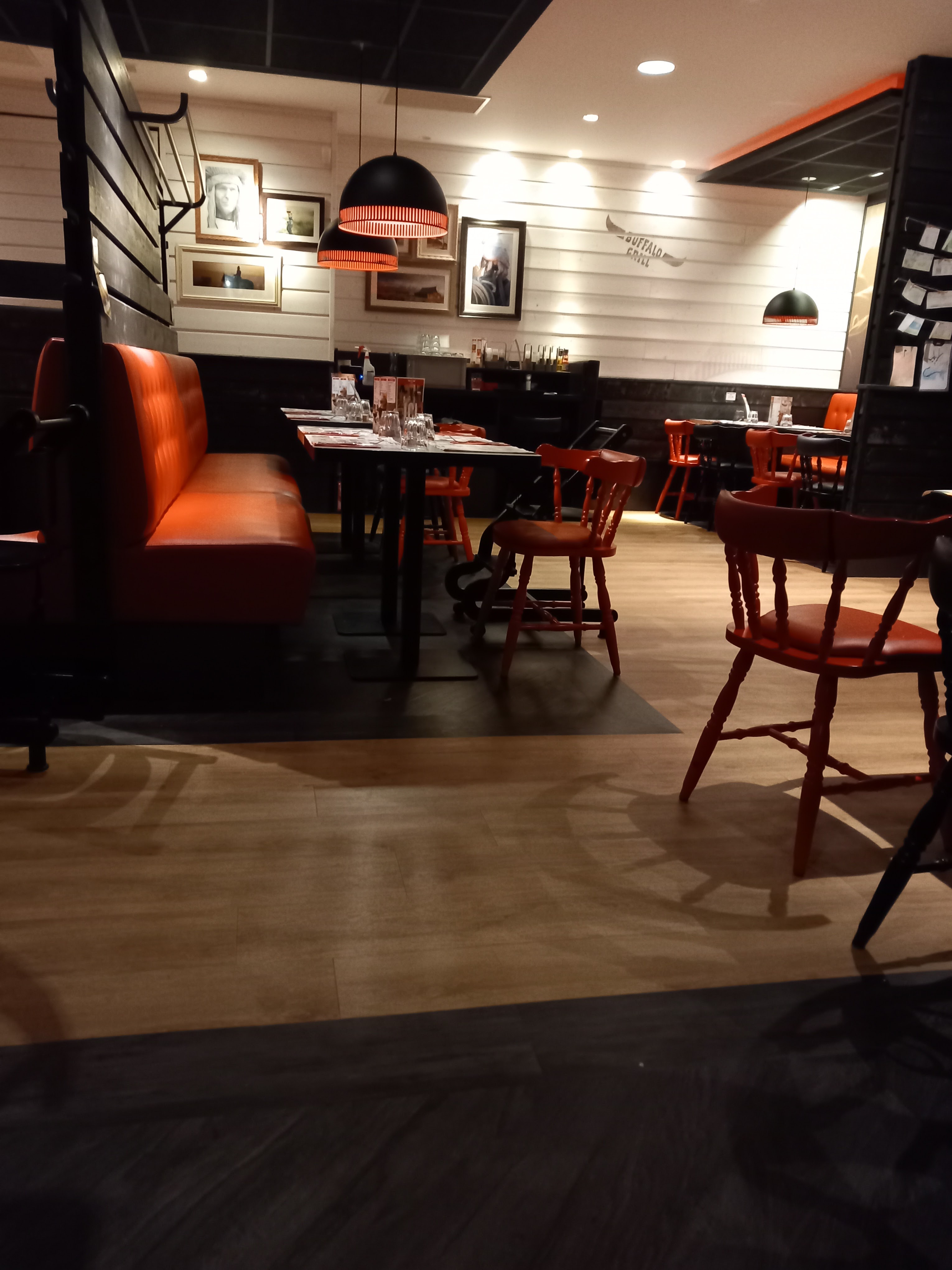 Bonsoir, aujourd'hui pour la 1ere x on est venu au Buffalo Grill, serveuses et serveurs super sympa, un décor de rêve avec le noir et le rouge, on a bien mangé c'est très bon et le maxi chou à l'américaine miam un délice, ce qui est sûr c'est qu'on reviendra, de beaux cadres style western, indien bisons, merci à toute l'équipe de votre savoir faire, de la part de la femme à l'oxygène et de mon mari à la béquille