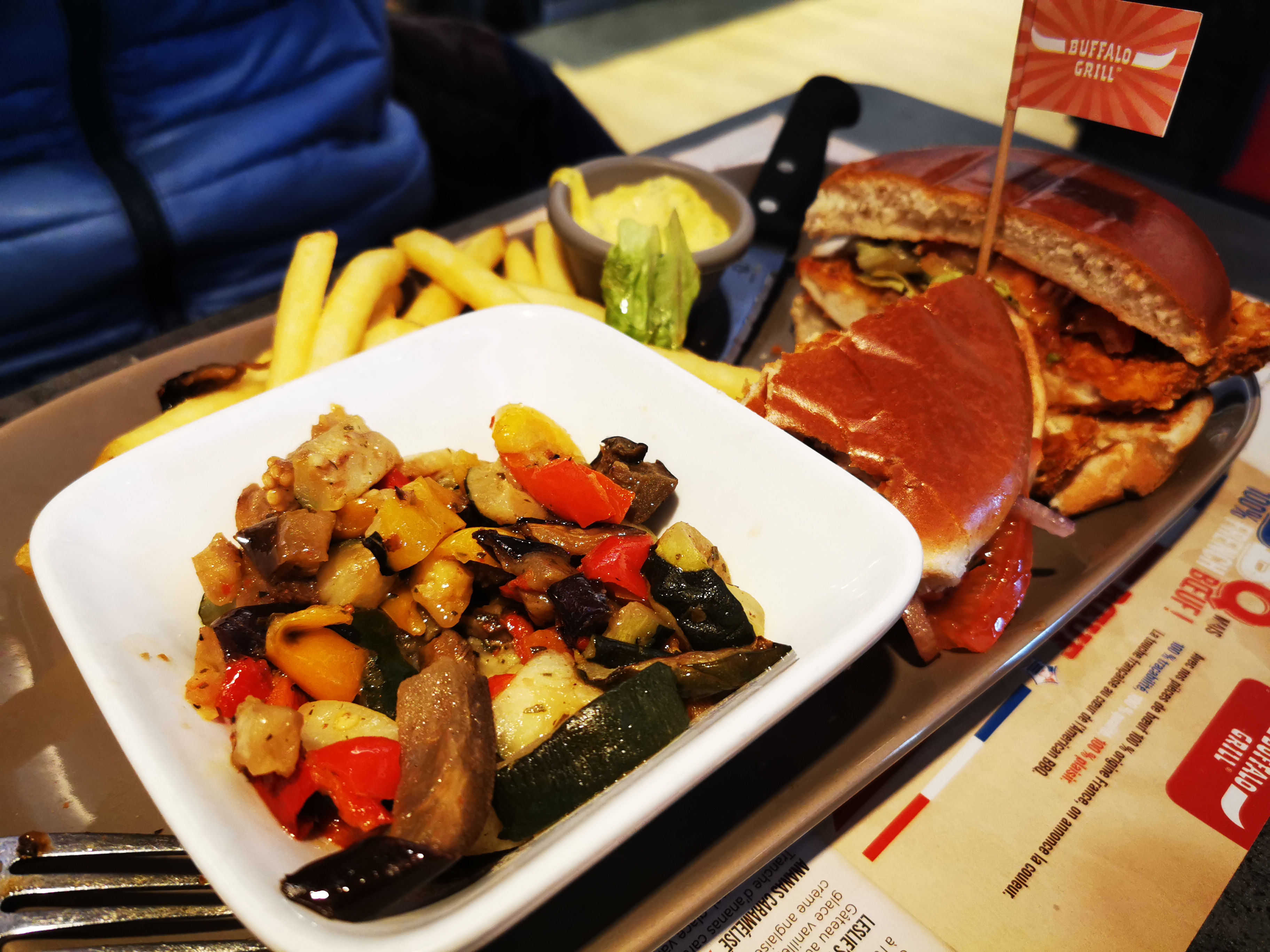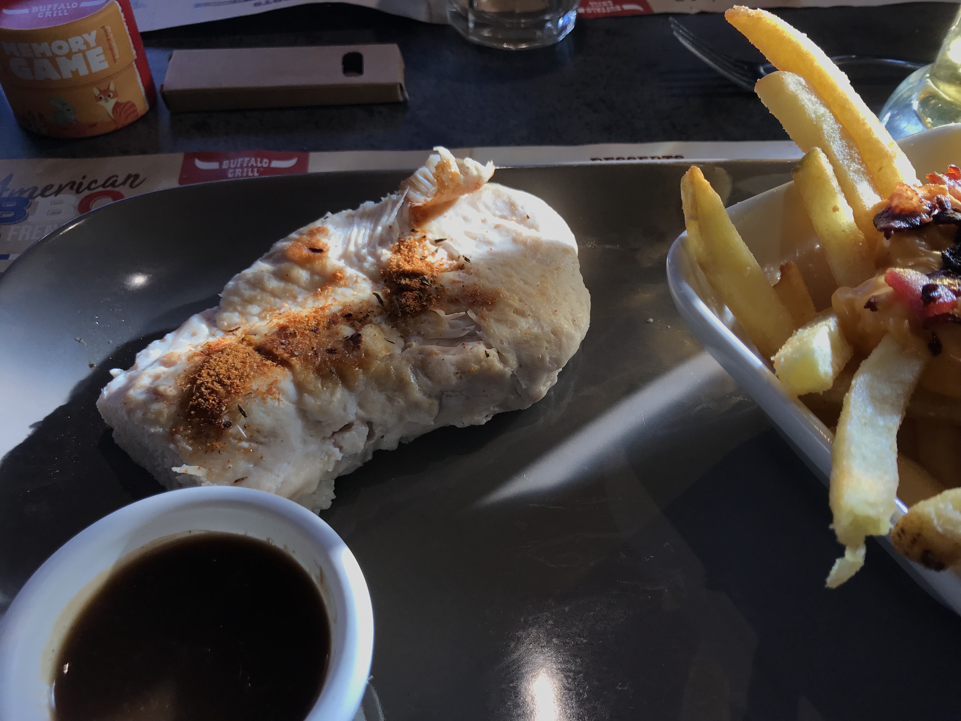 Nous sommes arrivé dans le restaurant à 12h20, nous avons été servi à 13h50… Malgré tout le personnel s’est montré sympathique, mais 1h30 d’attente pour manger au Buffalo grill c’est beaucoup trop long… de plus, ça n’a rien à voir avec cet établissement en particulier mais plutôt avec l’enseigne, mais je ne recommande pas le poulet aux épices cajun: une grosse déception, je crois que la photo parle d’elle même ! Je ne comprends pas qu’un plat comme ça puisse être à la carte !