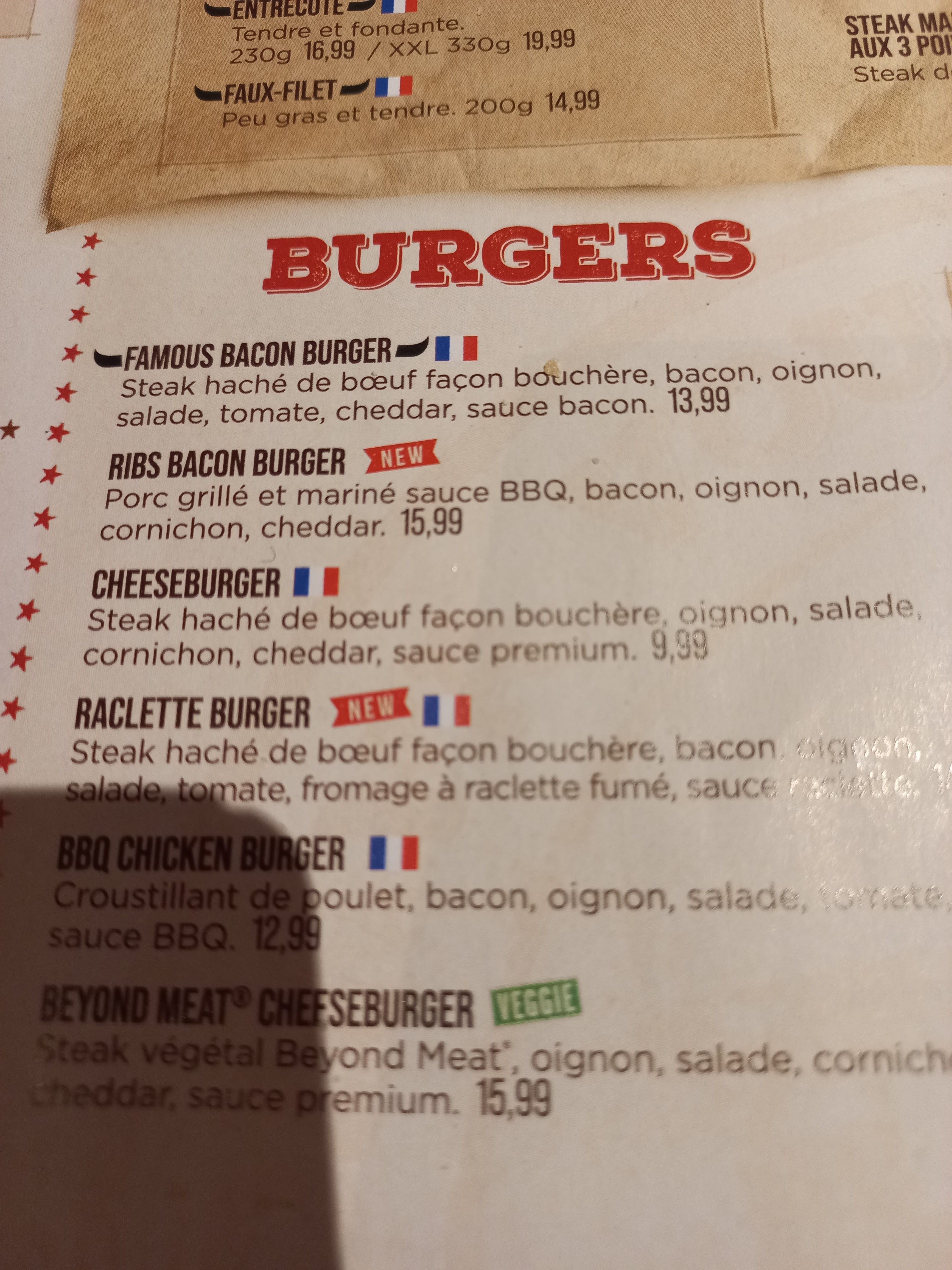 Restez sur sa faim. Ma compagne ayant commandée un filet de Bison et ayant reçue un faux filet car le bison était en rupture de stock, je veux bien l'accepter cela arrive, mais étant donner qu'on nous conseille des faux filets, autant que cela soit des VRAI faux filet et non des morceau rebus pas plus grande qu'une main d'enfant vendu 20e le menu, de plus, des pommes de terre au four étaient demandées et ma femme à reçue quelques frites qui se battaient en duel dans l'assiette, 20e rappelons le. Je ne sais pas si les ordre des pauvres serveuses (Rien a dire sur elle très gentilles) remonte bien mais il s'agirait de changer cela car ce n'est pas la première fois et non dans le même restaurant de la firme. De mon coté des MacNCheese et Chicken Crispy, le poulet était bon mais la quantité de pates laissait à désirée. Les seules choses qualitatifs ayant été respectée fut les desserts. A amélioré SVP.