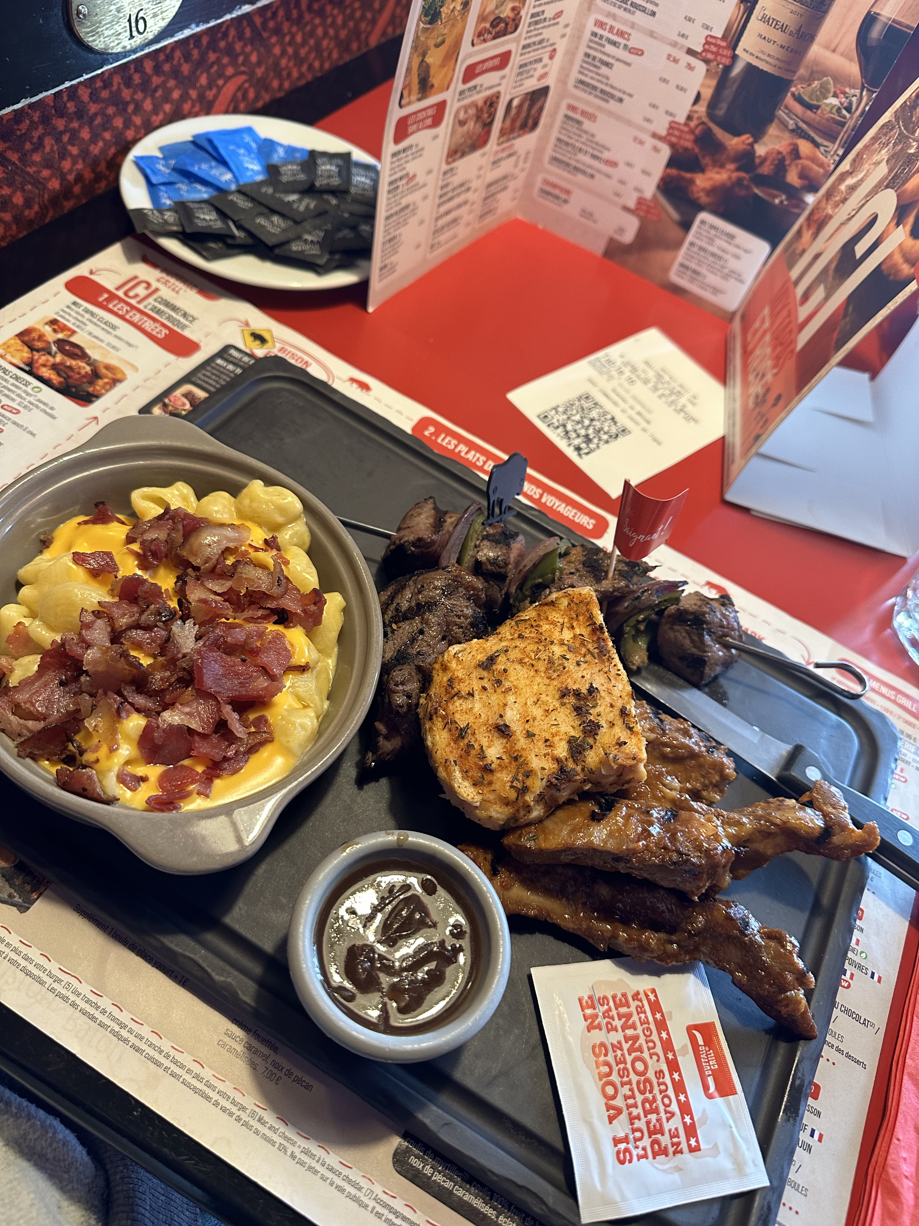 Déçu nous avons pris une assiette trappeur 2 personnes ribs tiède à l'extérieur froid à l'intérieur idem pour le poulet à mon avis le temp au micro ondes à été écourté !!!!!! Les brochettes et steaks ras moi qui invitait mr pour son anniversaire j'étais bien désolé ! La serveuse nous a proposé un café offert pour s'excuser mais il était tard nous sommes rentré et elle n'y est pour rien ( les gens de la table à côté c'était idem) pour le prix c'est décevant je n'irai plus du moins plus à celui là
