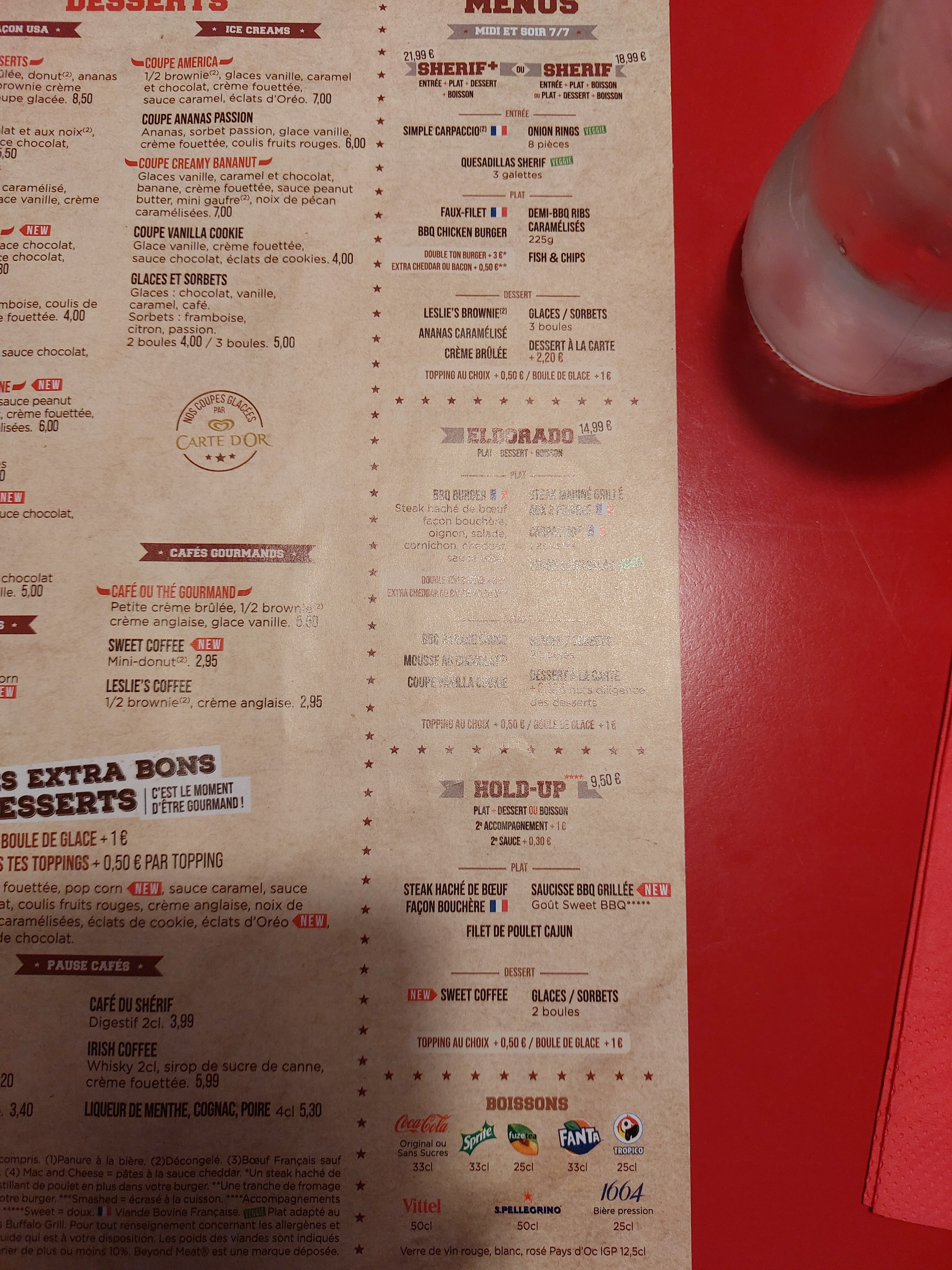 Les plats pas de surprise c'est du buffalo. Viande pomme de terre top. Nous avons adoré le service tout en gaieté de Émeline à encourager. ( Photo coupee au mauvais endroit on ne peut voir le message sympas de la serveuse)