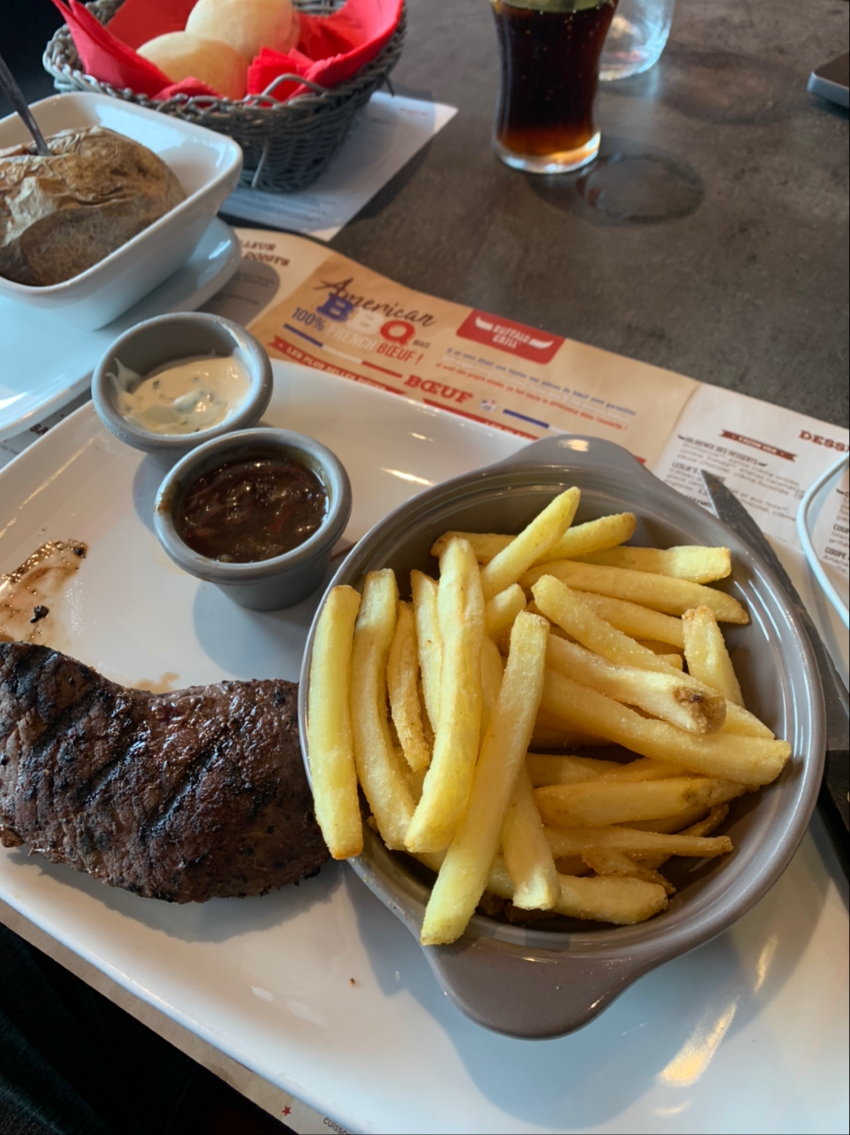 Arrivés un peu après 14h00 nous avons été très bien accueilli. Le coup de feu était passé donc restaurant calme. Personnellement je trouve que le faux filet était un peu petit, il n'y a pas assez de sauce pour accompagner et pas beaucoup de frites c'est dommage. Par contre les frites sont très bonnes et le brownie aussi.