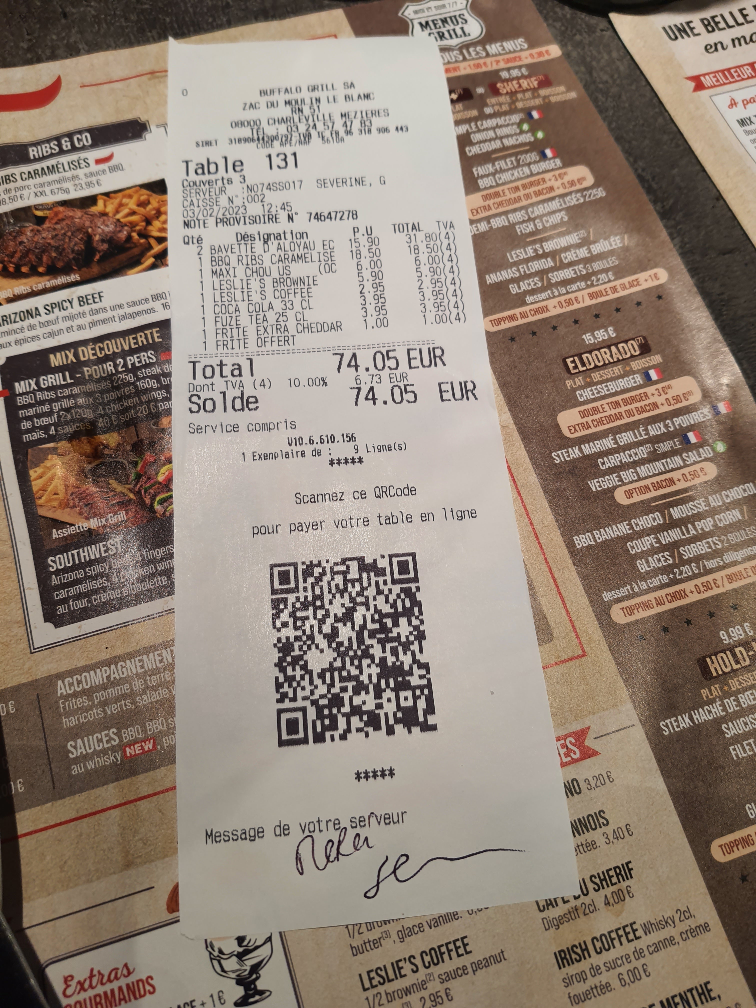 Personnel agréable, en revanche le service est assez lent. Les plats ont le temps de refroidir. Nous étions obligés de re demander de l'eau à chaque fois alors que la serveuse passait régulièrement à côté. De plus, nous trouvons peu pratique et peu plaisant d'avoir à commander via l'application. La prochaine fois nous verrons pour commander directement avec le personnel présent sur place. Tarifs normaux pour un Buffalo Grill. Culinarement parlant, les plats n'étaient pas top. Les ribs étaient sec, le cheddar avait refroidi. Les portions de frites étaient peu généreuses (en revanche nous pouvions en reprendre à volonté donc celà compense ceci). Le cheddar des frites avait refroidi et durci par dessus celui-ci.