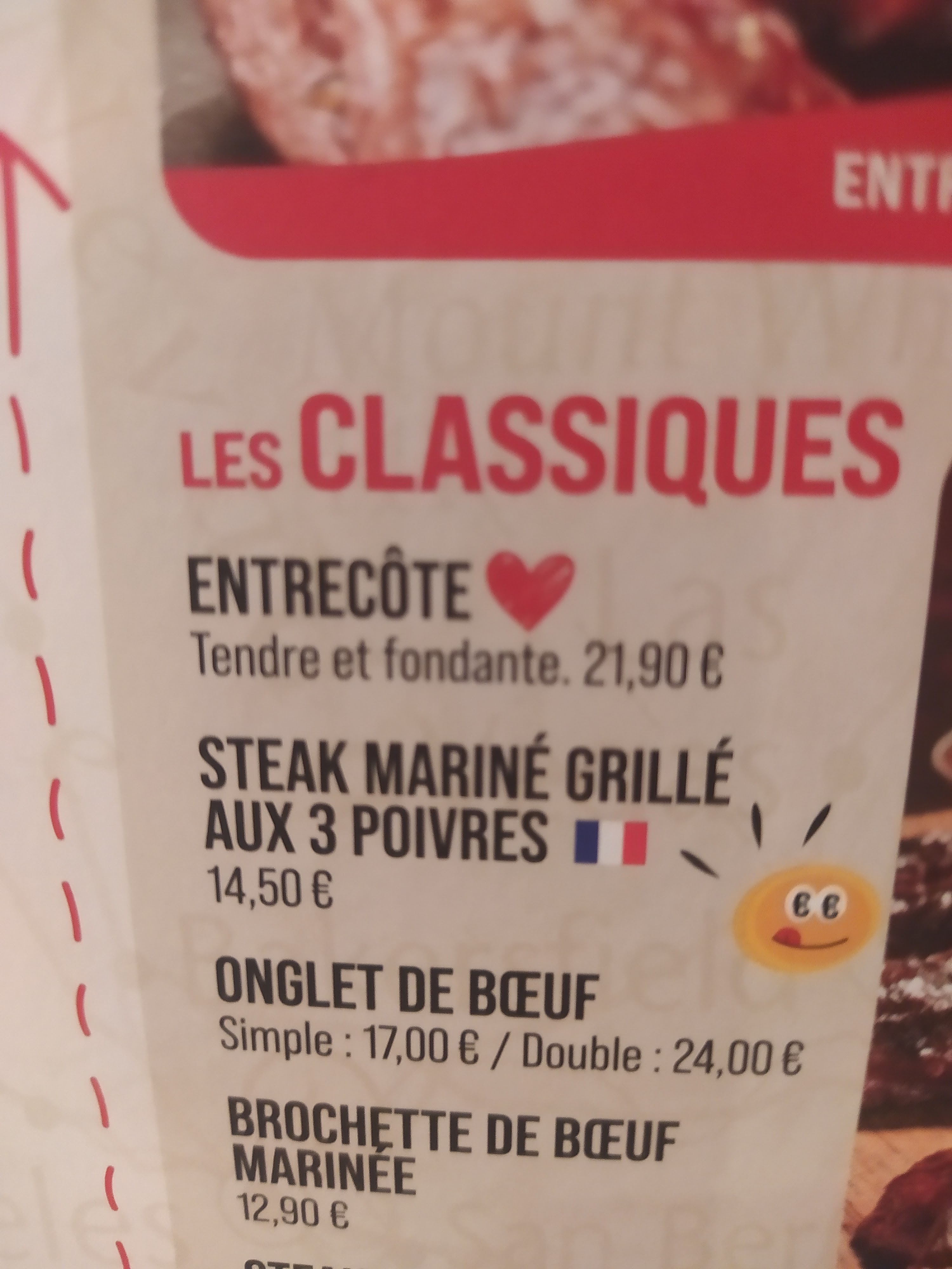 Viande dure, couteaux à beurre plutôt qu'à steak, pomme de terre sèche... et plus de 30min entre la commande et le service, qui ne correspondait pas aux plats demandés. Je ne recommande pas.