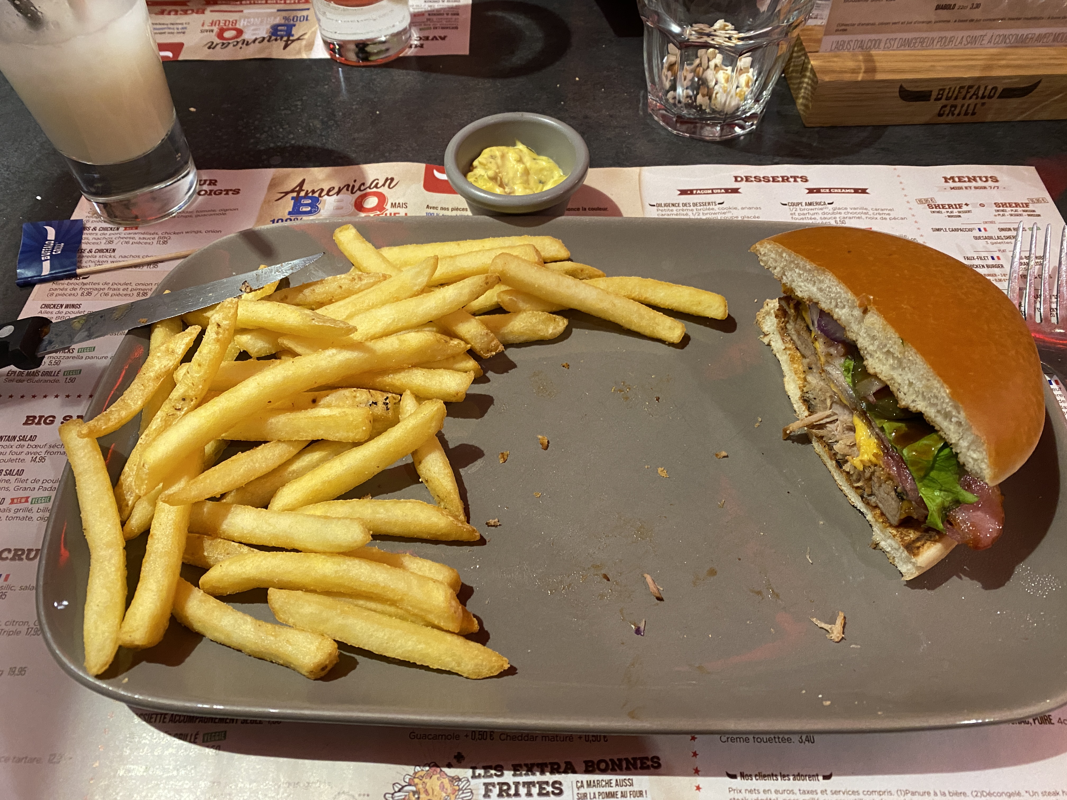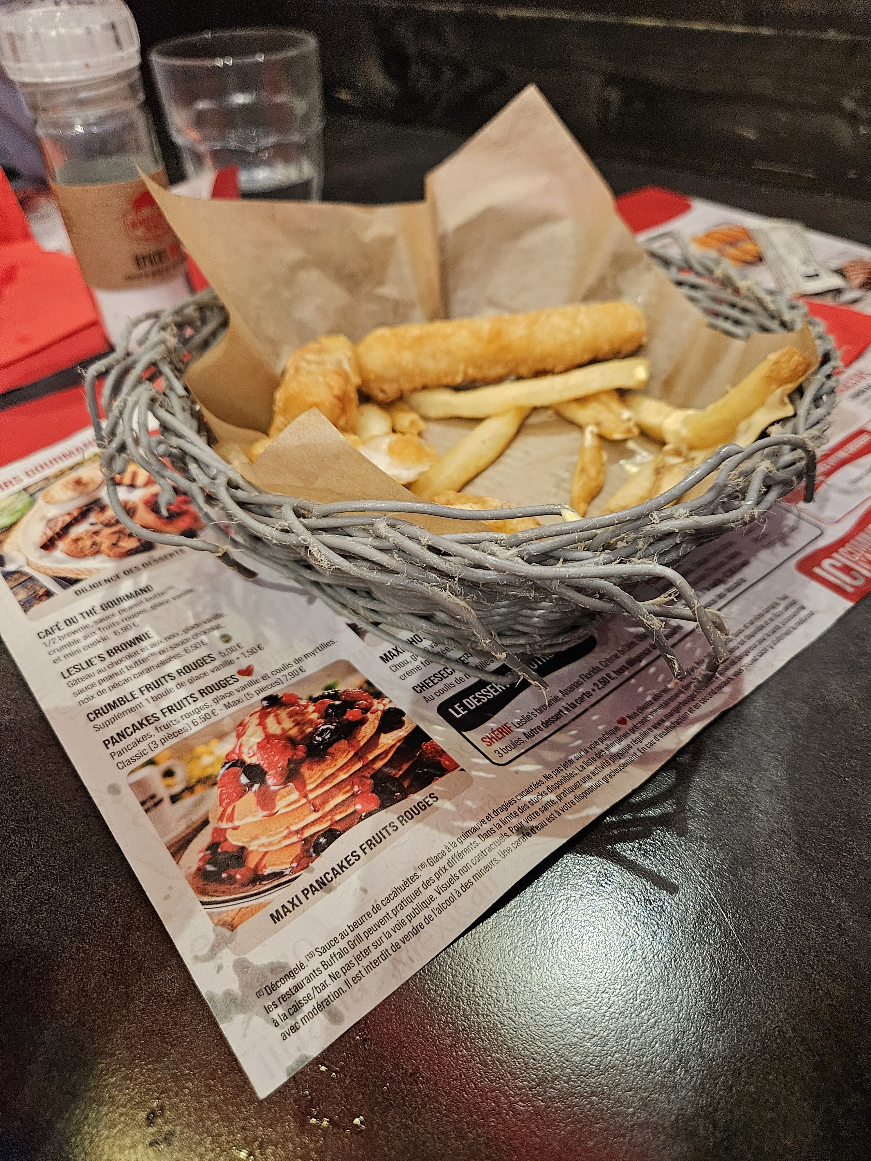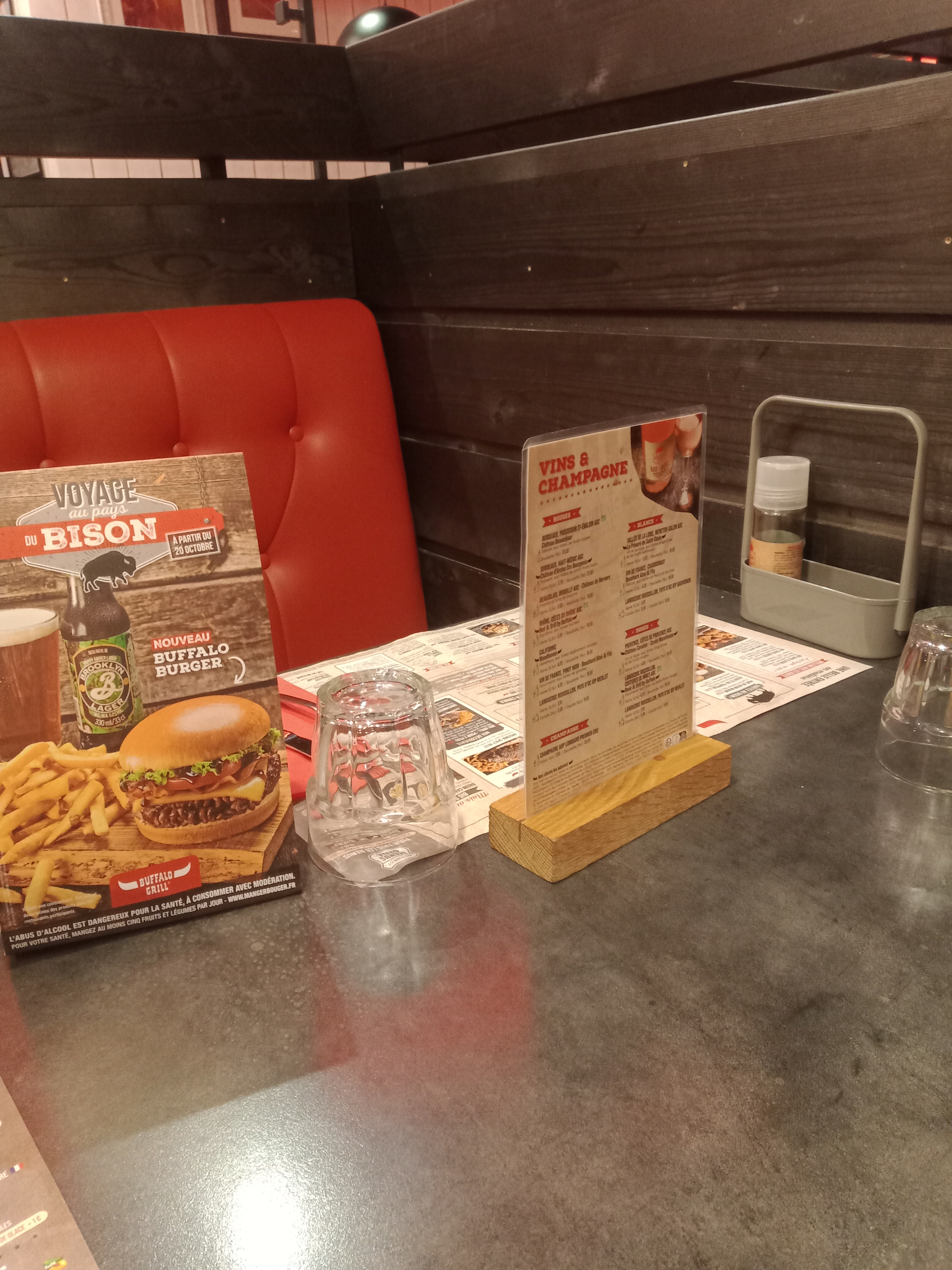 Très bonne expérience dans ce restaurant. Merci à Estelle la serveuse qui s’est bien occupée de nous. On a directement le droit à une petite salade d’accueil avec du pain avant même d’avoir choisit son menu. Les menus burger (double chère) sont copieux et pour le prix, je préfère manger chez Buffalo que dans un Mc Do. Et en plus petits cadeaux pour les enfants et une énorme barbe à papa en dessert. Au top !!!