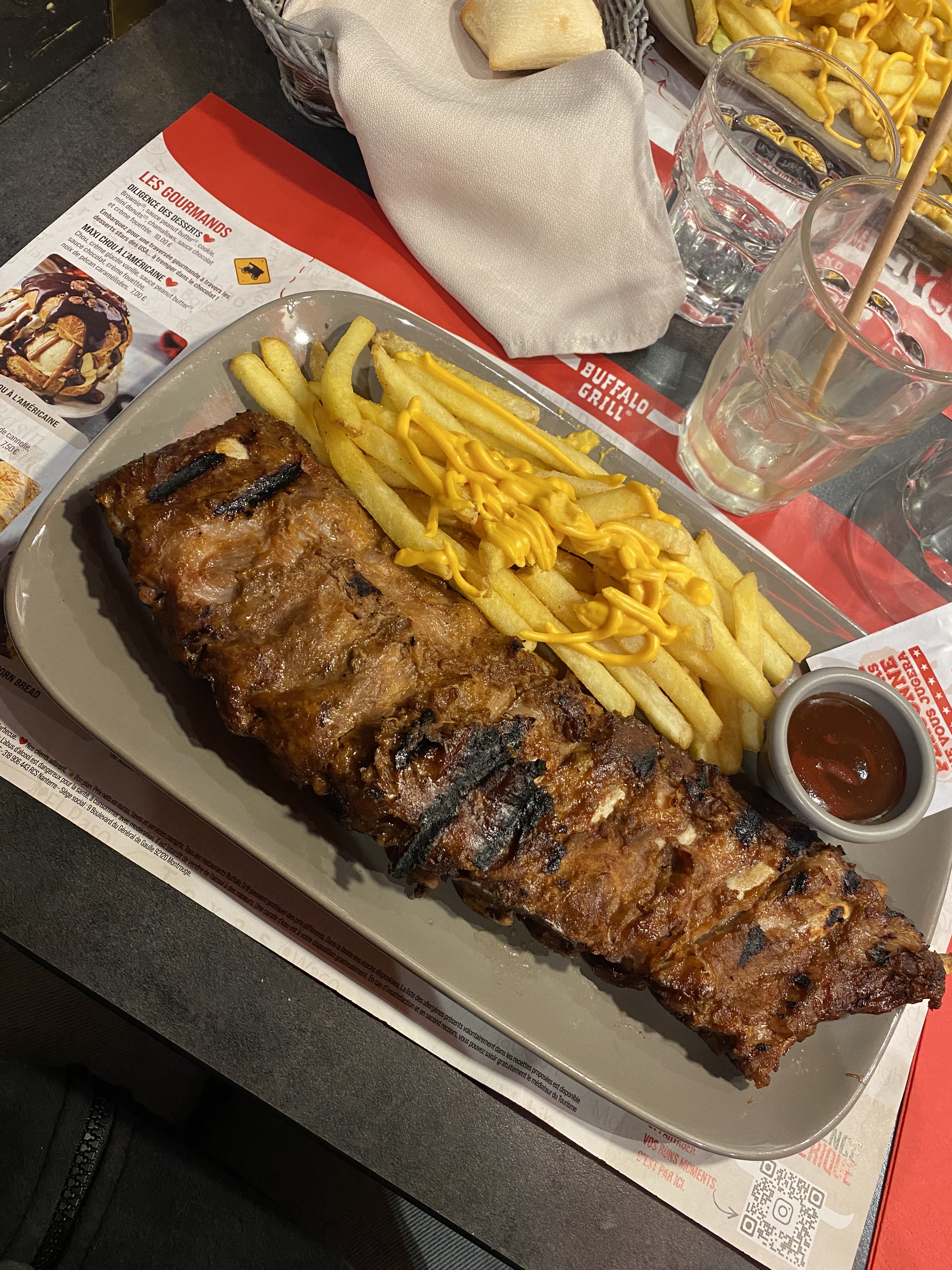 Très déçu, fini le restau conviviale familiale. Obligé de commander sur le téléphone une fois a table ! Service très long , La salade d'accueil ne rythme plus a rien. La quantité a était divisé de plus de moitié. Les ribs était tout juste cuit ... Mais le goût ( saveur caramélisées reste la même ) n'a pas changer . Pour payer .... Personne au contoire pendant plus de 30 minutes.... Nous sommes honnête et avons attendu pour régler. Mais certain n'en font pas de même .... Vraiment déçu.