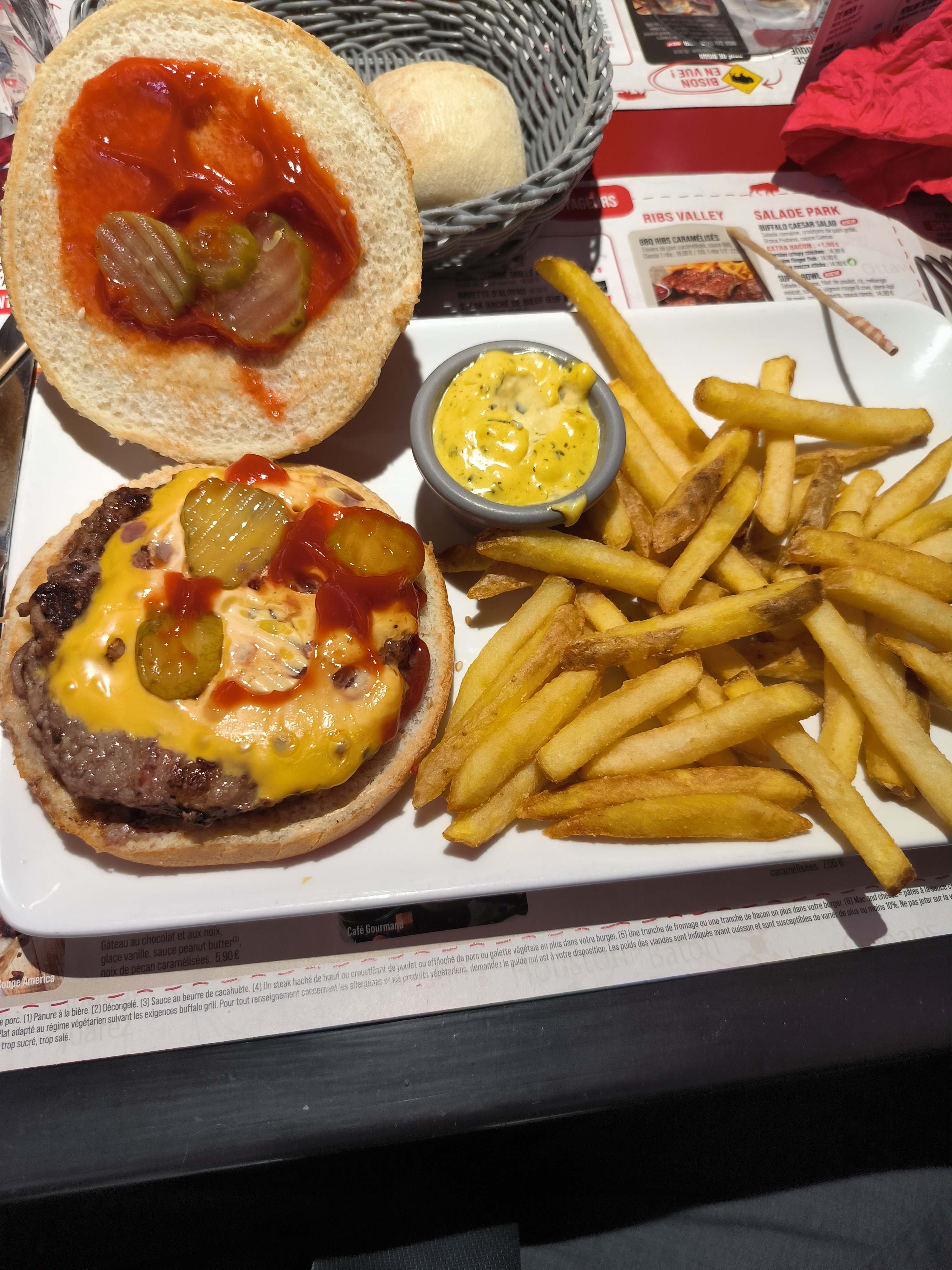 2 étoiles pour le service, non pas par rapport à la serveuse, mais du fait que je voulais simplement remplacer le cheeseburger par le burger famous simple du menu, même en rajoutant un supplément, ça n'a pas été possible à cause du règlement intérieur trop rigide !!🤬