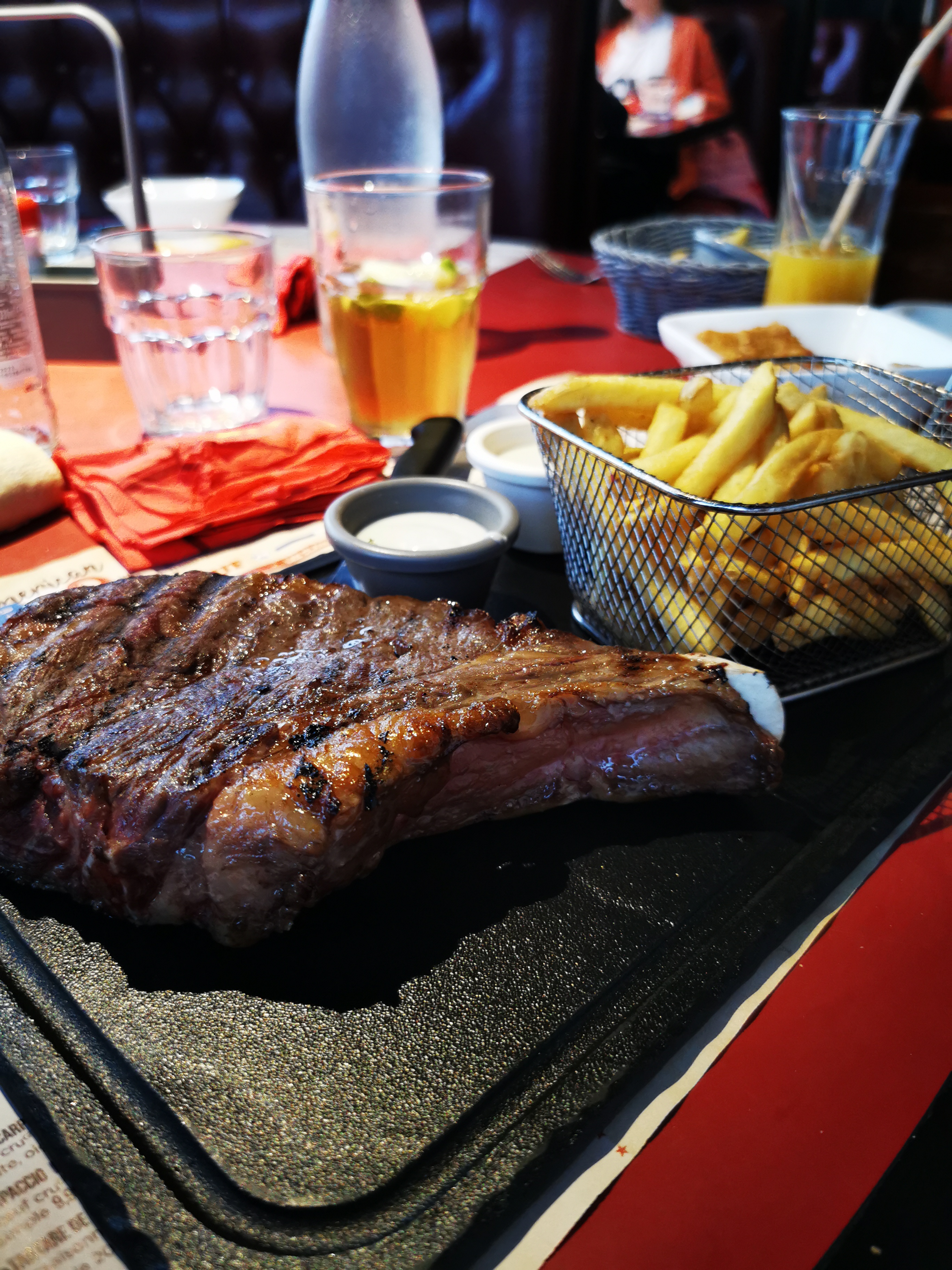La cuisson devait être à point, elle arrive rosé. Les frites ils paraît que l'huile est changé tous les jours (voir photo). Bon appétit à vous 😜