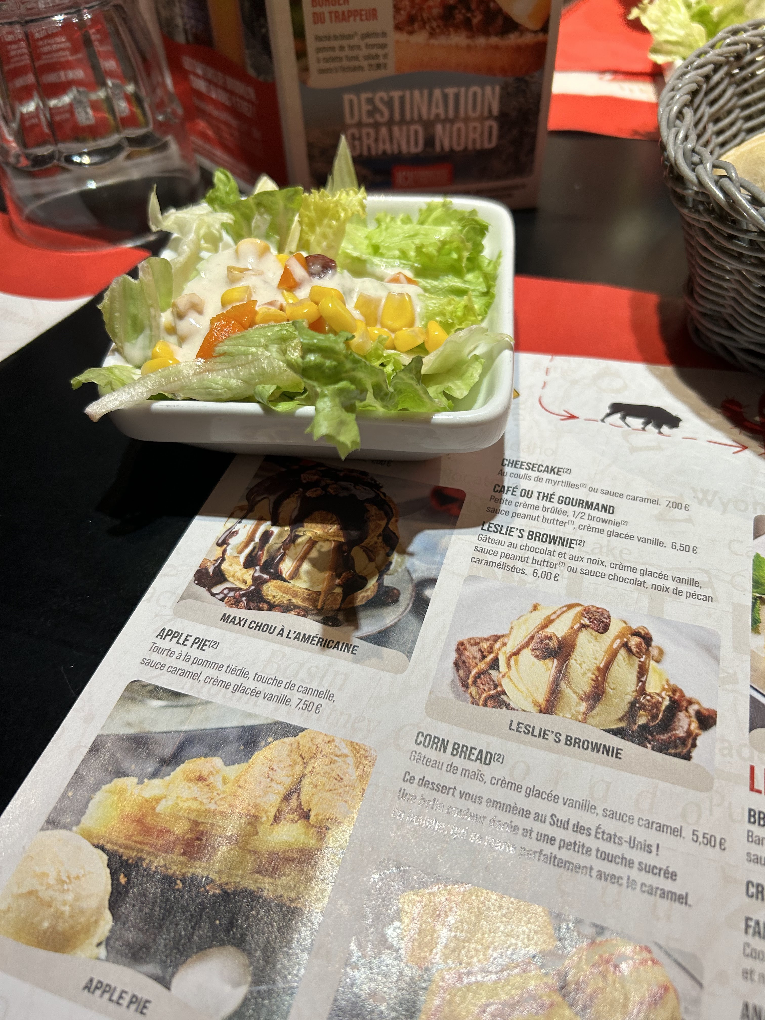 Très bon accueil Menu shérif avec entrée + plat + boisson Faux filet plein de nerf cuisson bleue viande pas terrible Avant la pomme au four un peu présenté la plus du tout. Café viennois le café froid . Il est où le temps où on mangeait bien au Buffalo Aucun geste commercial dommage