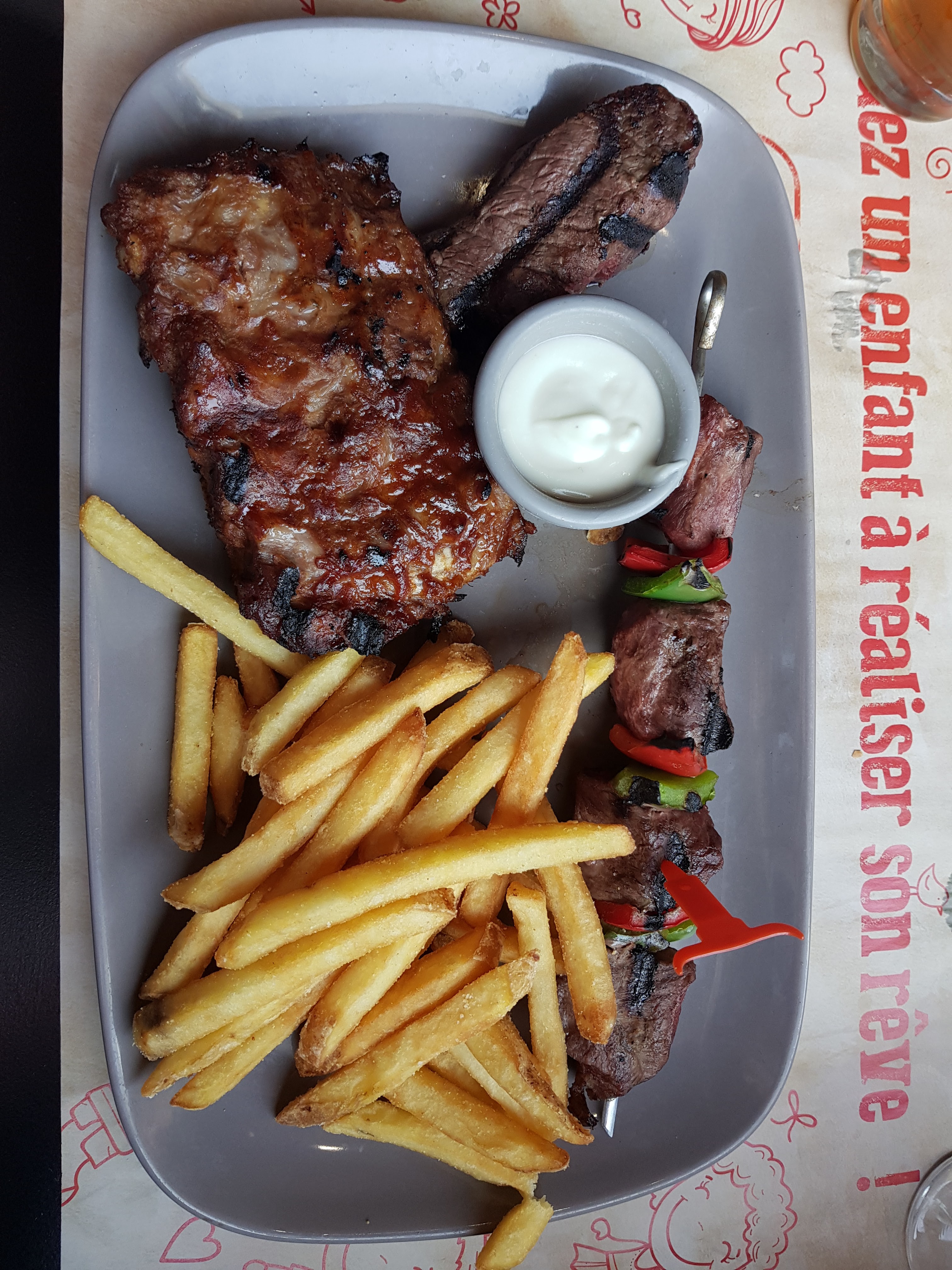 Un peu de temps nous placer due à une arrivée peut être un peu tôt (18h30). Nous avons pris une assiette grill à partager (photo). Bien servi. Bonne cuisson. On regrette quelques morceaux avec nerfs dans les brochettes. Bonne expérience, nous reviendrons.