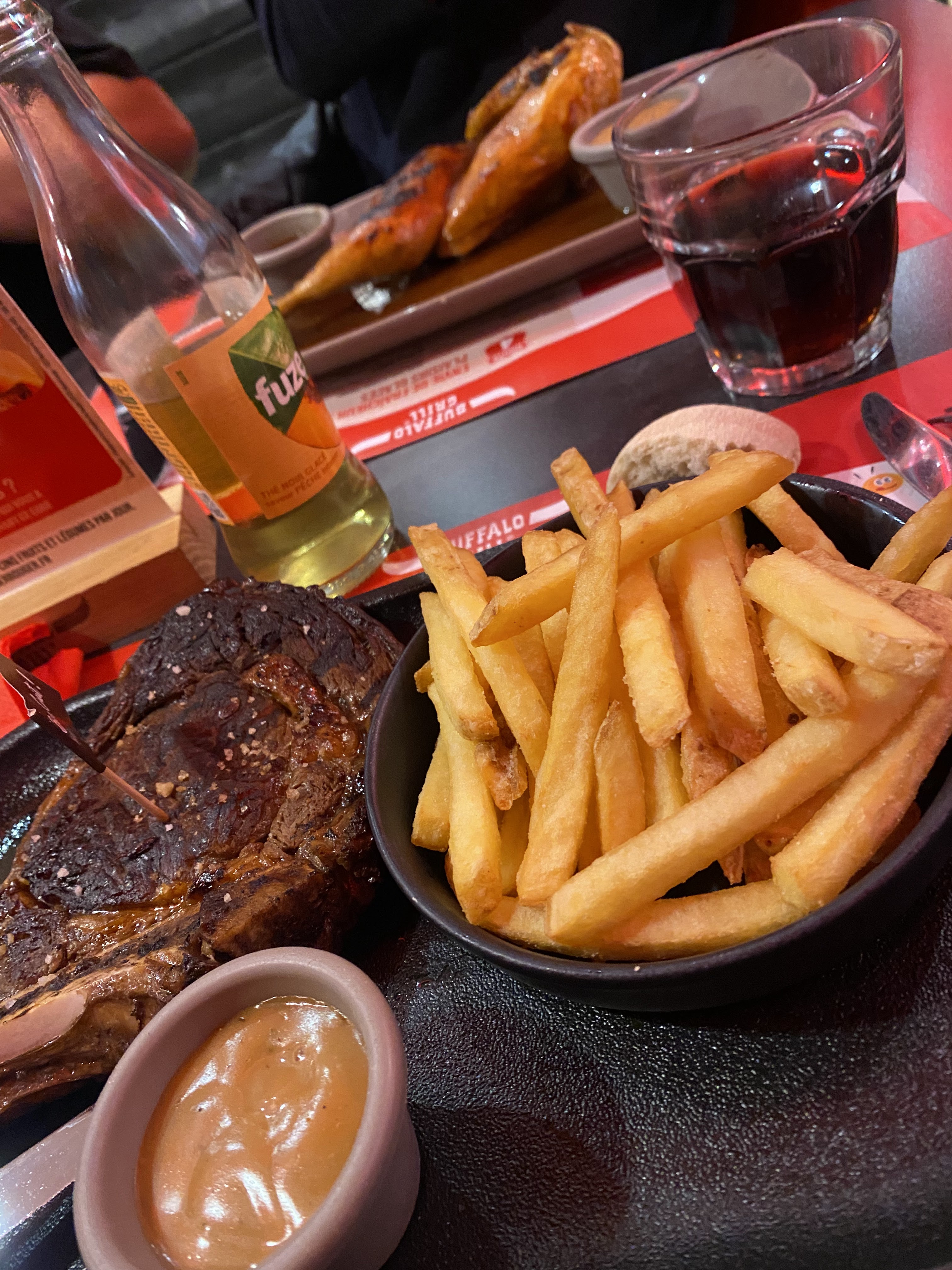 Très déçu, apéritifs servis après le plat ! Frites bas de gamme. Desserts servis avec assiette cassée et peau de banane est ce normal ? Connu mieux de la par de Buffalo. Revoir également le service qui oublis les boissons, pas de sel. Sans oublié que nous sommes servis dans des assiettes de cantine pas présentable dans un restaurant. En 2021, je trouve sexiste d'obliger les serveuses a porter des jupes😕