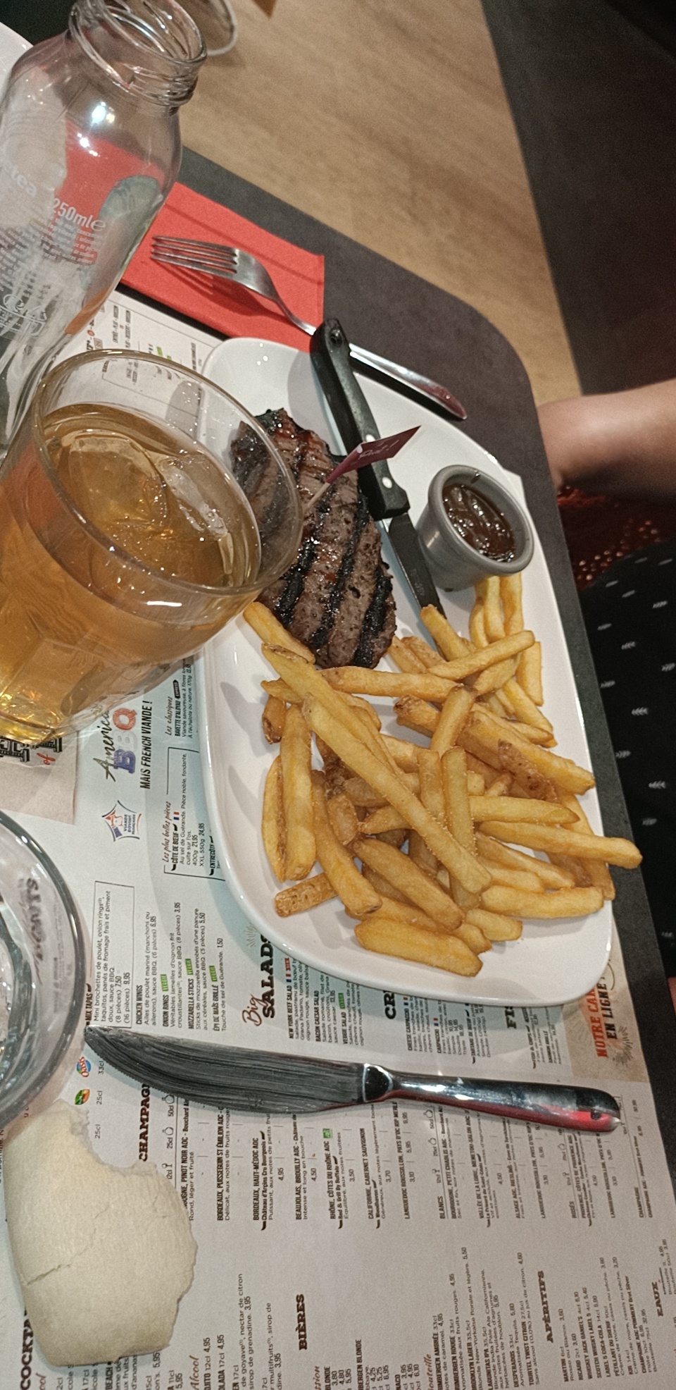 Mon dernier passage laissait un avis très négatif sur l’expérience vécue mais ! De nouveau de retour dans ce restaurant un samedi soir pour 2 personnes sans réservation. Très bien accueilli par toute l’équipe. Mention spéciale à notre serveuse Aline qui a était top du début jusqu’à la fin. La carte est variée viande/Veggie/spécialité Les BBQ Ribs XXL était top 👍🏻 Et le dessert Maxi chou a l’américaine parfait ! Juste la quantité qu’il faut c’était un délice 👌 Nous n’avons pas trop attendu entre les plats, c’était très bien ! J’ai eu raison d’y retourner 😎🙂