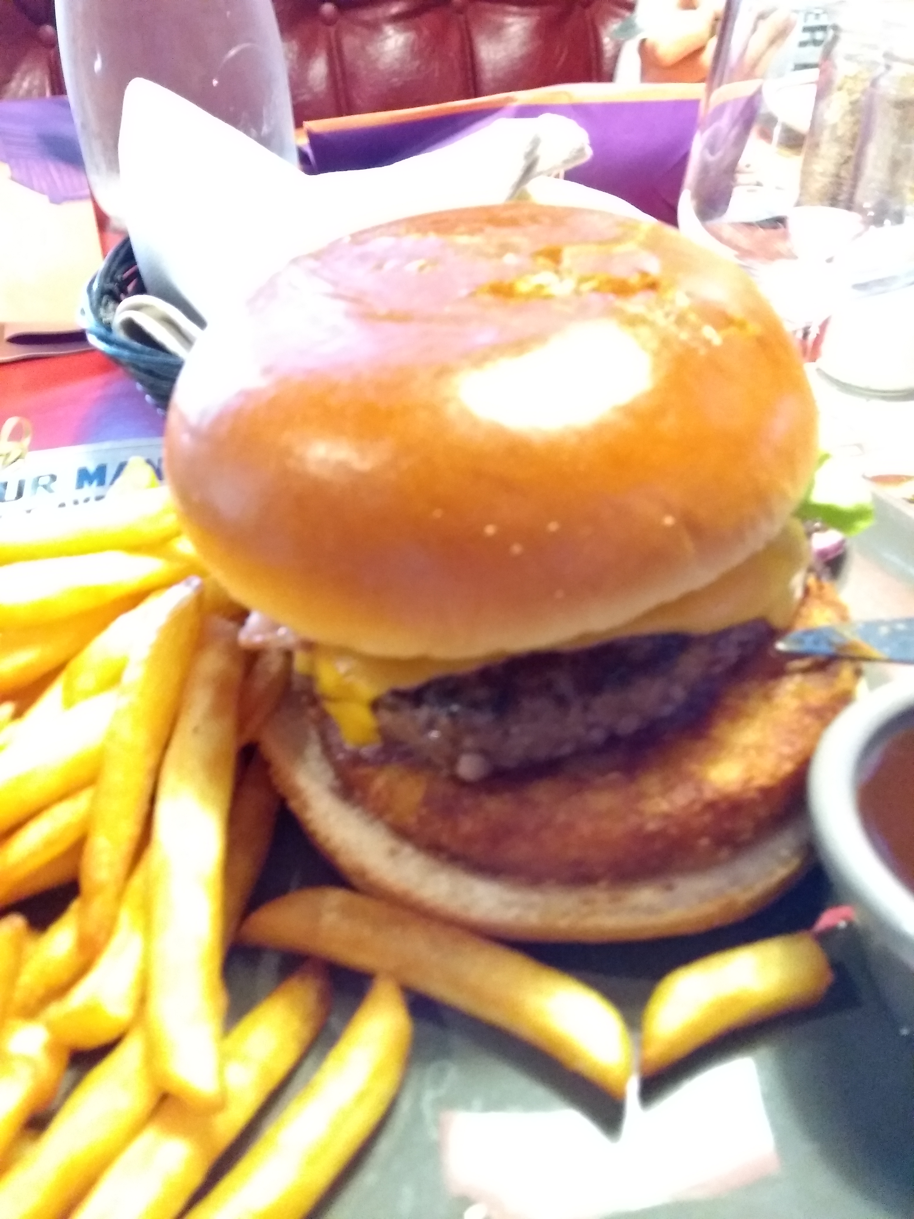 Très bon service et rapide. Serveuse agréable. Nous regrettons seulement que les entrecôtes était nerveuses. Le burger au poulet manque un peu de sauce. Sinon tout le reste était bien.