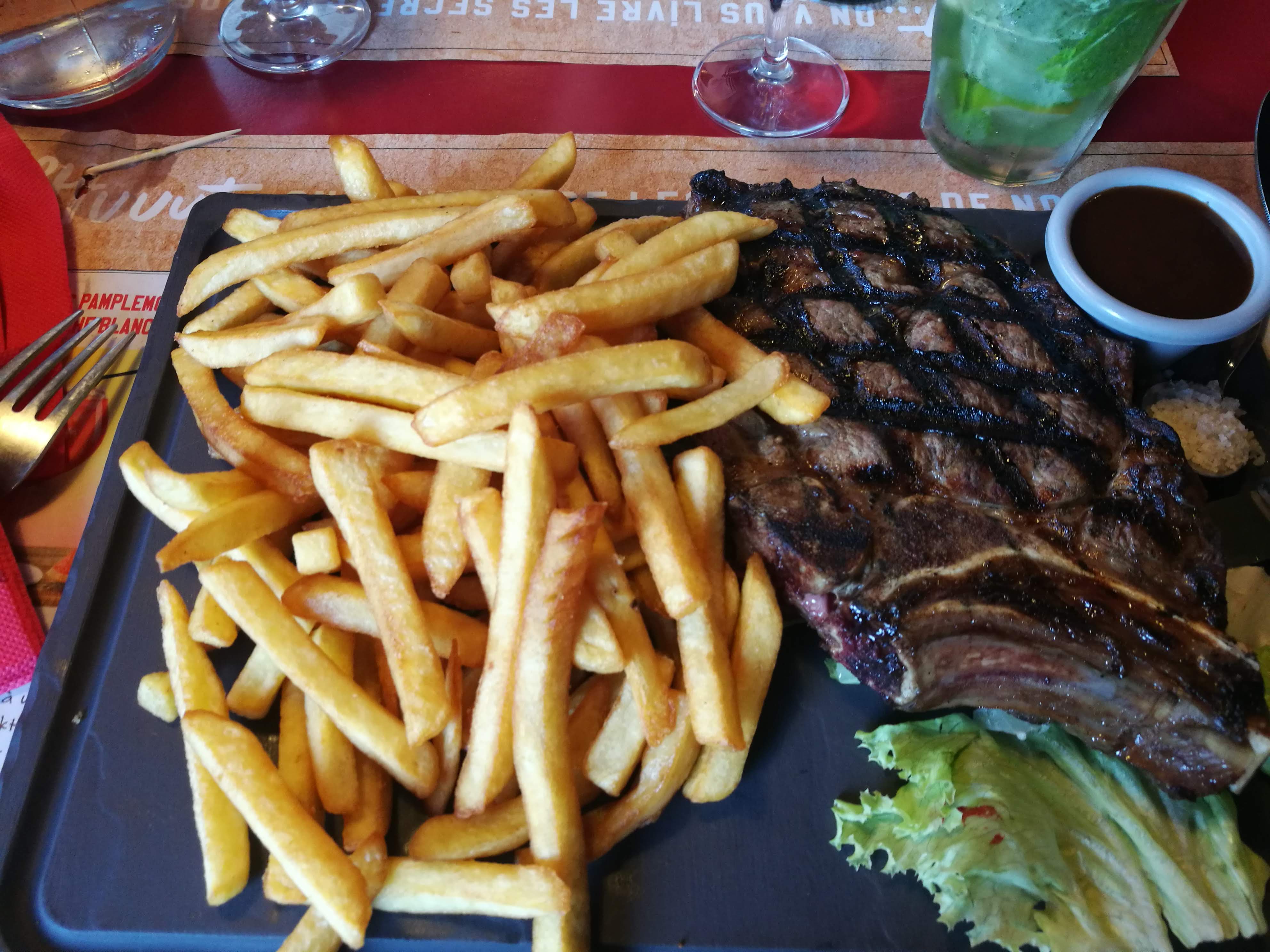 Accueil parfait malgré la longue attente pour avoir une table (dimanche à 13h) Pour ma part, ma côte de bœuf avait trop le goût carbonisé, je me suis régalé qu'avec les extrémités qui n'ont pas été trop en contact avec la grille lors de la cuisson. Les frites était très bonnes. Pour madame, un fish and chips trop gras et un riz trop fade.