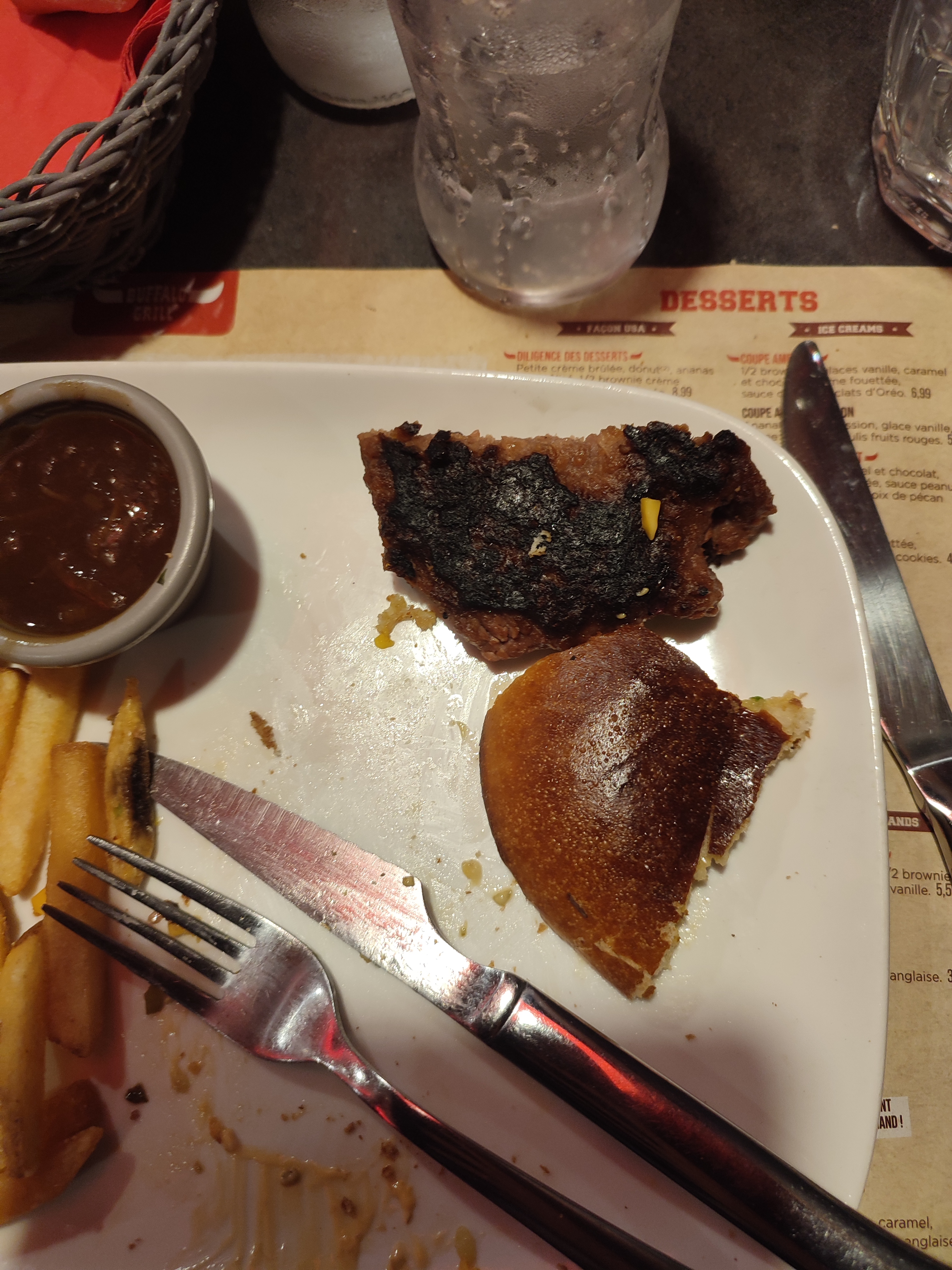 Honnêtement la cuisine, c'est du Buffalo : quantité correct, qualité également. Par contre le service extrêmement mauvais... C'est la foire a tout les étages, fin de service = équipe en roue libre. Une table d'employé venu manger en civile sur leurs jour de repos derrière nous, du coup le serveur a passé plus de temps a leurs table qu'avec nous. Je peut vous donner leurs programmes si vous le souhaitez, vue que j'ai passé tout mon repas a les entendre déblatérer leurs vie, a grand coup de familiarité. Pain et eau non renouvelés. Commande de 2 crèmes brûlées, bizarrement rupture juste pour nous (puisque la table d'employé derrière en ont eu, eux). De plus erreur sur la note, puisque les boissons ont été facturés hors menu (erreur rectifié a l'encaissement). Je vous passerai également les employés assis sur les tables, en train de grignoter au moment de l'encaissement. Le service manque d'encadrement, il serait temps de serrer la vis temps que le restaurant est ouvert au client. De la rigueur de la part du responsable serait plus que souhaitable.