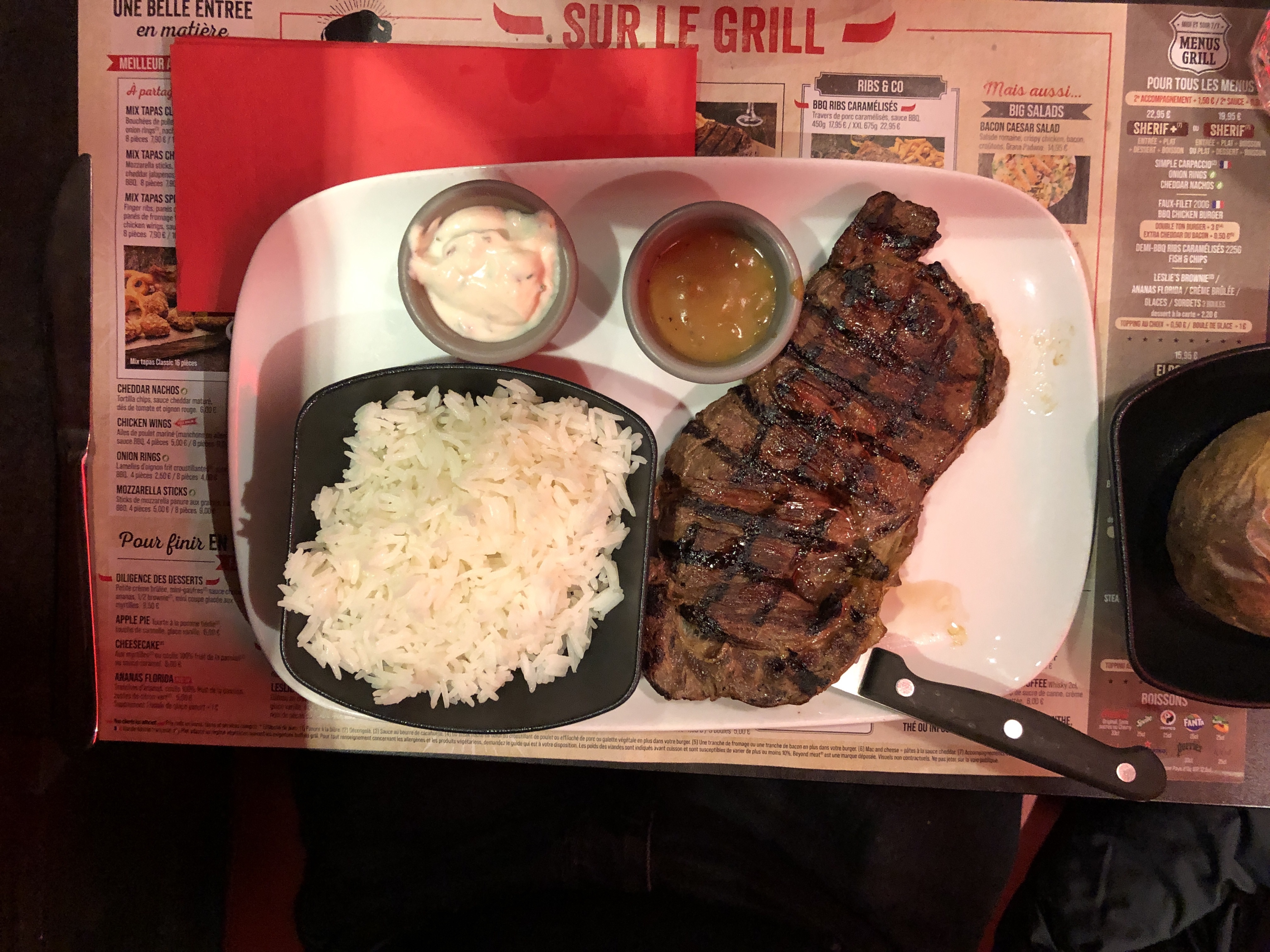 Dommage la viande était froide, la pomme de terre arrive presque au dessert, Sinon service pas trop mal et assez rapide Déçue il n'y a plus la jolie déco western