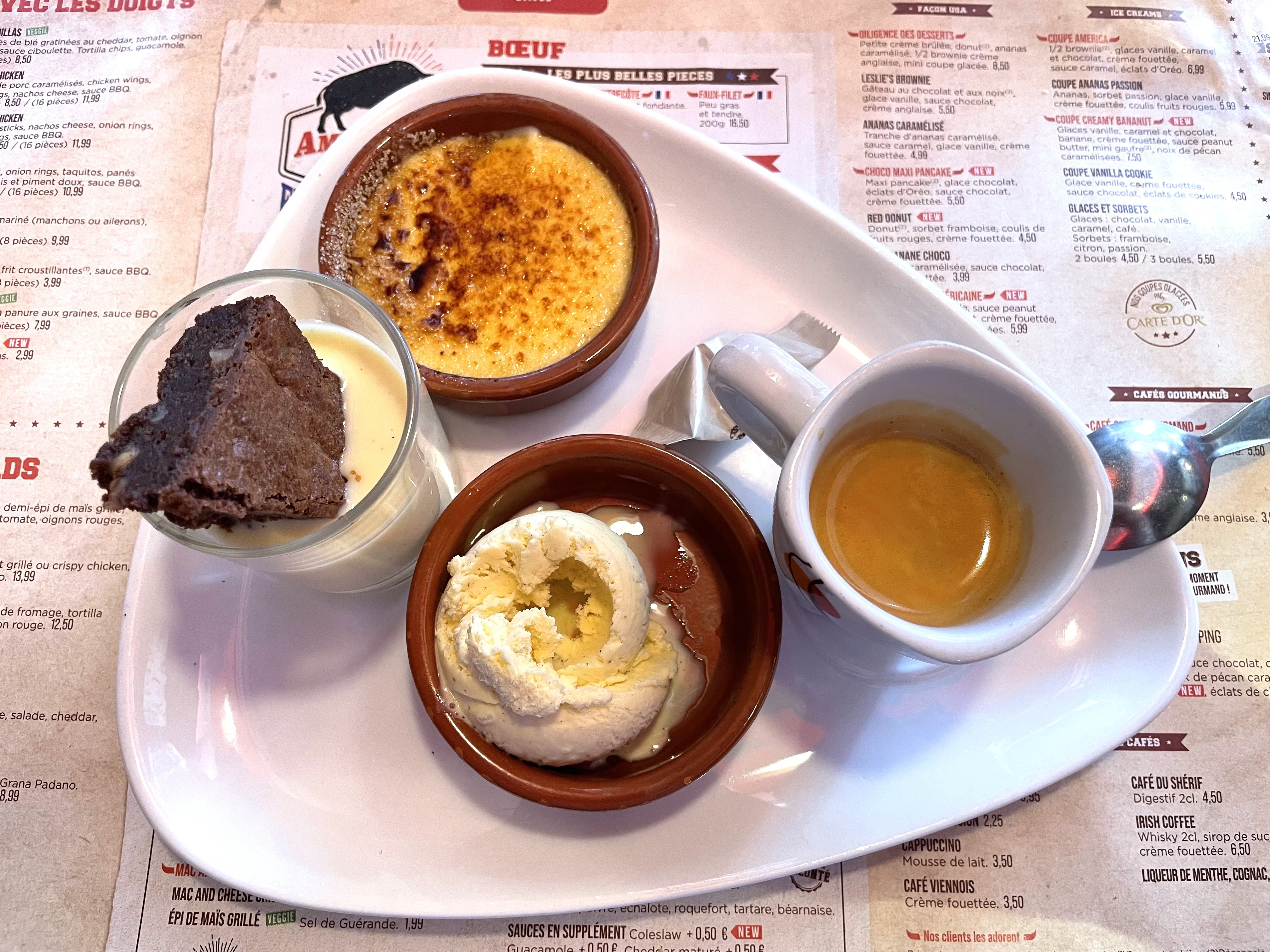 Petit moment sympa. La serveuse que nous avons eu était très gentille. Comme d'habitude la petite salade d'accueil qui aide à patienter. Burger copieux et entrecôte sauce roquefort délicieuse. Un café gourmand bon rapport qualité prix qui permet de goûter certains desserts. Au top