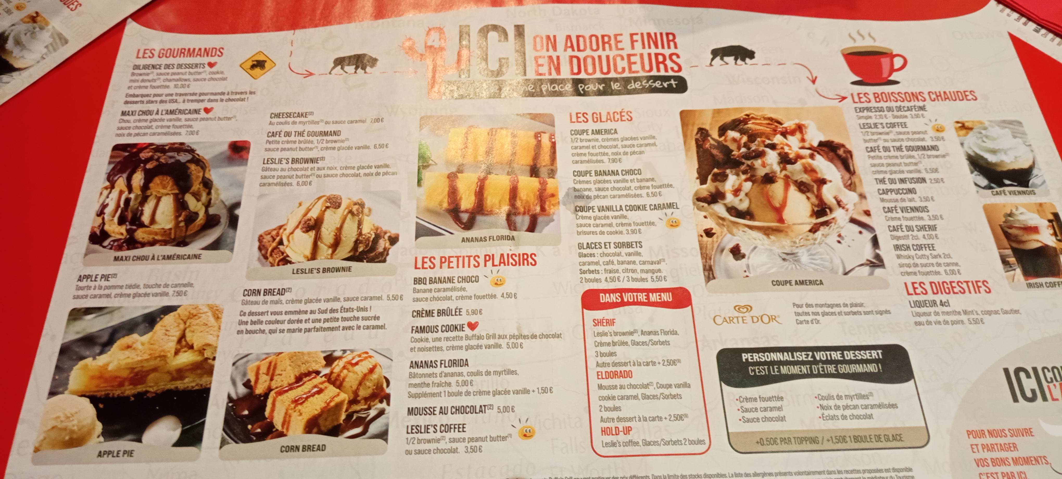 Cela fait 10 ans que nous ne sommes pas retournés dans un Buffalo Grill et j'avoue avoir déçu. On sent que le côté Buffalo n'est plus assumé. Seul reste la couleur rouge. La carte est, pour moi, très fouillis on y trouve beaucoup de choses. Trop de plats. Une serveuse qui, au début, vient nous voir très souvent... et après on sent que son travail est difficile et ne lui plaît pas. Les plats rendent vraiment mieux en photos que dans l'assiette. Déçu par la présentation qui n'est pas soignée. Bâclée. Bref, seule la barbe à papa a plu à mon fils. Je ne pense pas que nous reviendrons.