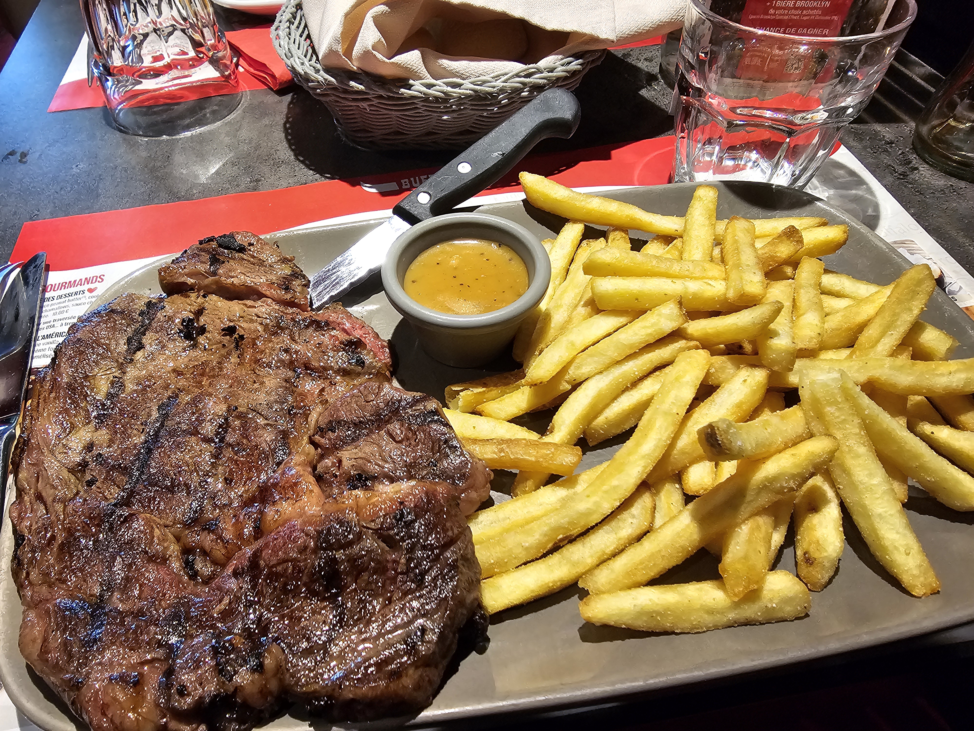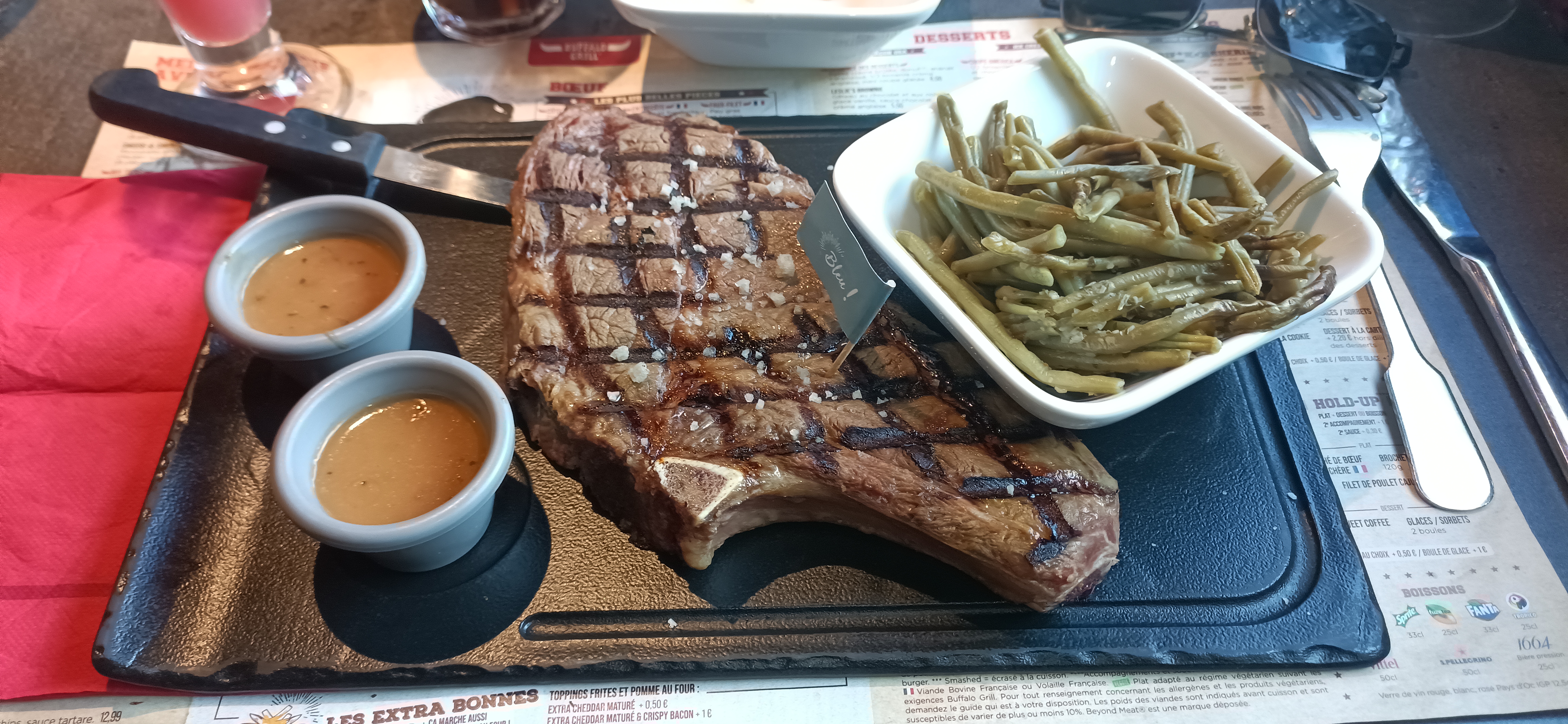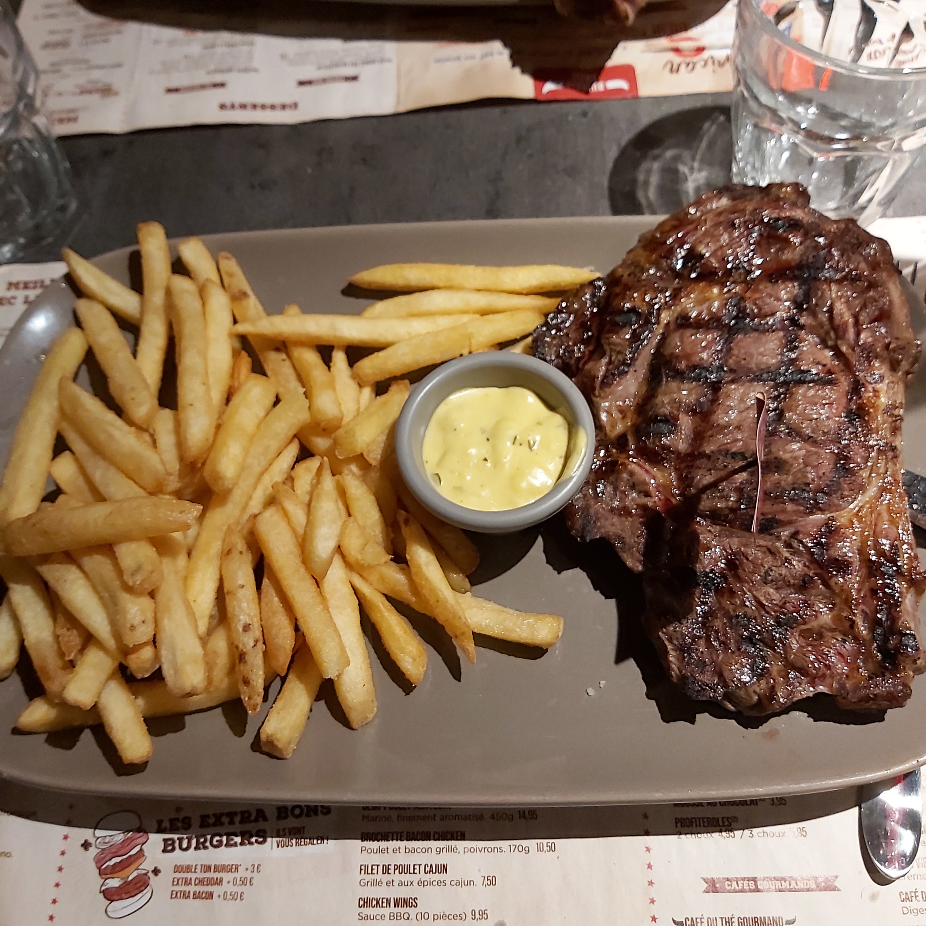 Accueil agréable, serveuse et serveur au top. Un peu chaud mais en salle mais la clim ne devait pas être en fonction. 4/5 car cela fait un moment que je n'y suis pas allé et malheureusement il ne propose plus que du boeuf et du poulet. À quand le retour de la viande de bison ou d'autre. Leurs menus sont satisfaisants mais la côte de boeuf xxl un peut light malgré ces 550g en tout cas pour moi. Il serait intéressant de renouveler la gamme de couteau à viande, la prochaine fois je n'oublierai pas le mien.