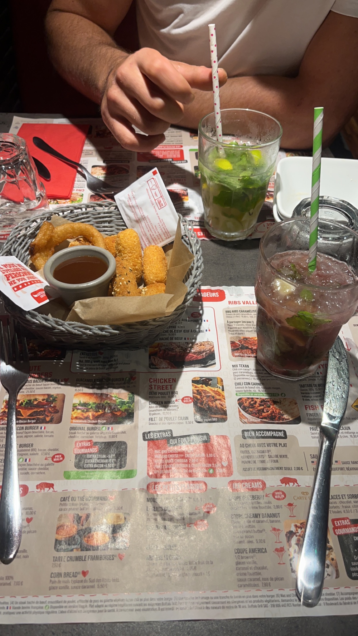 La viande avait un goût de brûlé On avait pris une entrecôte c'était de la carne malgré le couteau à steak on a eu du mal à la couper pour le prix très déçus. Pour le mojito j'ai eu l'impression de boire de l'eau citronné je pense qu'il n'y avait pas où peu de rhum. Nous n'y retournerons pas.