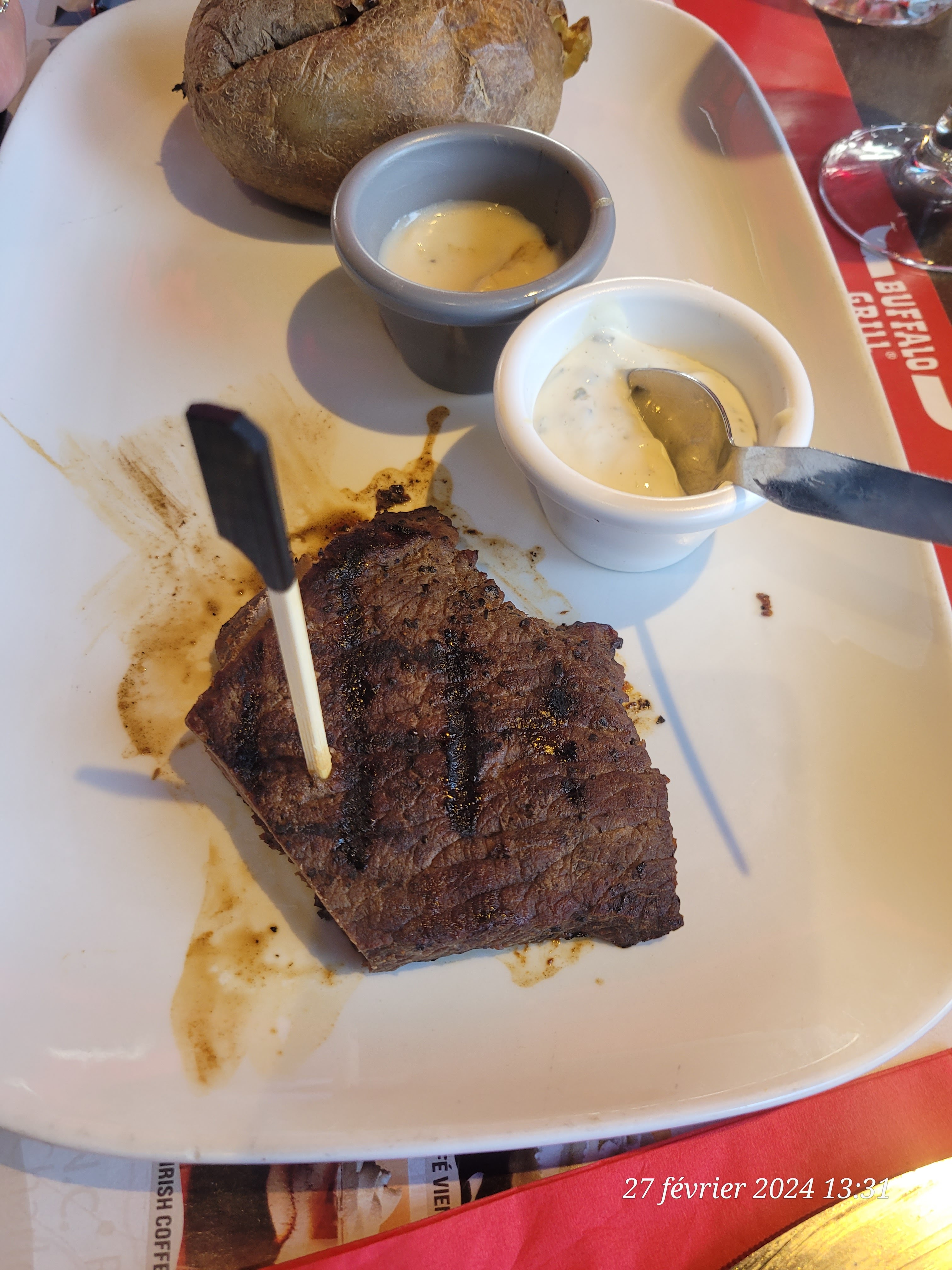 Hey bah oui super déçu... La qualité..bof.la propreté je n'en parle même pas.. déçu déçu... J'ai commandé ce jour un tournedos avec ses pommes de terre au four.. bah je n'ai eu qu'une patate avec sa petite cuillère planté dedans pourquoi je sais pas... Vous mangez vous... Votre patate avec une cuillère 🤔 bref en plus cher sans le dessert 64 € En plus le parking est inondé de caravanes... L'extérieur laisse a désirer très sale..