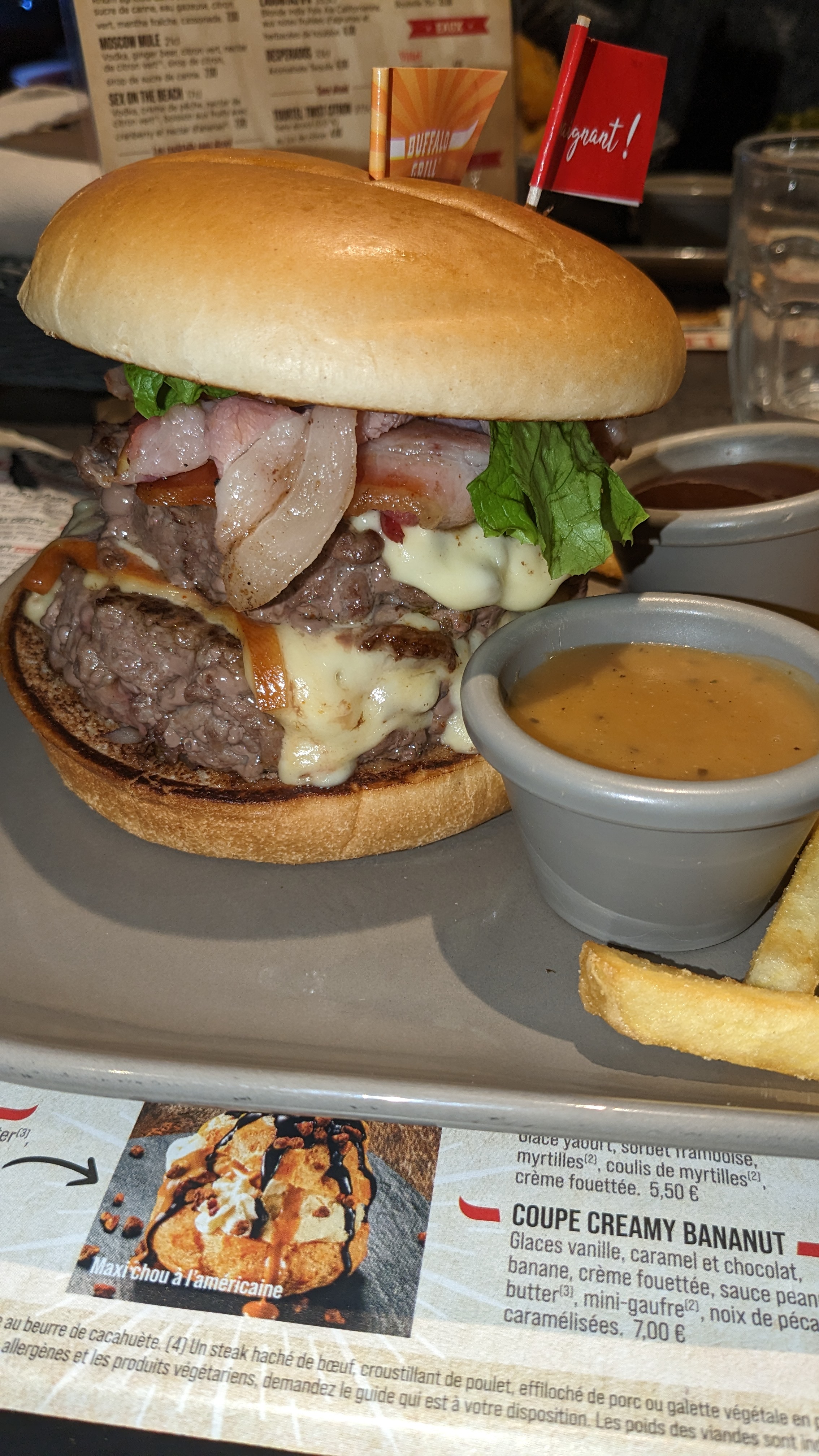 Restaurant Buffalo comme tout les autres. L'attente pour être servi à été longue, certains arrivés après nous ont été servis largement avant nous. Il a fallu le signaler pour être enfin servi (35min entre la commande et le plat servi). Le reste s'est bien déroulé. Lors de l'addition le patron s'est excusé du couac, et nous propose 4 apéritif offert la prochaine fois. Nous avons décliné car nous n'étions pas dans notre région. Rien que pour le geste spontanée je remonte à 4 étoiles. En photo le dessert menu enfant