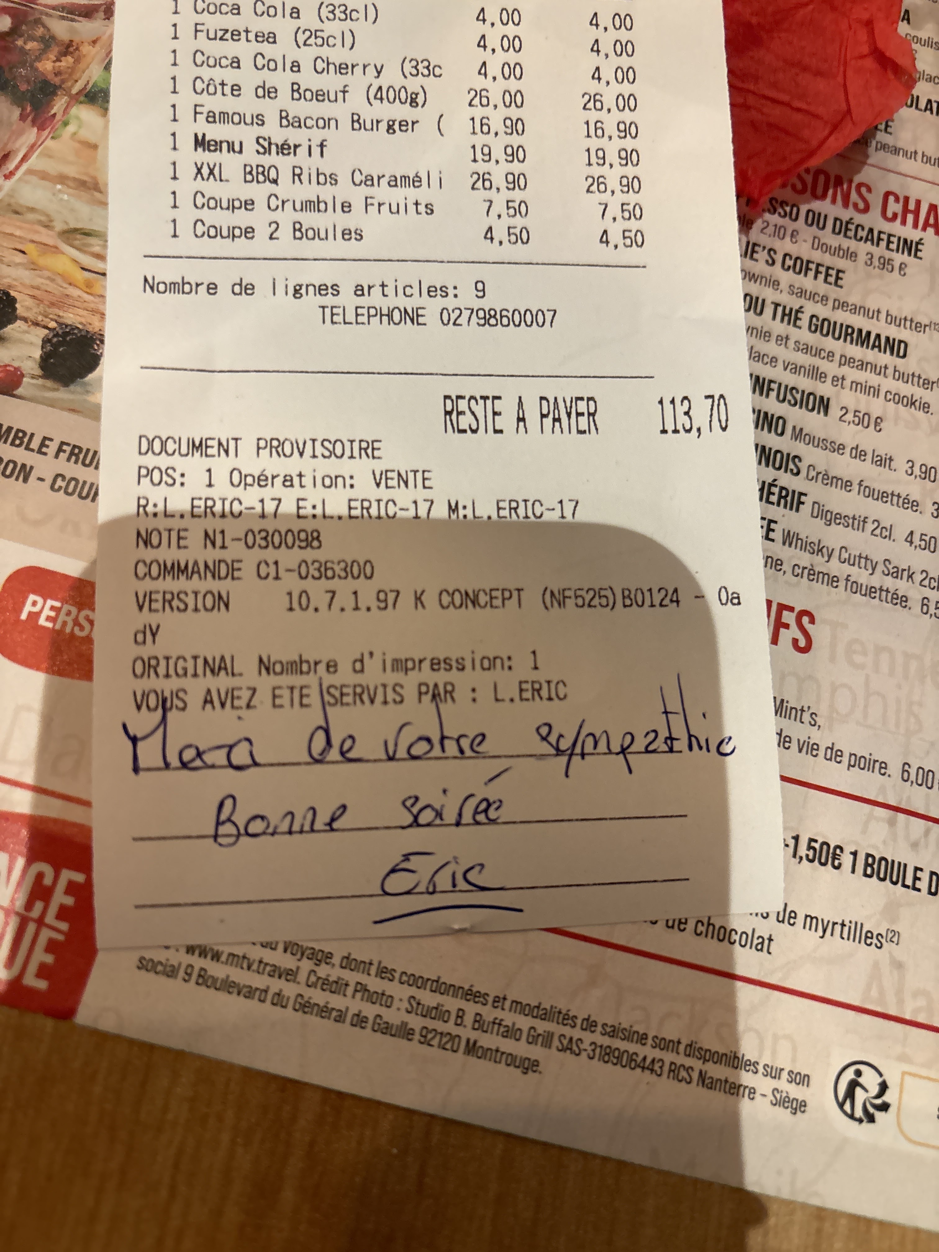 Petit retour sur notre expérience au restaurant Buffalo Grill. Service rapide, repas bon, serveuse excellente (Diane) merci à elle pour le petit mot sur le ticket de caisse . Prix correct. Nous reviendrons sans hésiter. 👌👌🥳