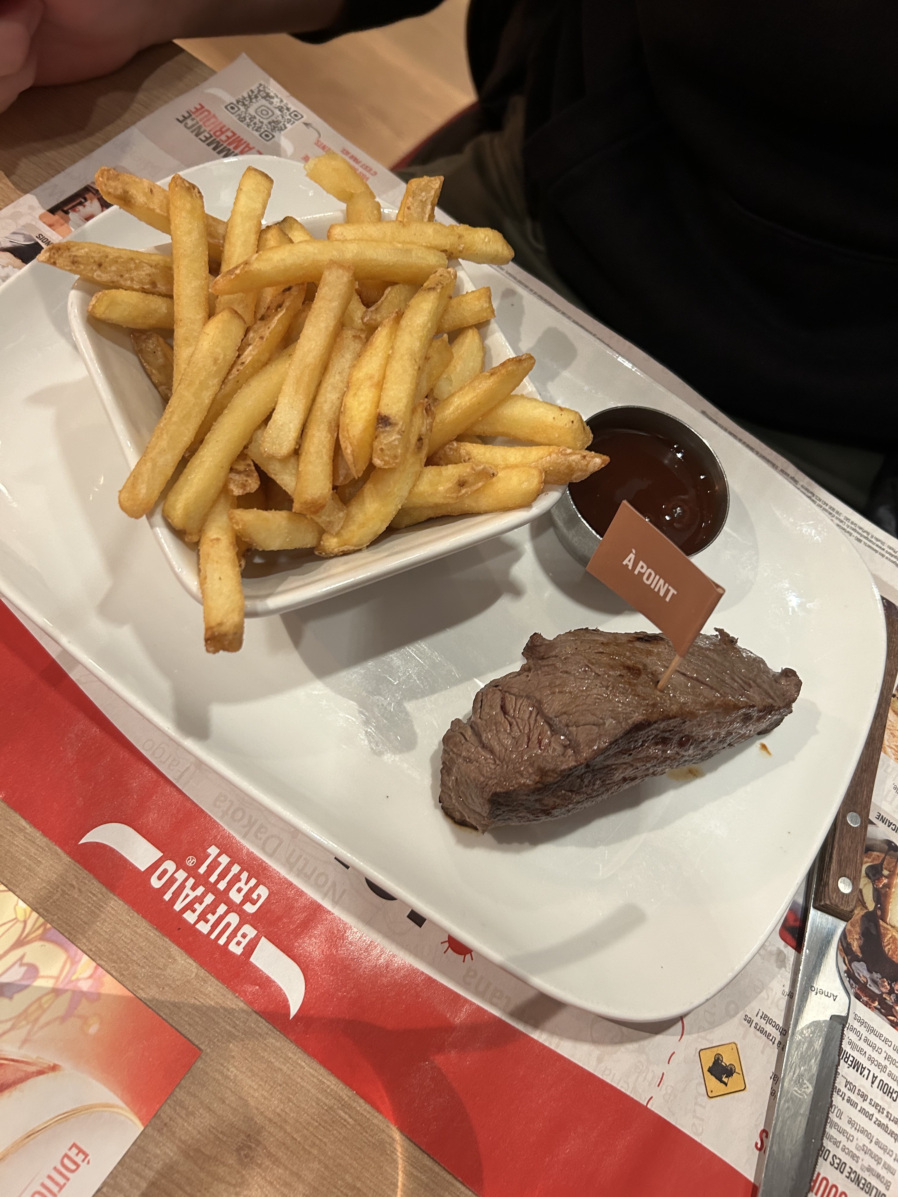 Dîner vendredi soir. Excellent accueil. À l'écoute du client. Viande délicieuse que je recommande vivement. Serveuse adorable et disponible et très souriante, Ingrid 🫠. Nous sommes très satisfaits de ce petit moment passé au Buffalo grill. Merci à toute l'équipe.