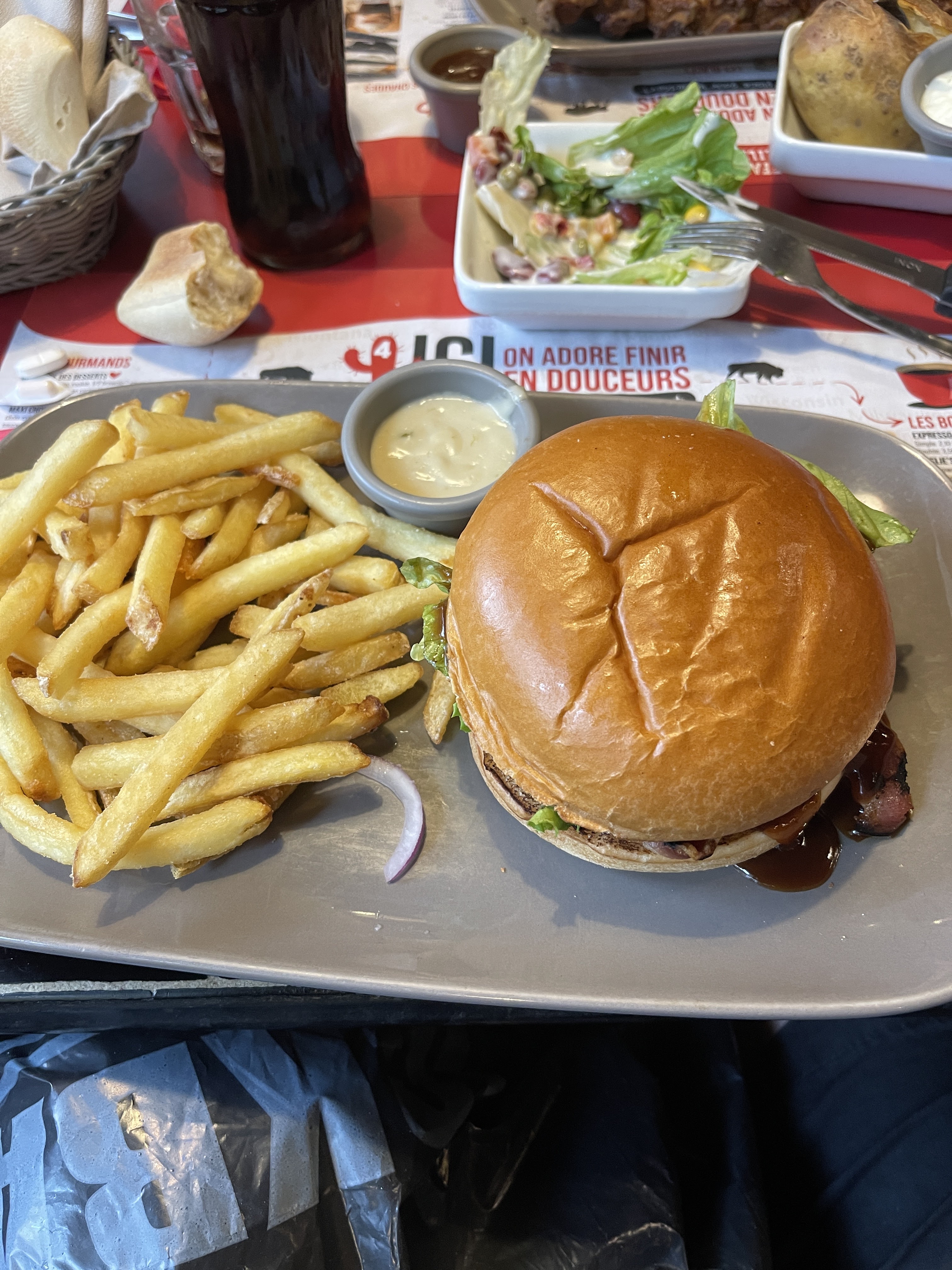 Nous sommes passées prendre au drive notre repas. Je n avais jamais été mécontente or les burgers étaient secs et sans salade et autres légumes. J ai demandé un supplément bacon pour 2 portions qui n y étaient pas. Une très mauvaise surprise. Je n ai pas pensé à faire des photos. Je le ferai la prochaine fois si mes petits enfants veulent y retourner J hésite