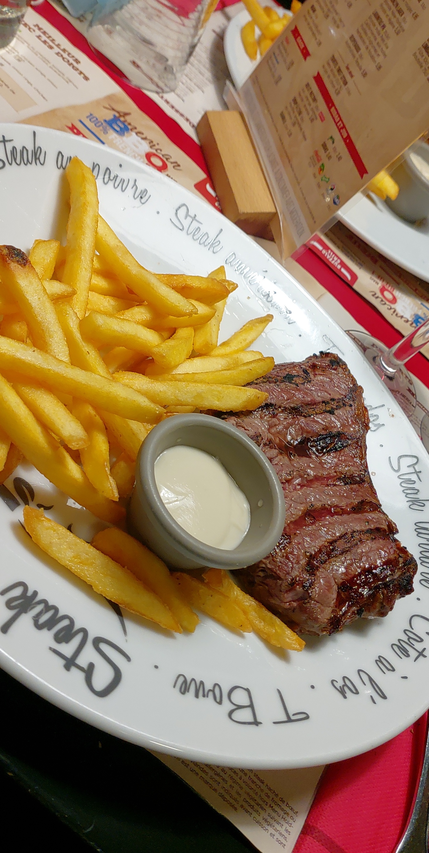 On passe commande solo, alors qu'il y a une serveuse et son chef passe plusieurs fois alors que l'on doit passer commande seul qu'elle est le principe de ce fonctionnement incompréhensible car il y a du personnel ,petite portion de frites pour le tarif assez élevé pour un restaurant de ce standing