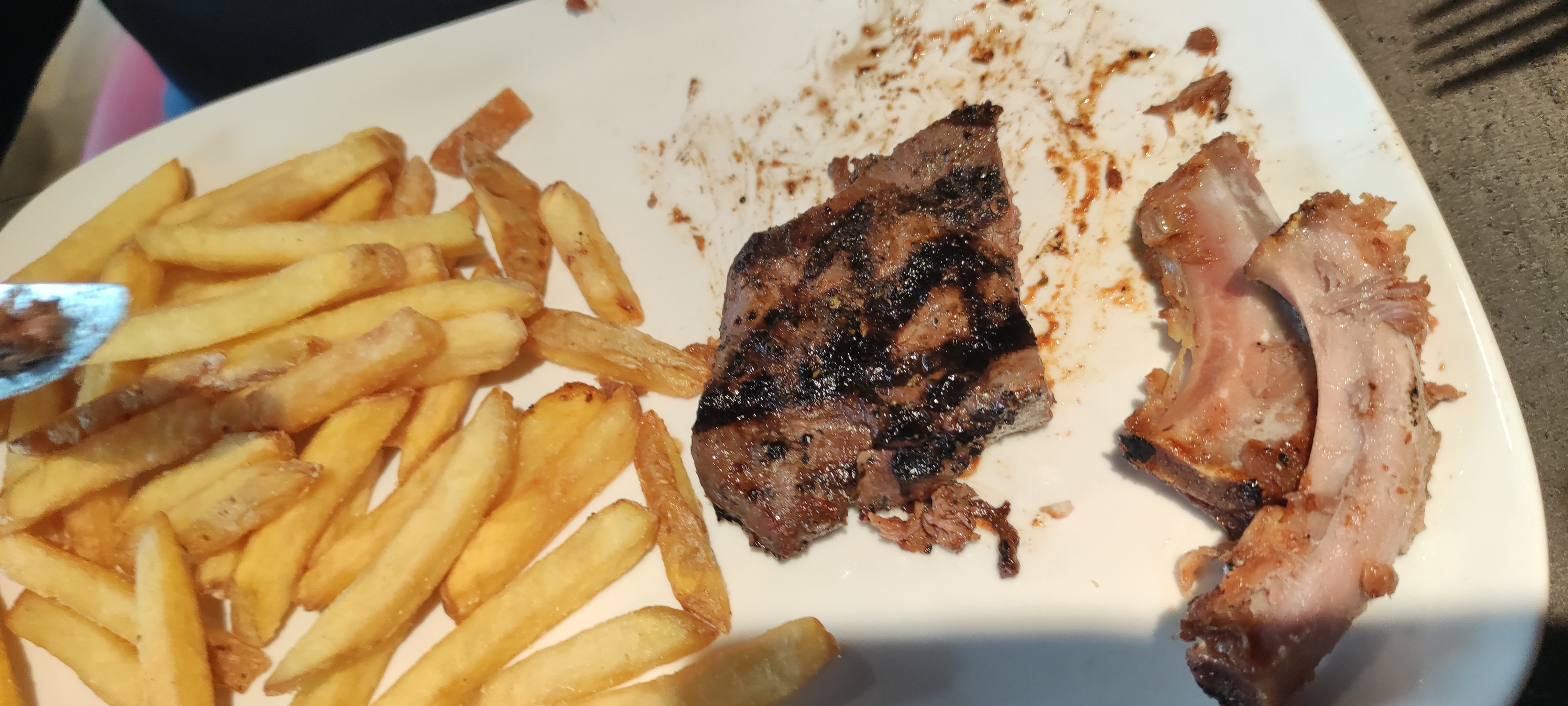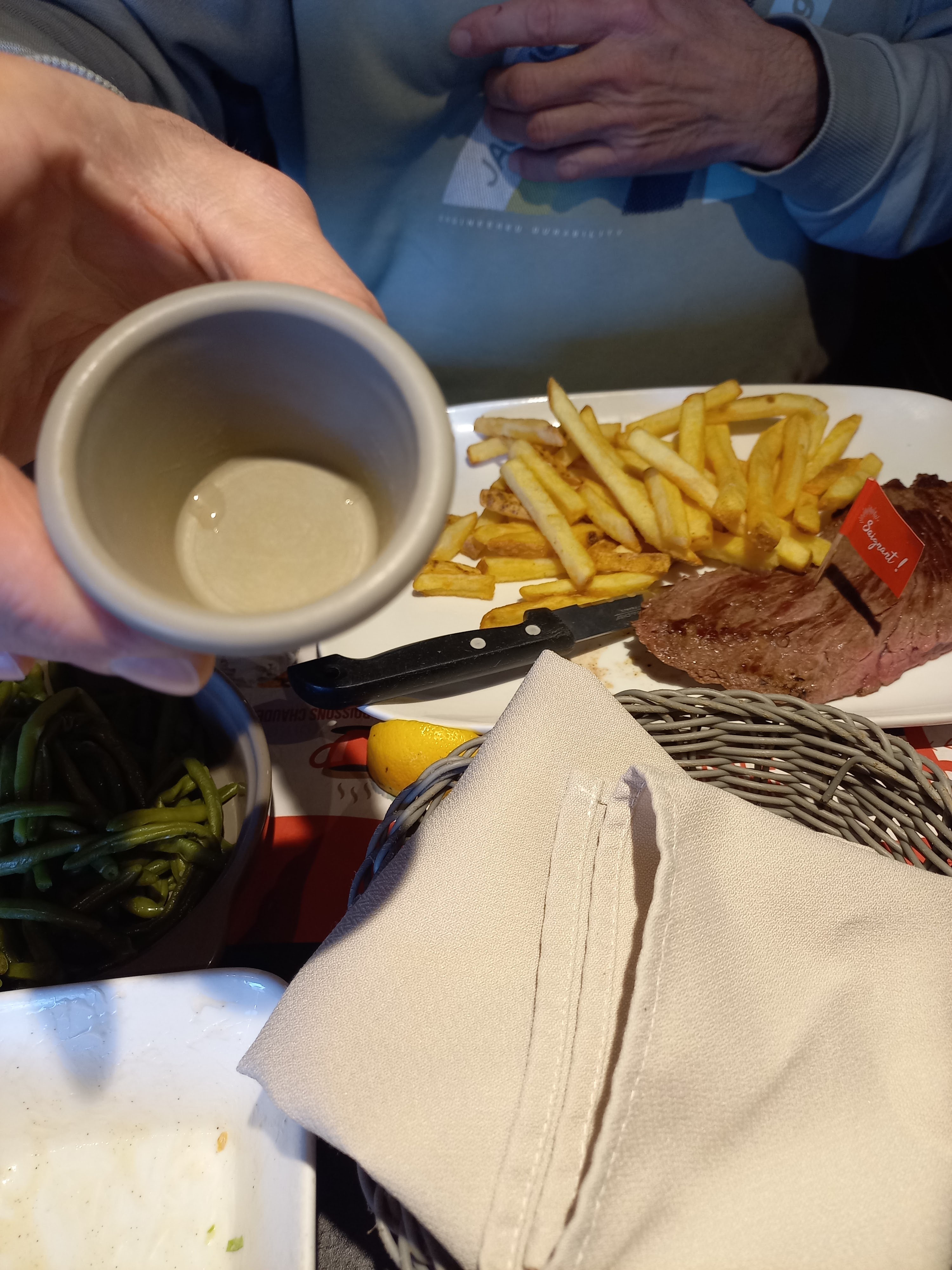 Plat servit une fois que mon fils avait terminé le sien, 21euros pour une entrecôte franchement pas très bonne, frites blanches et pas cuite. À fuir