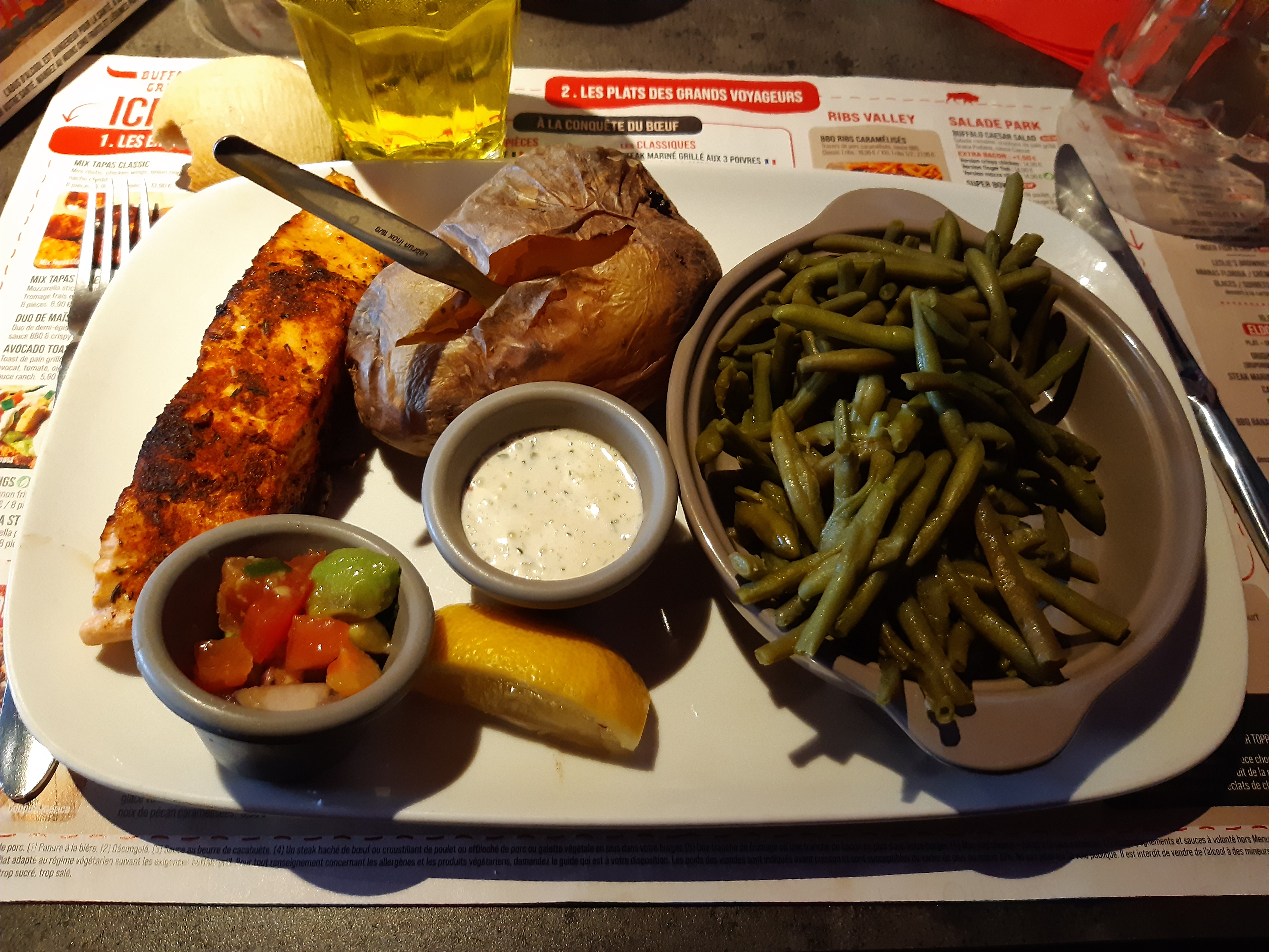 A l image des autres Buffalo, repas de un bon rapport qualité prix, sauf le supplément ketchup, la serveuse agréable. Dommage que les fauteuils soient usés, l entretien des locaux est a revoir, interrupteur des toilettes qui sont déboités,