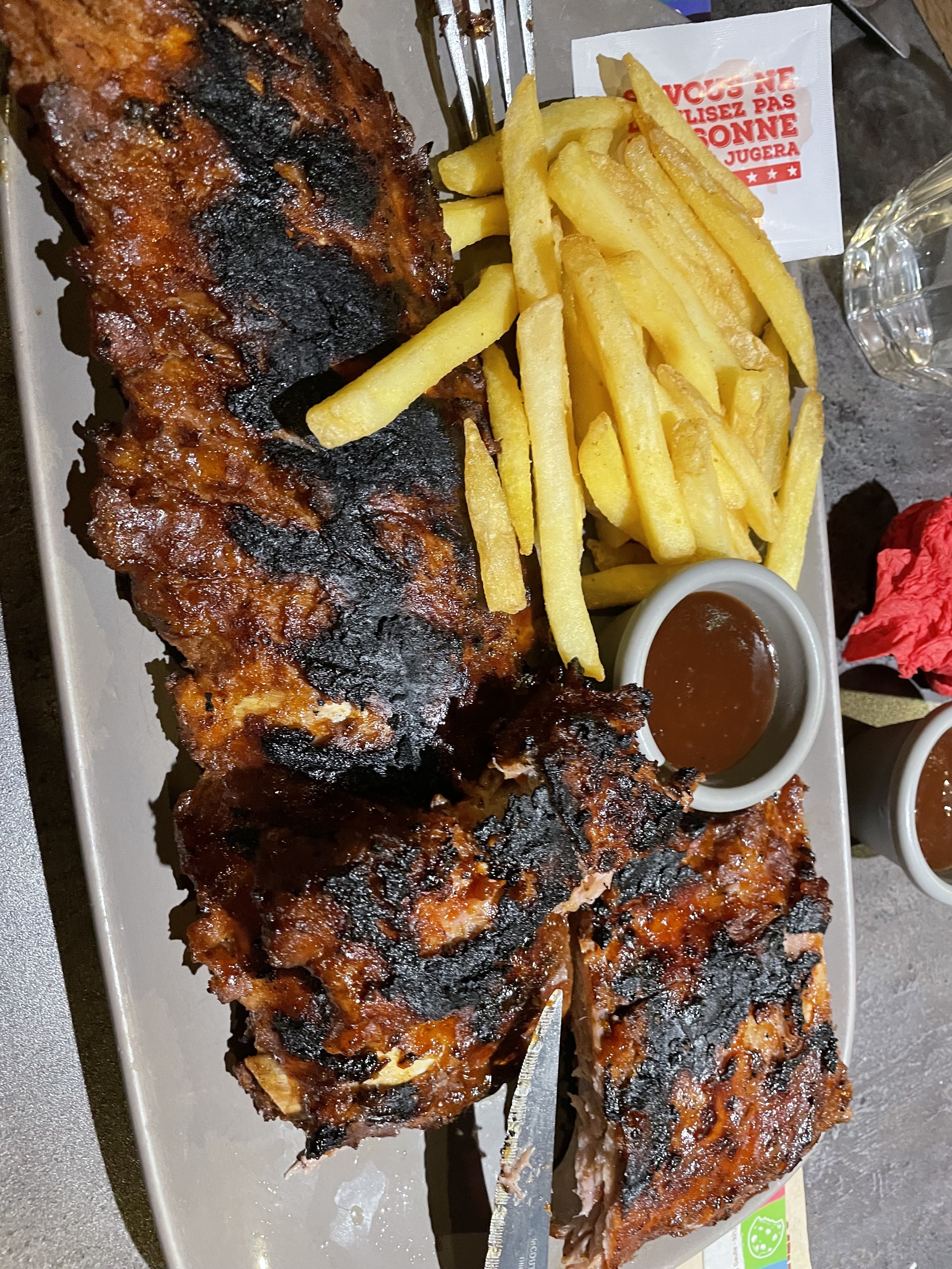 Excellent repas. Nous avons prit un Mix du trappeur. La viande était excellente, celle des ribs se détachait de l'os sans problème et le poulet fondant. En dessert nous avons prit un maxi chou ruby, un vrai régal. La serveuse Morgane était souriante et serviable. Service rapide et efficace Je recommande sans hésiter.