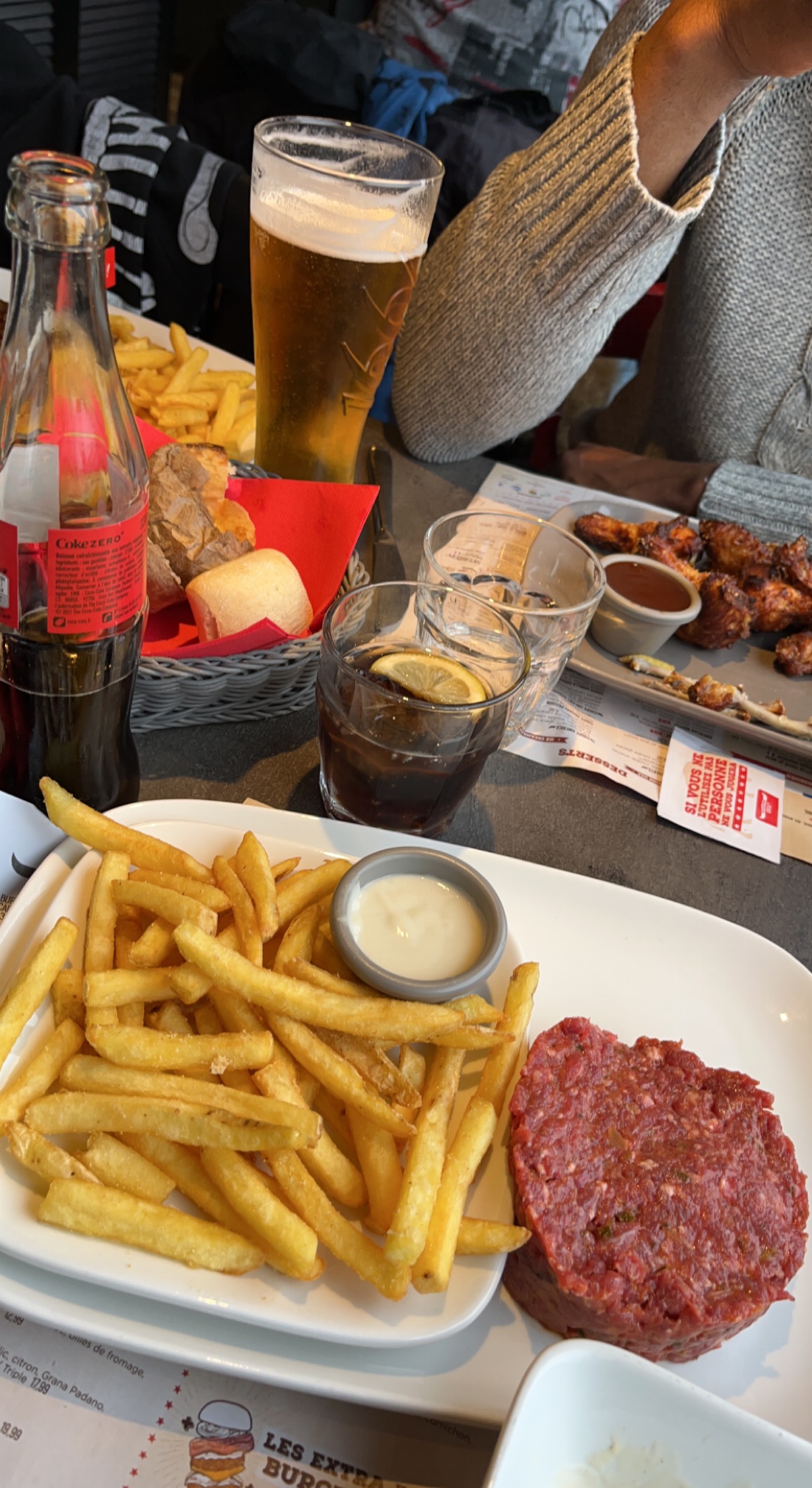 Nous sommes arrivé à 21h05. Nous avons ensuite pu être attablé à 21h20. Il n’y avait que deux groupes devant nous mais des affiches montrent qu’ils sont apparemment en sous effectif, d’où l’attente. L’entrée est arrivé à 22h05 et le plat principal à 22h25. Arrivé à table, un QR code est donné afin de commander nos plats (en mode uber eat). C’est assez lent mais comme dit plus haut, ils sont en sous effectif. Le repas était excellent par contre pour les prix, c’est pas trop donné 😁 D’ailleurs, demandez leur d’autres portions de frites en avance ainsi que des sauces. Les portions ne sont pas énorme 😉