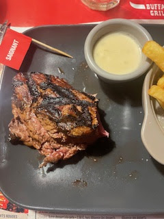 La dernière fois notre commande avait été oubliée avec les roulement de service du coup attente 1h30 nous nous étions promis de ne jamais revenir ! Cette fois ci de l’entrée au plat rien ne ressemblait à une qualité restaurant encore une grande déception La dernière cette fois ci De l’accueil au placement au service n’en parlons pas bref ce qui faisait la renommée du Buffalo est vraiment finie Ce qui veut dire essayez le si vous voulez être déçu vous serez servis à la hauteur de cette enseigne