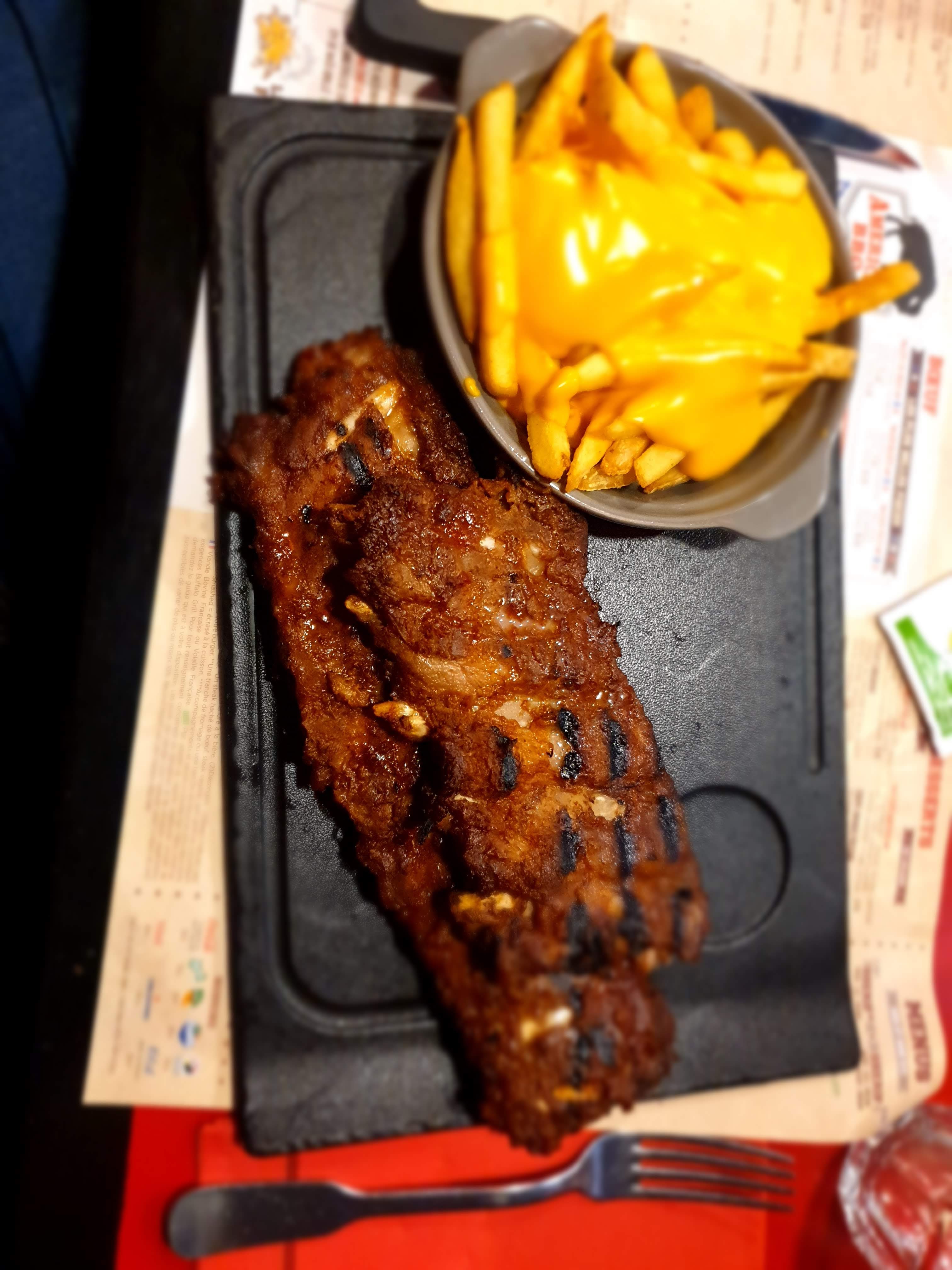 Arrivée tardive, restaurant bondé. Mais de la place pour toute la famille. Bien. Tout est bien organisé. Des salades d'accueil offertes. Les plats ont été dévorés. Signe qu'ils étaient au goût des convives. Personnellement, les ribs étaient parfaites. Bon café et hop. Bémols : - l'attente. Pour avoir une carafe d'eau ou obtenir le maïs grillé oublié... A revoir. - le bruit. Un brouhaha permanent et très fatiguant. Des voisins très bruyants... Mais c'est le lot de ce genre de restaurants. Fait donc son office. Et des heureux.