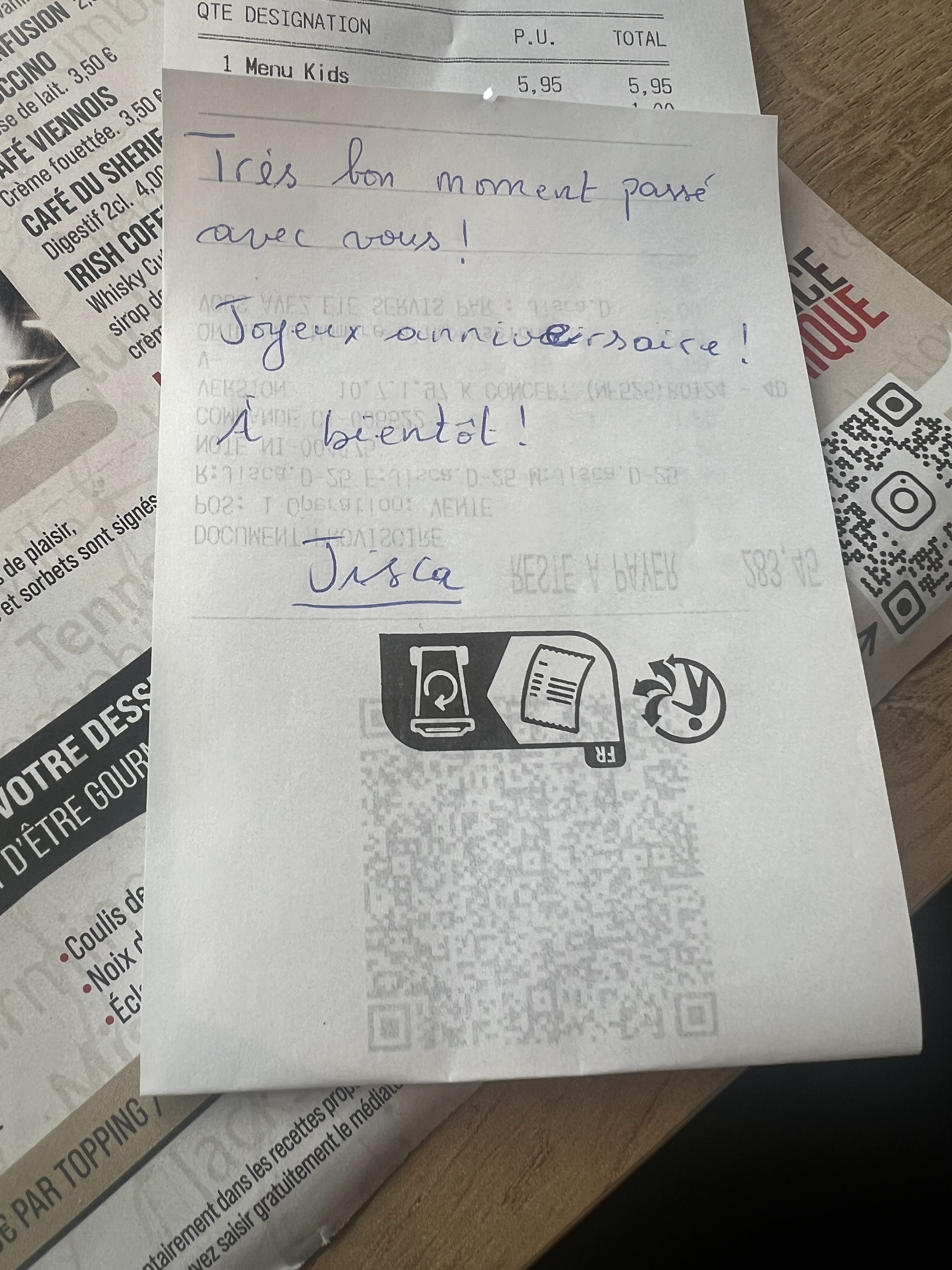 Nous avons passé une agréable soirée et nous avons bien mangé. J'ai trouvé touchant le petit mot (correctement) manuscrit par la jeune serveuse, dans lequel elle déclarait le plaisir de nous avoir servi. Merci, nous reviendrons sûrement.