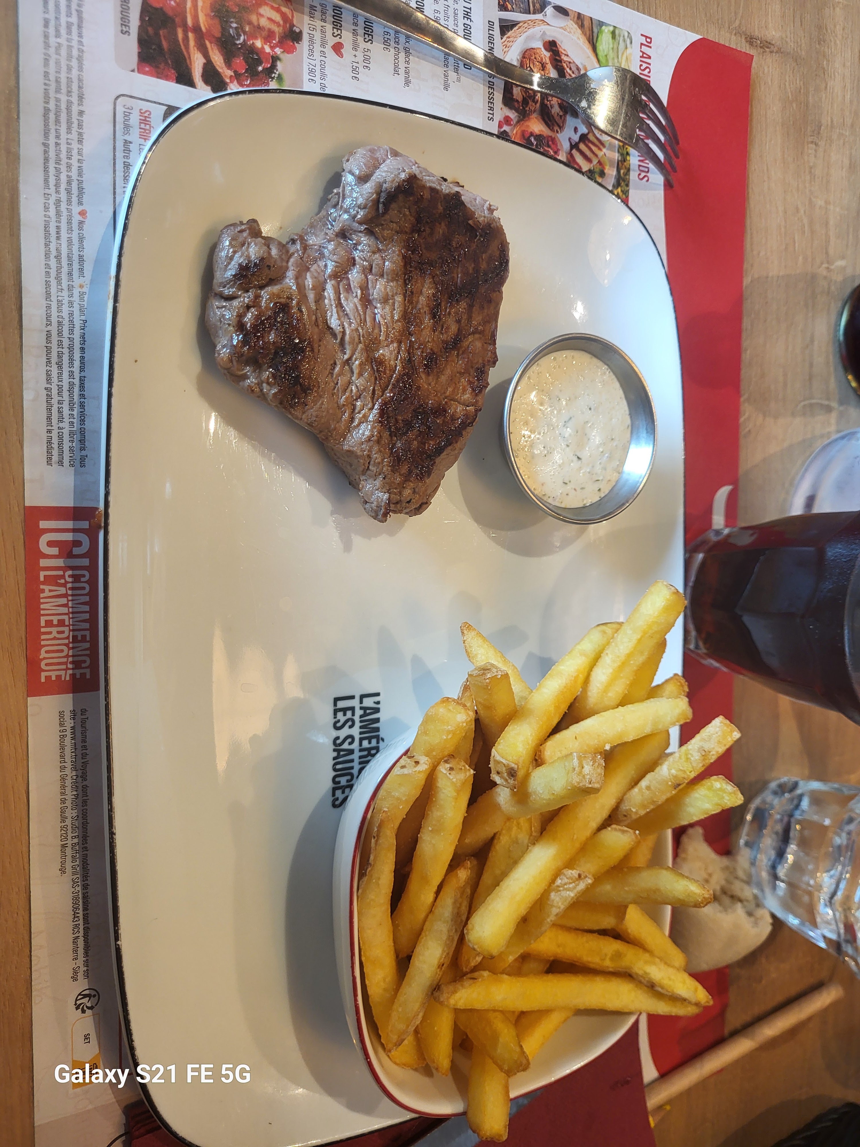 Viande savoureuse, cuisson parfaite Frites également savoureuse, pas grasse
